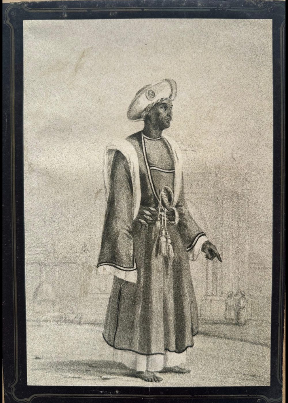This finely executed 19th-century monochrome print portrays a South Indian court attendant or nobleman standing with a poised and dignified air. He is dressed in elaborate traditional robes with broad decorative borders and a distinctive turban, indicating his high status or role in a royal or noble household. The rope with tassels draped across his chest may signify ceremonial or administrative duties. His gesture and attentive expression suggest he is in service or observation within a palace setting, subtly depicted in the background. A classic example of colonial-era portraiture, this print captures the attire, posture, and courtly presence characteristic of Indian aristocracy during the period.