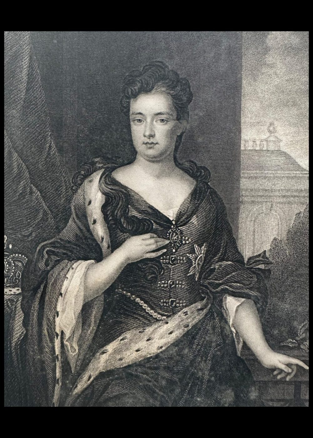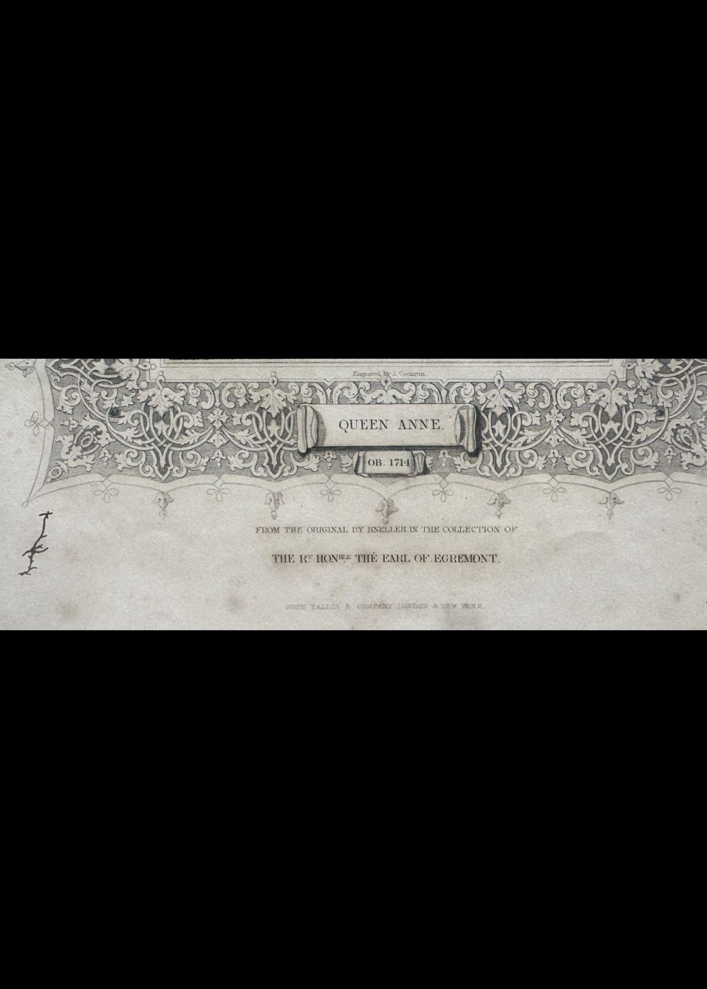 This finely detailed 19th-century engraving depicts Queen Anne of Great Britain, elegantly posed in regal attire adorned with a crown and royal sash. Set within an ornate floral border featuring the royal coat of arms, the portrait captures the dignity and solemnity of her reign. The engraving is based on the original painting in the collection of the Right Honourable the Earl of Egremont and was published by John Tallis & Company, London & New York.
