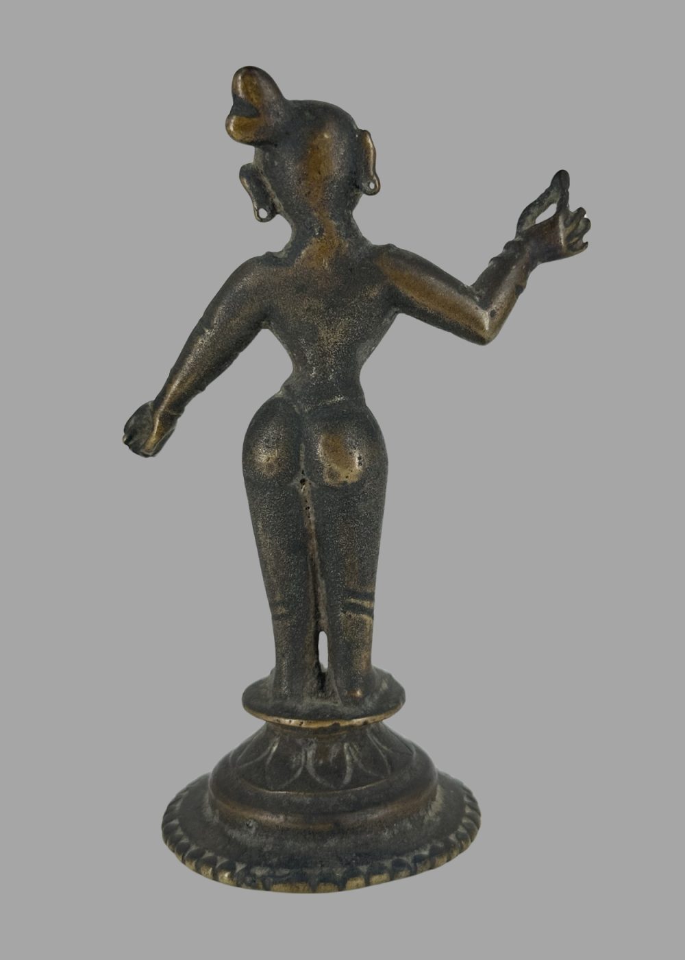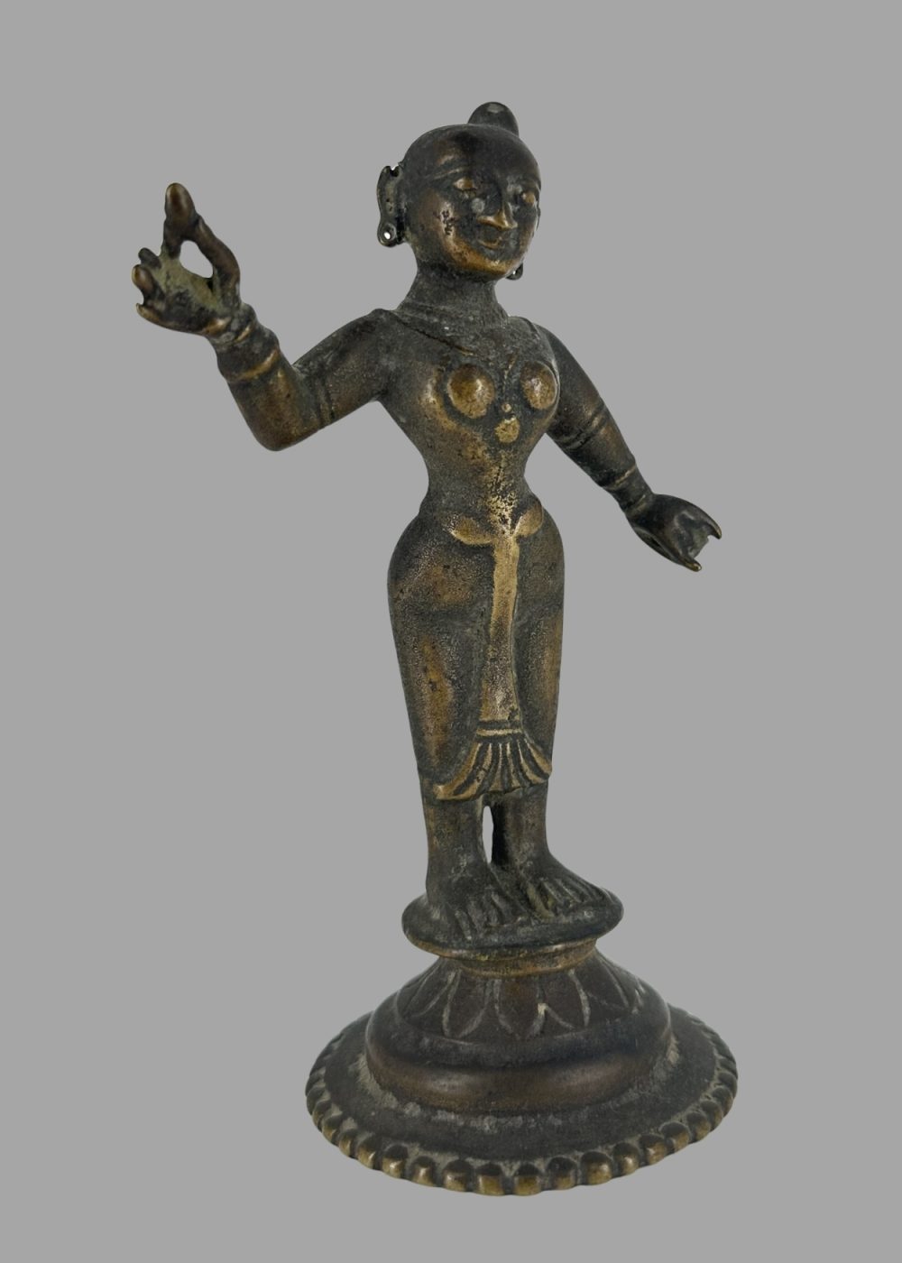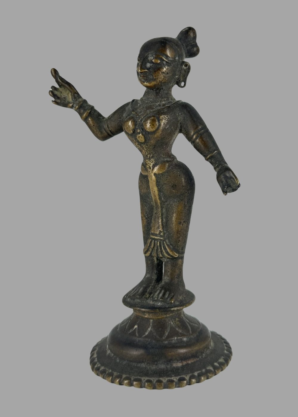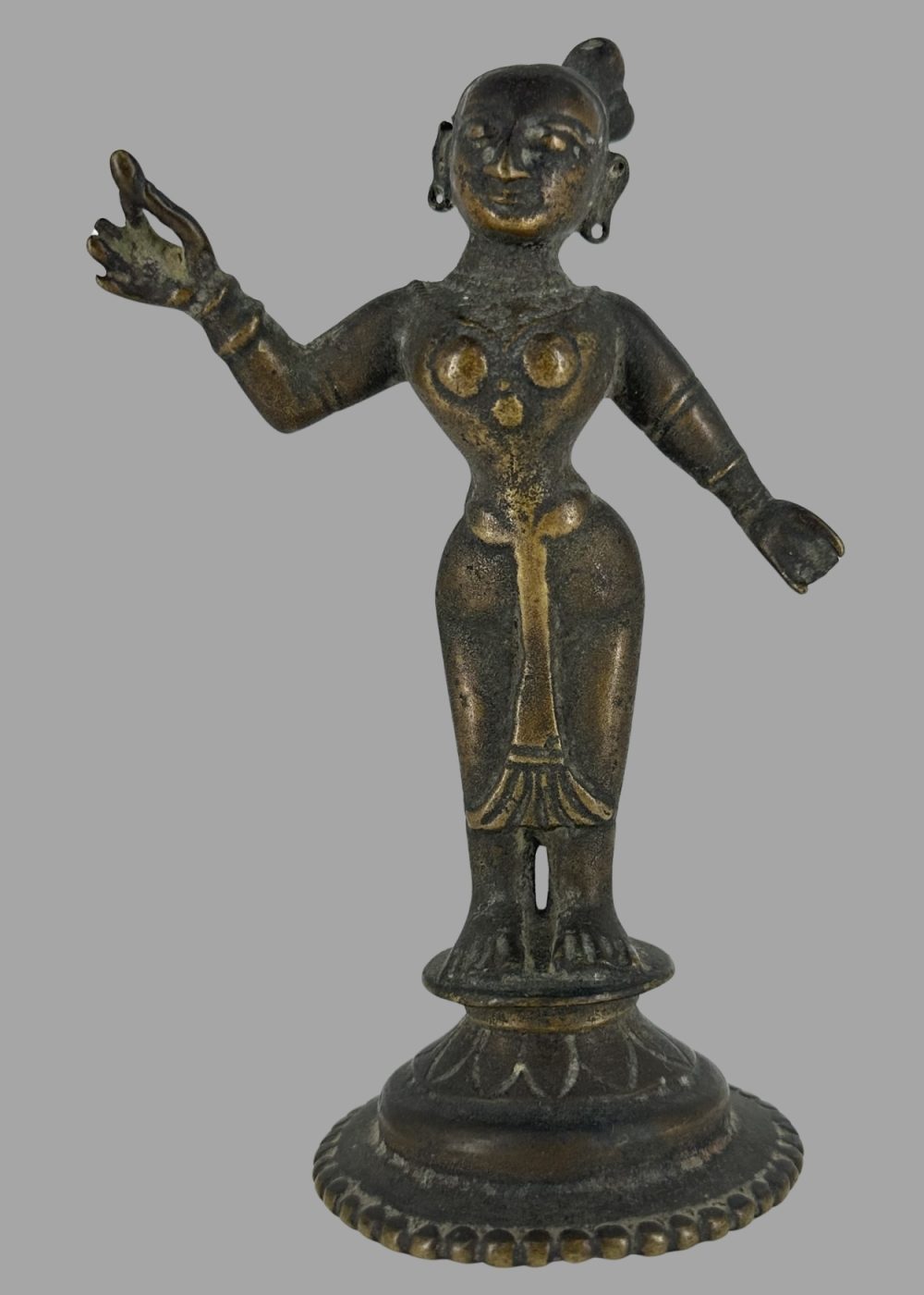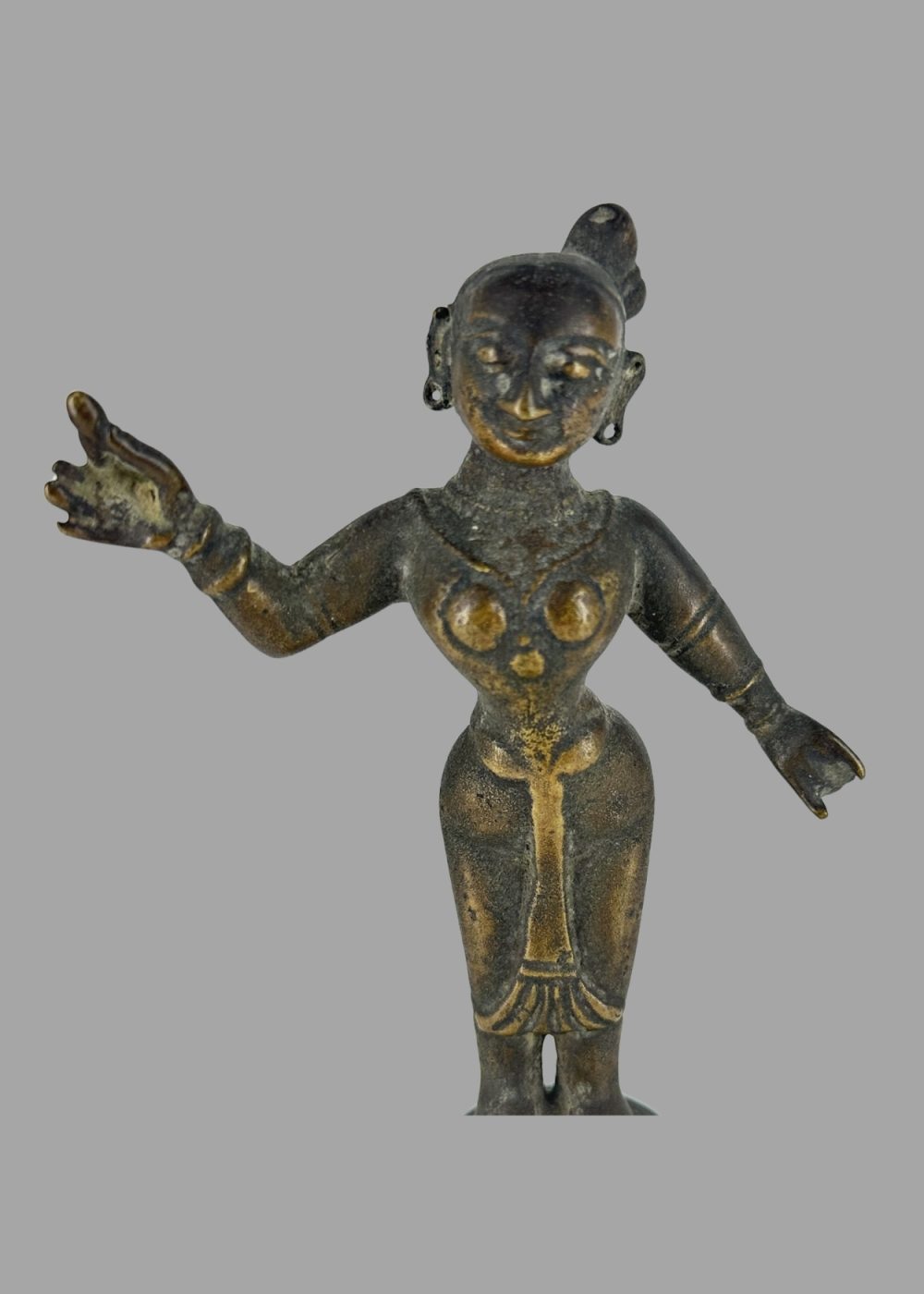 A bronze figure of Radha from Bengal/Orissa. The sculpture depicts Radha standing gracefully on a circular lotus base, with stylized facial features, an elaborate hair bun, and minimal yet distinct ornamentation. The raised hand suggests a gesture of offering or blessing, while the overall form reflects the regional artistic traditions of late medieval eastern India.