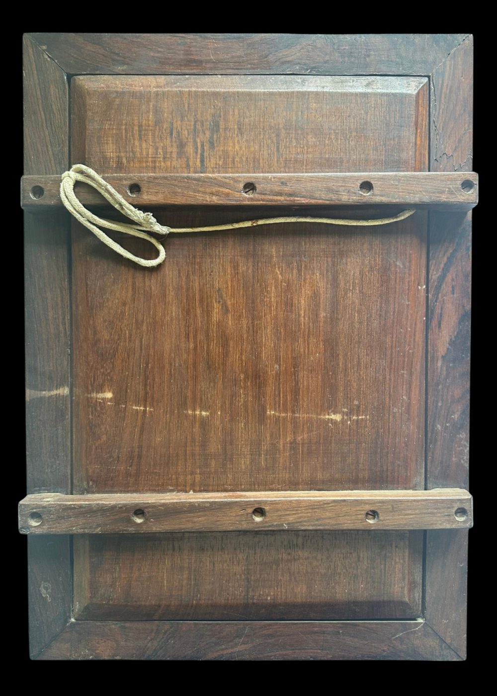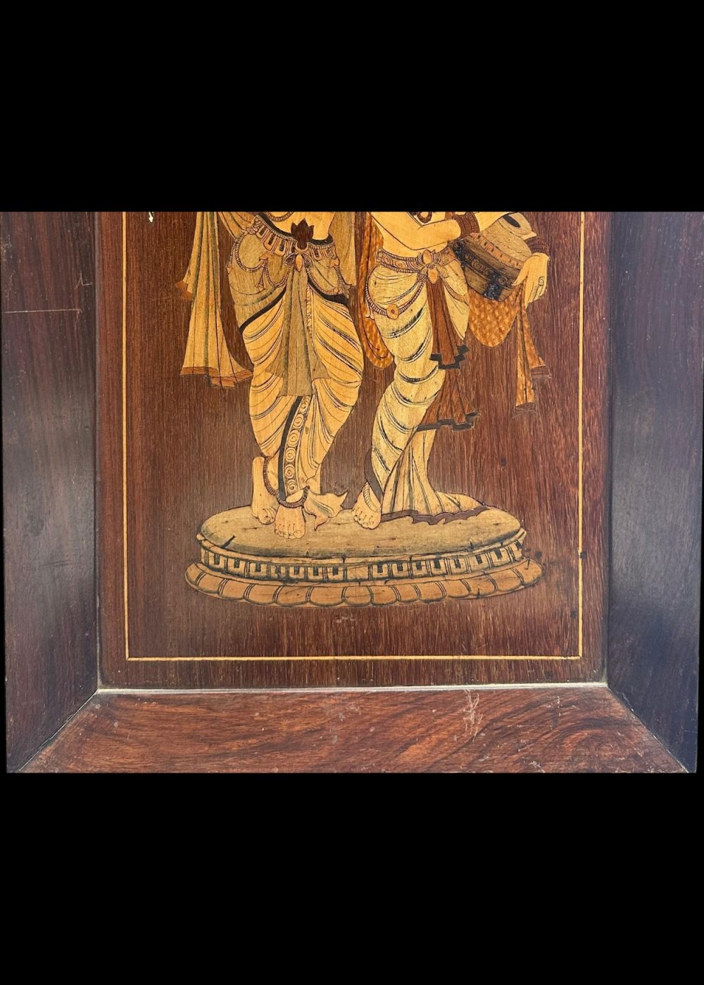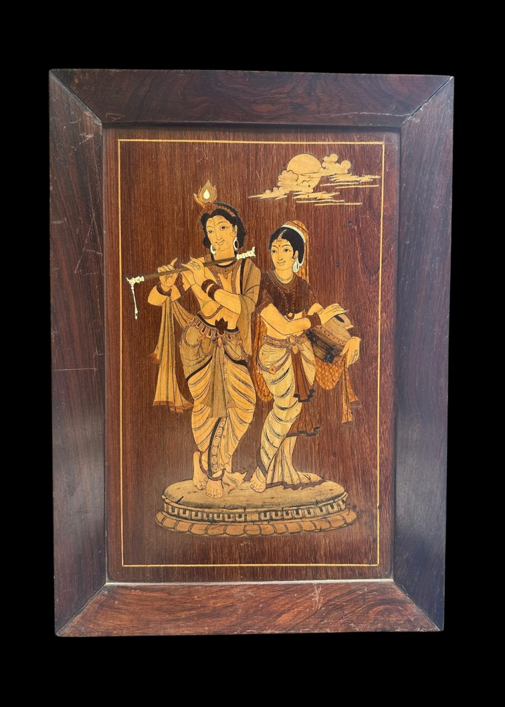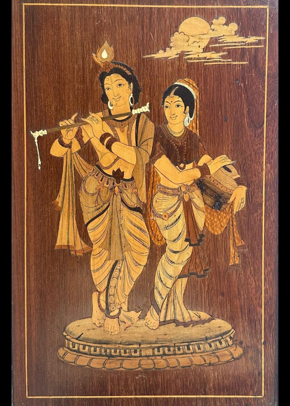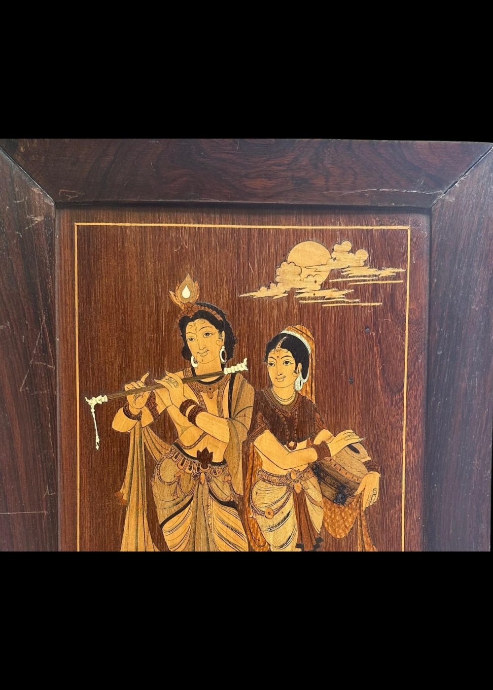 This teak wood panel with inlay work from Kerala, approximately 50–60 years old, beautifully showcases the region’s rich tradition of decorative craftsmanship. Featuring the divine duo of Krishna and Radha, the artwork uses contrasting wood inlays to create intricate details and naturalistic shading. The scene evokes themes of devotion and love, reflecting both spiritual and aesthetic sensibilities. This piece highlights the exceptional skill of Kerala artisans in transforming wood into expressive, enduring art.