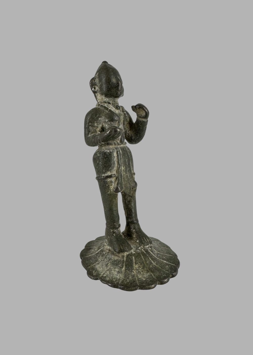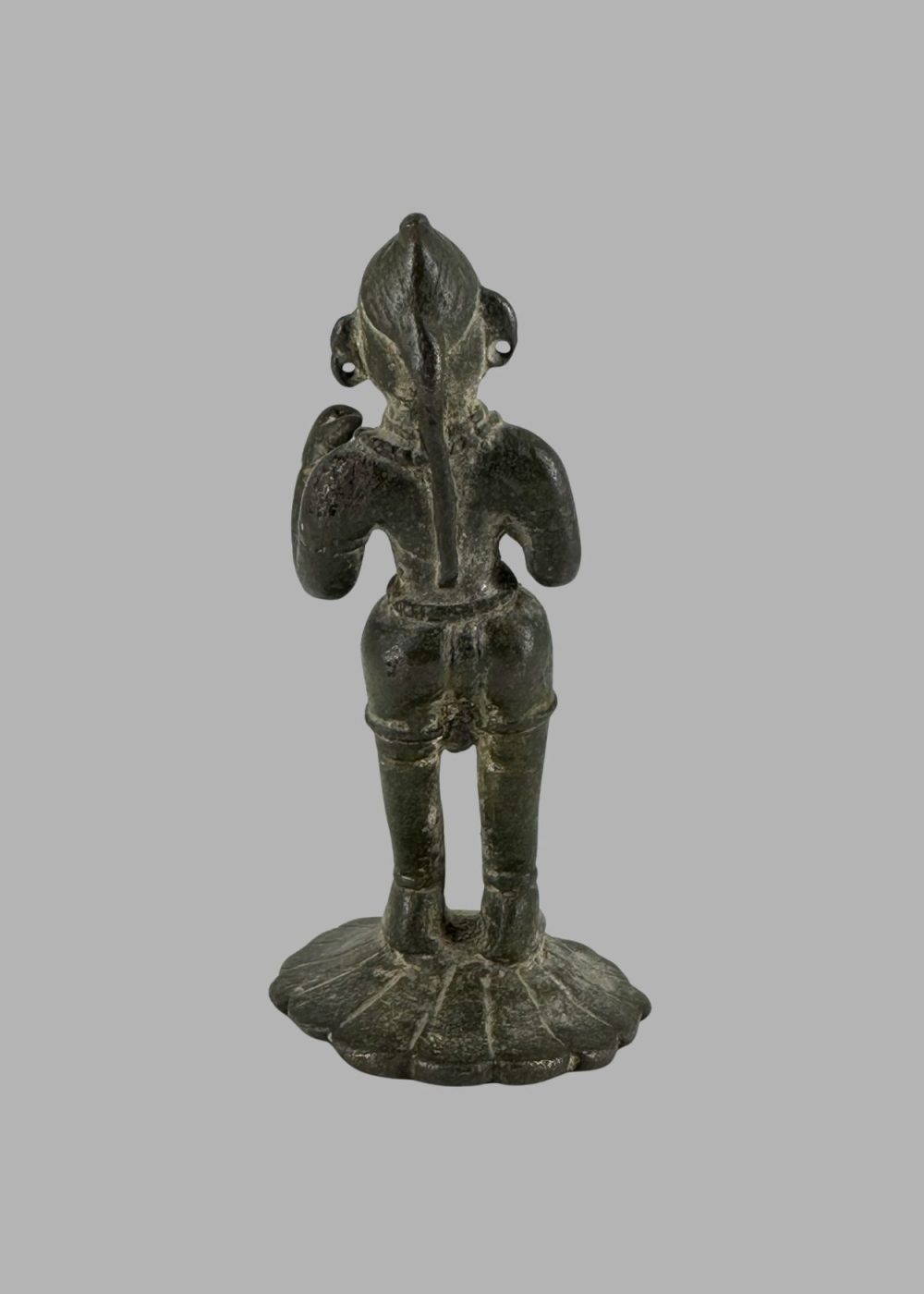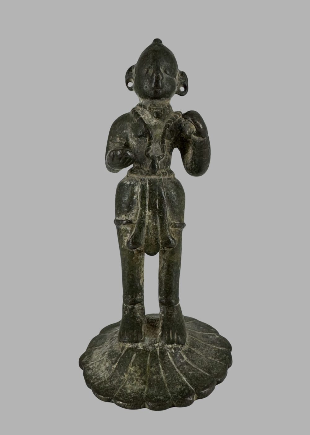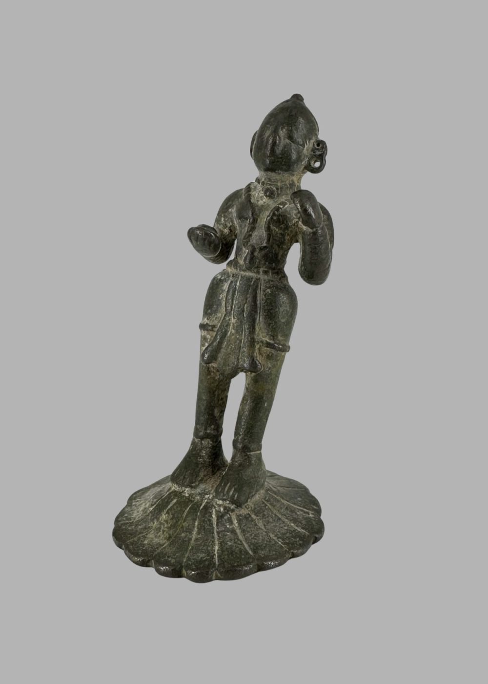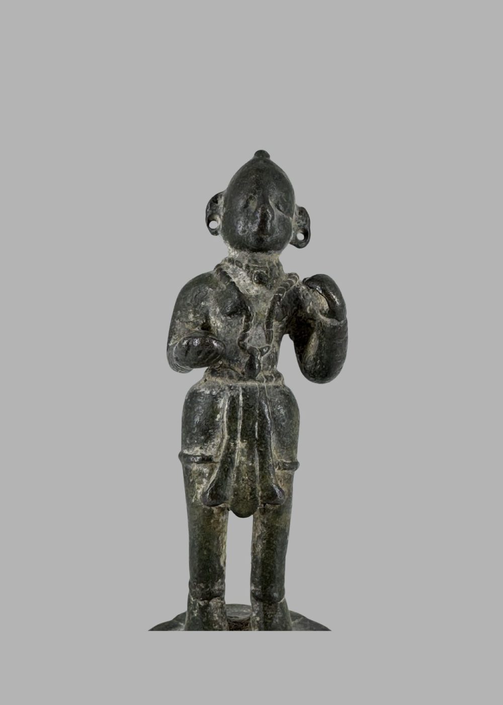 This bronze figure of Radha reveals the grace and devotional intimacy central to Vaishnava tradition. Standing atop a scalloped base, she is adorned with finely cast jewelry and draped in delicately modeled garments. The gentle sway of her posture and serene expression evoke quiet reverence. Characteristic of medieval Gujarati bronze work, the sculpture balances ornamental richness with spiritual poise, likely intended to accompany Krishna in temple rituals or private worship.