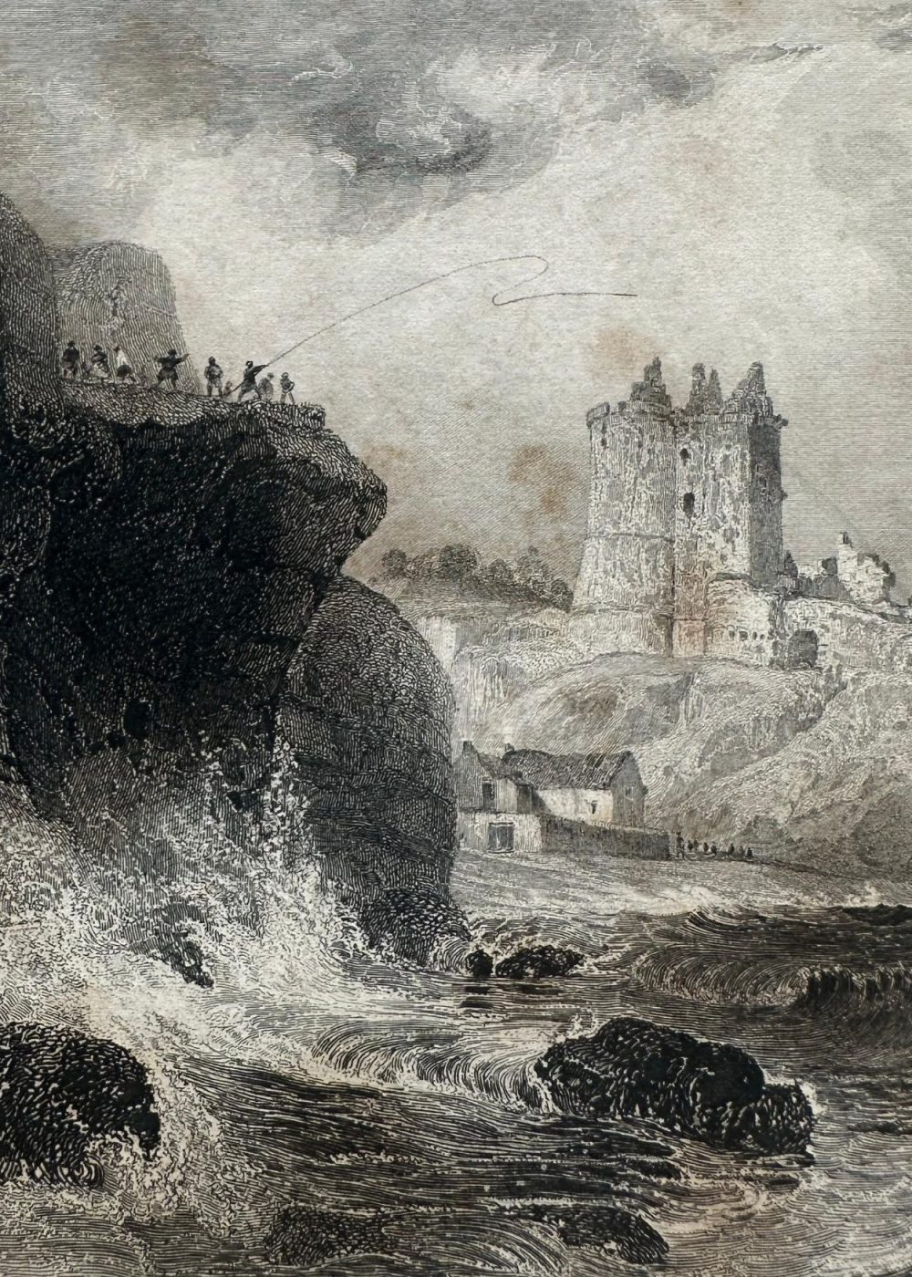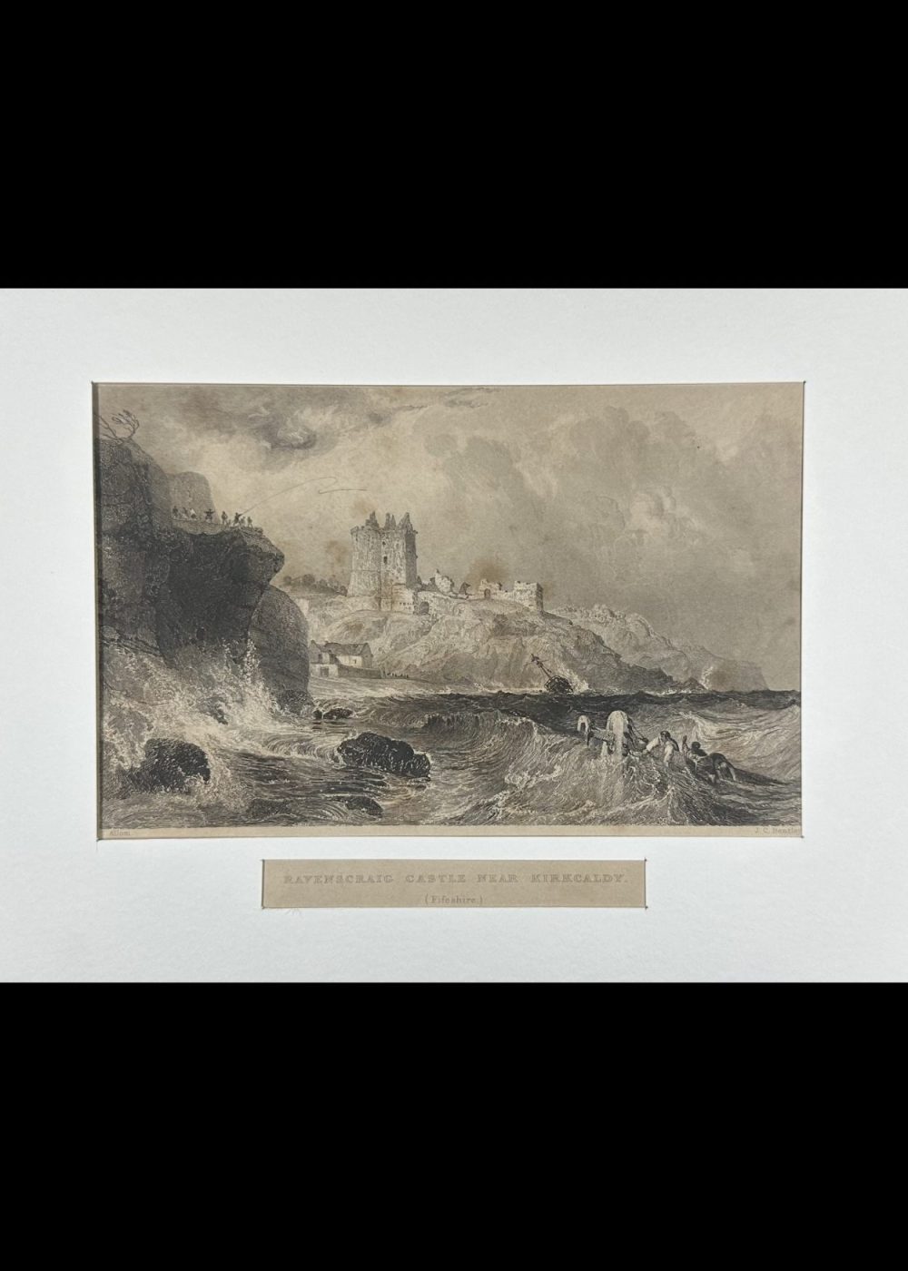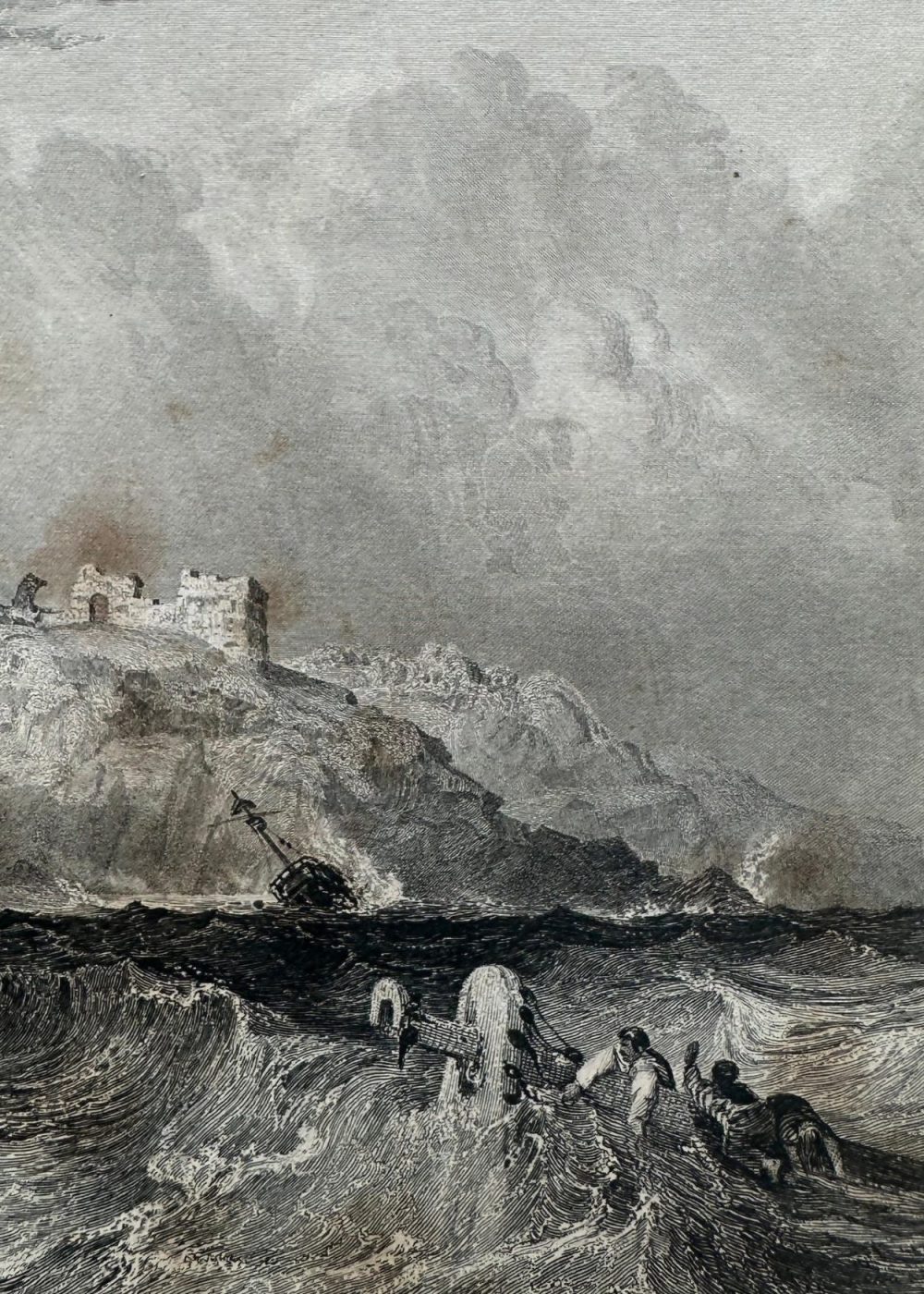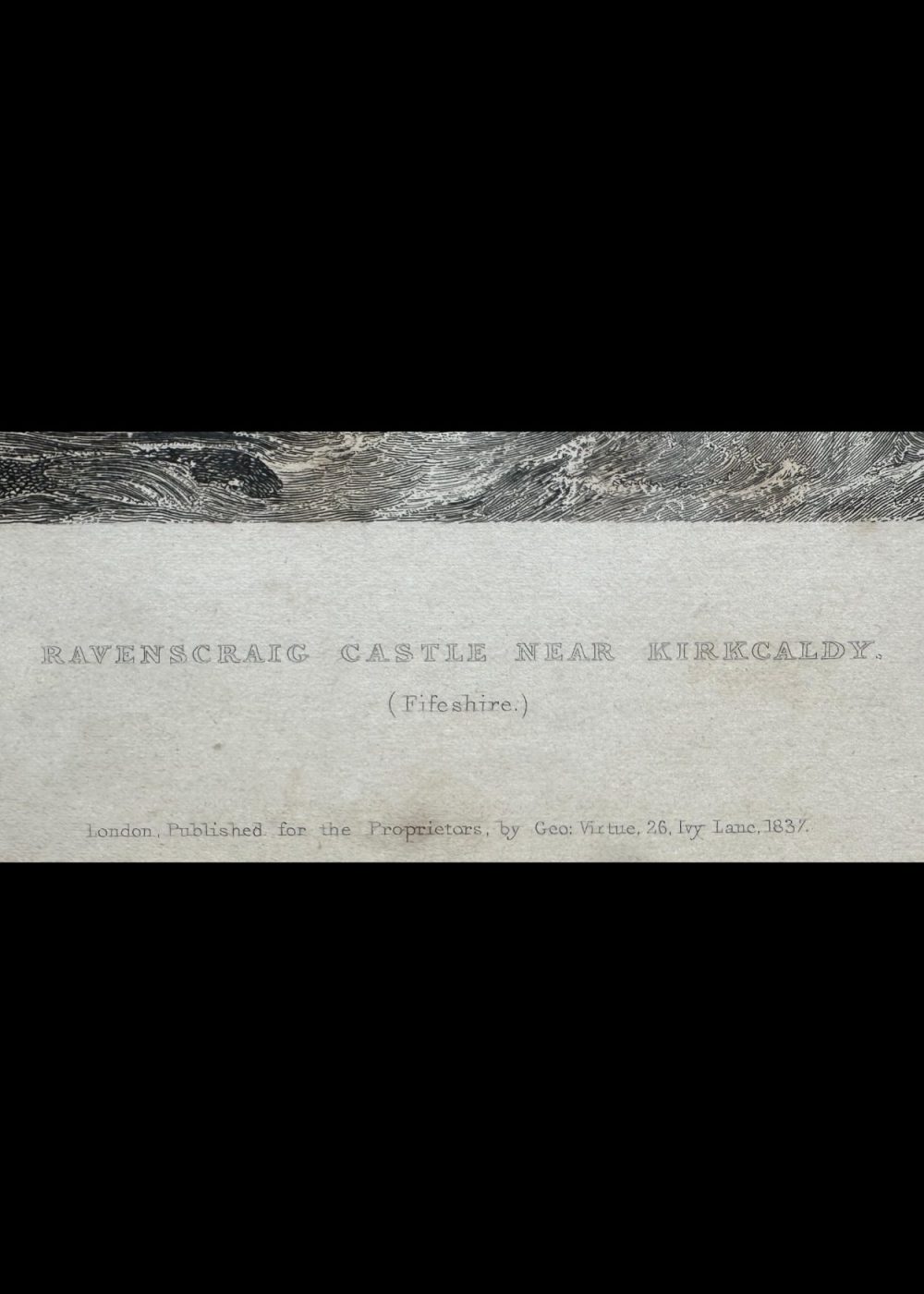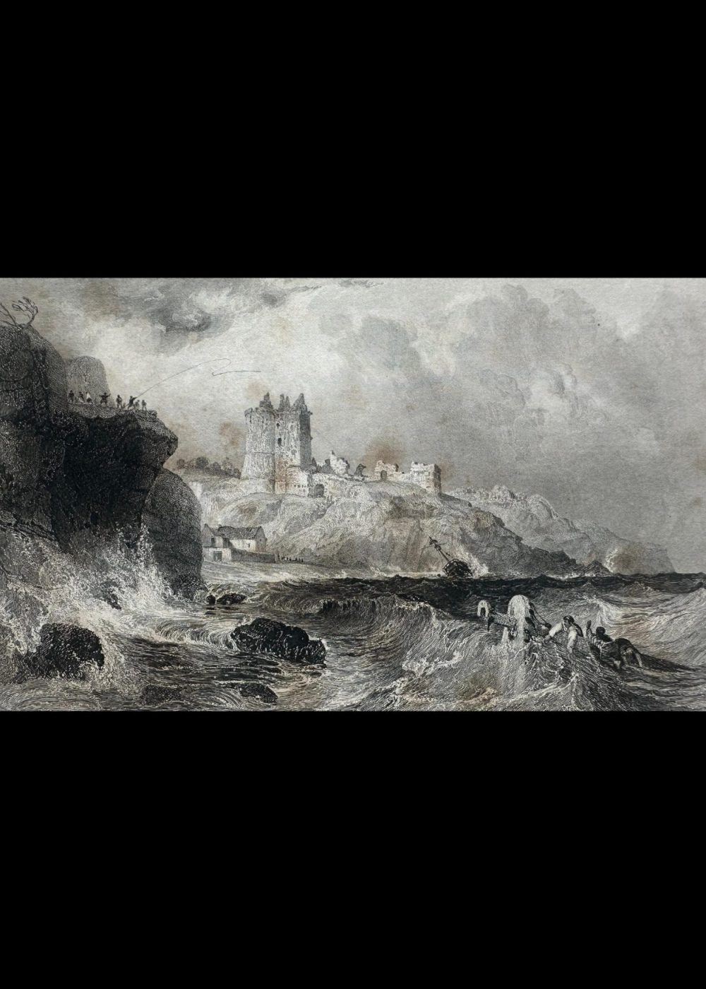 London, Published for the Proprietors, by Geo: Virtue, 26 Ivy Lane, 1837. This atmospheric engraving showcases Ravenscraig Castle dramatically perched above a storm-lashed coastline near Kirkcaldy, Fife. The formidable stone structure stands against a turbulent sky, its towers rising above cliffs battered by crashing waves. In the foreground, figures struggle in the surf, likely shipwreck survivors or rescuers, adding a sense of urgency and peril. A shipwreck appears in the background near the base of the castle cliffs. The composition captures the raw power of nature and the stoic endurance of medieval architecture amid the chaos of the sea.