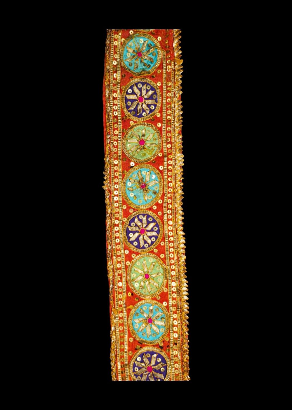 This vibrant Rajasthani border roll showcases exquisite real gotta work embroidery on a rich red fabric base. Circular motifs in turquoise, green, and royal blue are intricately adorned with gold and silver gota, sequins, and mirror embellishments. A fine example of traditional craftsmanship, it reflects the opulent textile heritage of Rajasthan, often used to adorn festive garments and ceremonial textiles.
