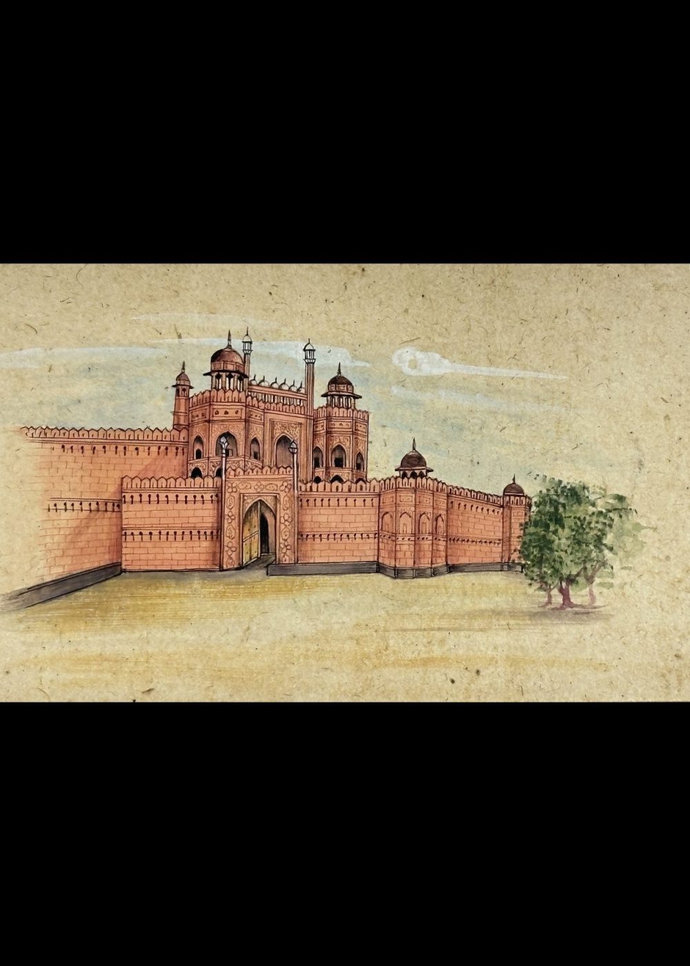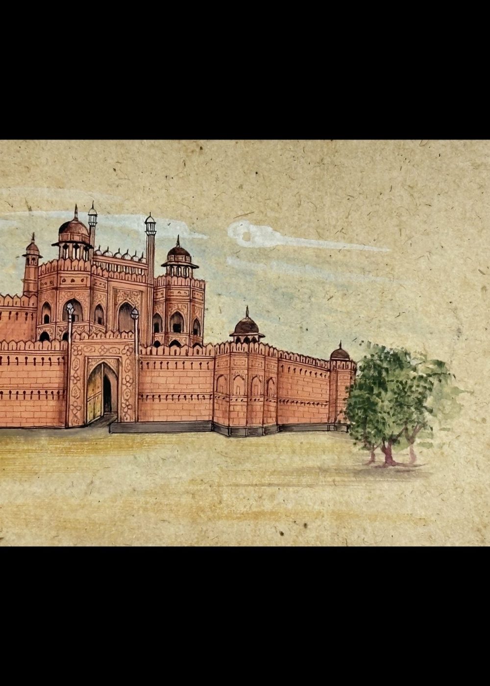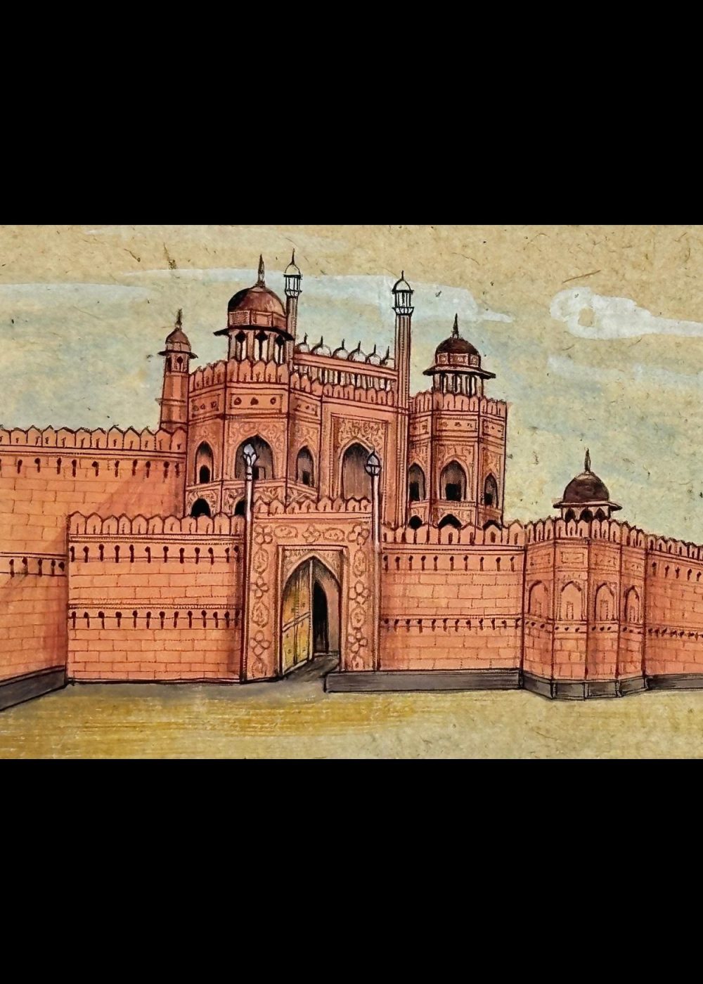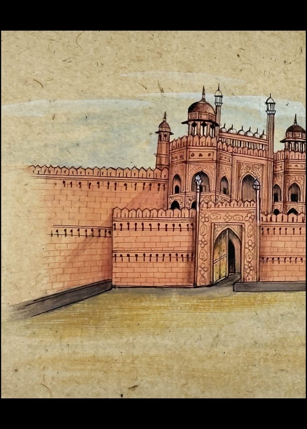 This miniature painting presents a detailed and angled view of the Delhi Gate of the Red Fort in Delhi, India. Built by Emperor Shah Jahan in the 17th century, the Red Fort is an architectural marvel of the Mughal era, combining Persian, Timurid, and Indian styles.
