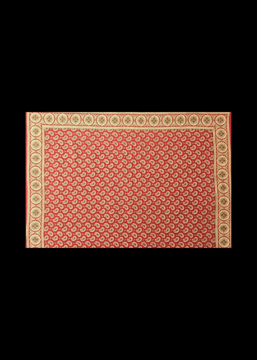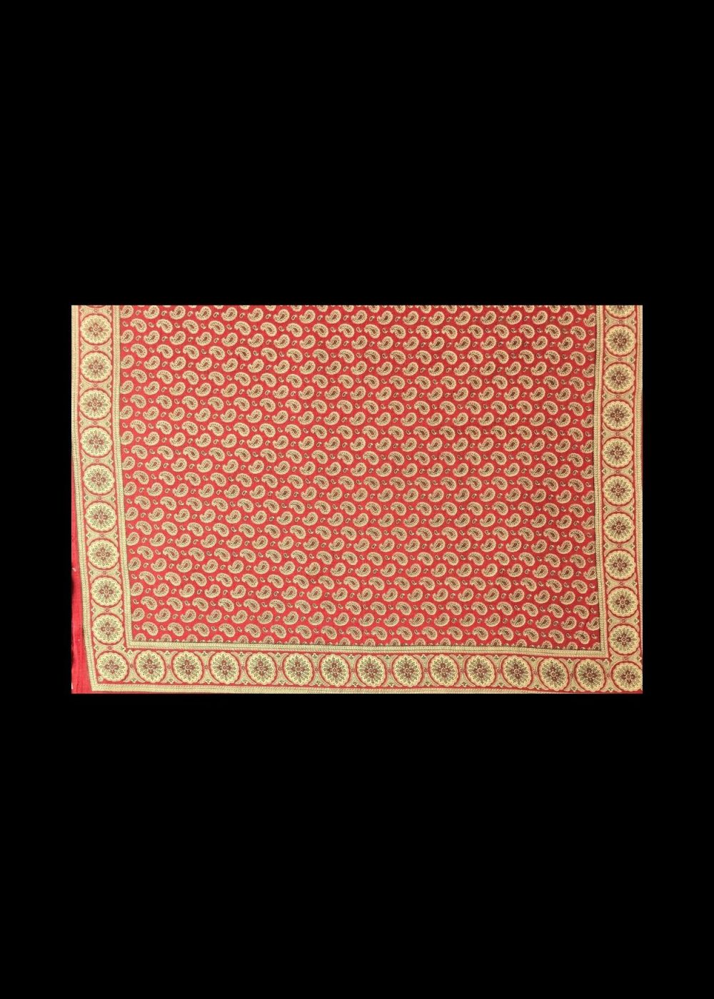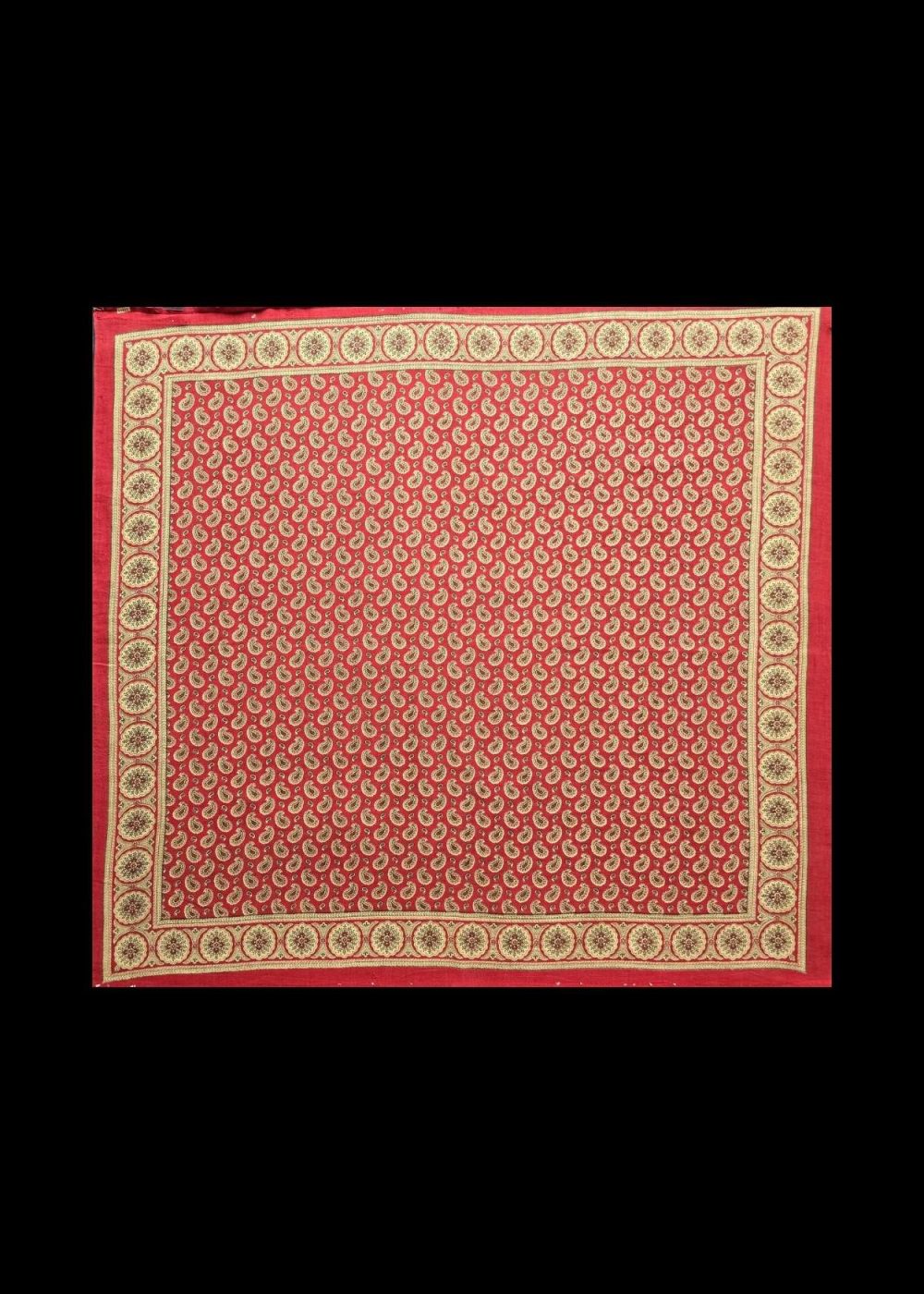 This is a roller-printed chakla produced in Manchester, England, specifically for the Indian market during the late 19th to early 20th century. It features a rich red base adorned with intricate, traditional patterns in gold. The design includes a repeating paisley motif at the center, surrounded by a detailed floral border, giving it an elegant and timeless appeal. This chakla is perfect for adding a touch of sophistication to any space, blending classic design with high-quality craftsmanship. Ideal for cultural events, home decor, or as a stylish accessory for Indian-themed settings and reflect the historical influence of British industrial textile production on South Asian material culture.