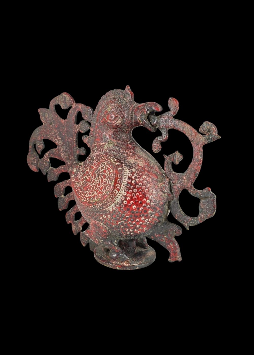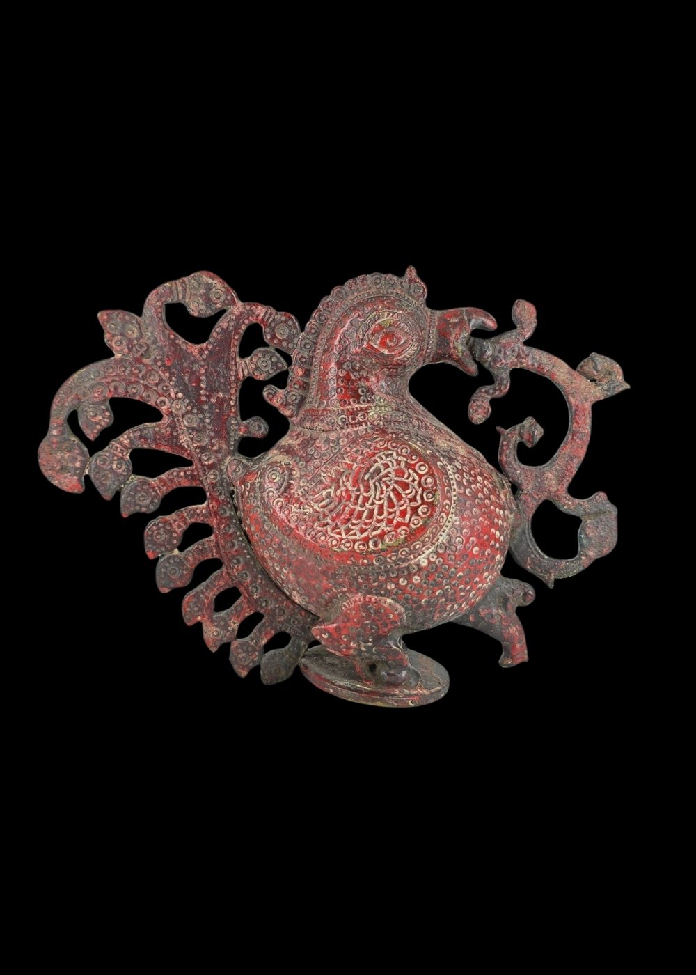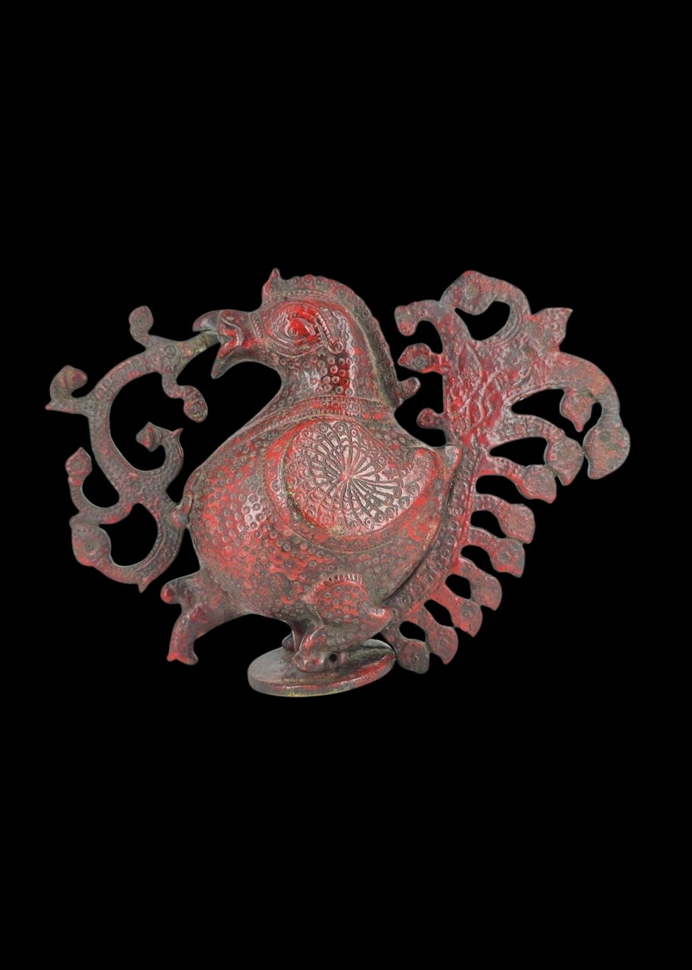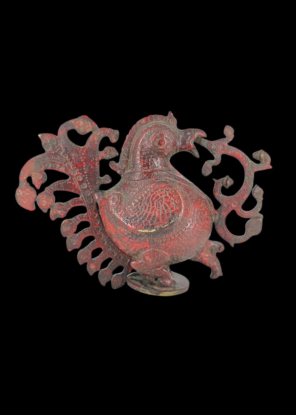 This is a striking brass peacock figurine finished with a distinctive red patina, featuring richly detailed plumage and ornate patterns on its body and tail. The flowing, stylized shapes and intricate designs reflect skilled Indian metalwork, making it a vibrant decorative centerpiece and collectible art piece.