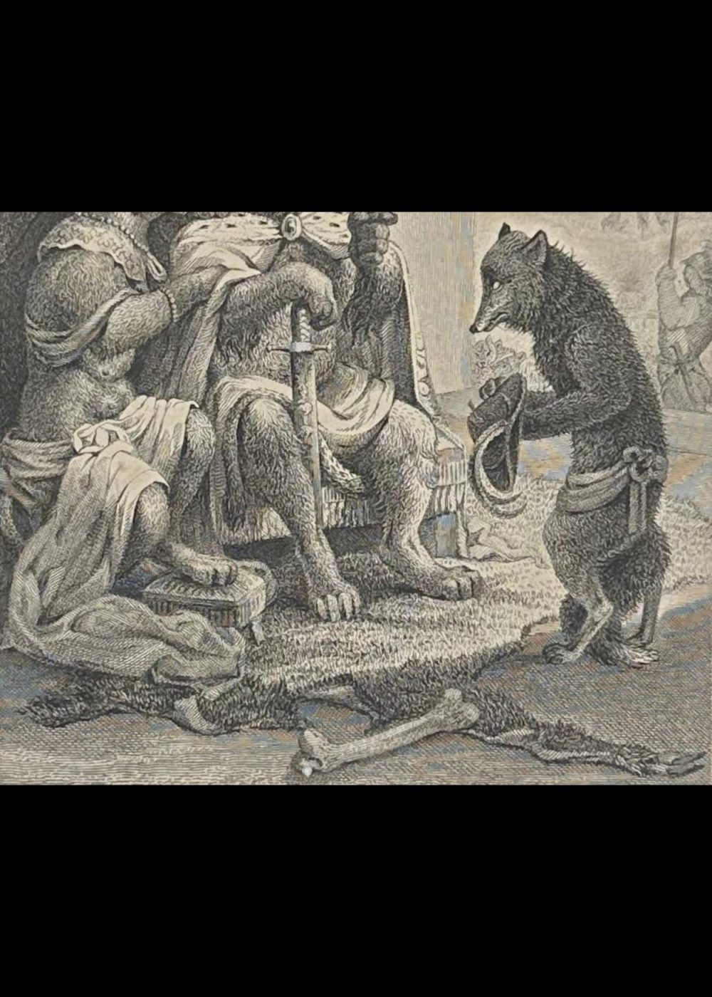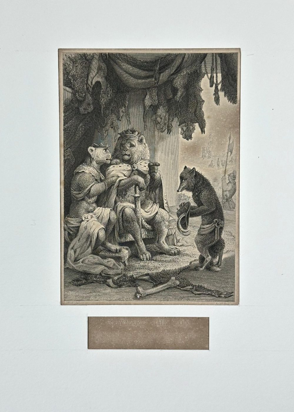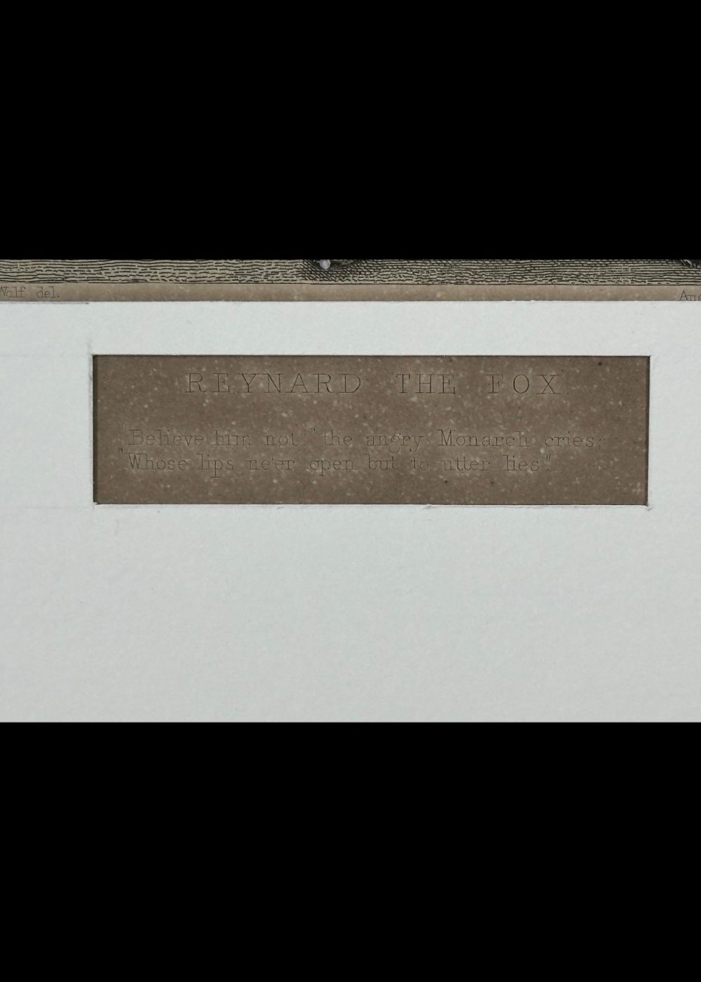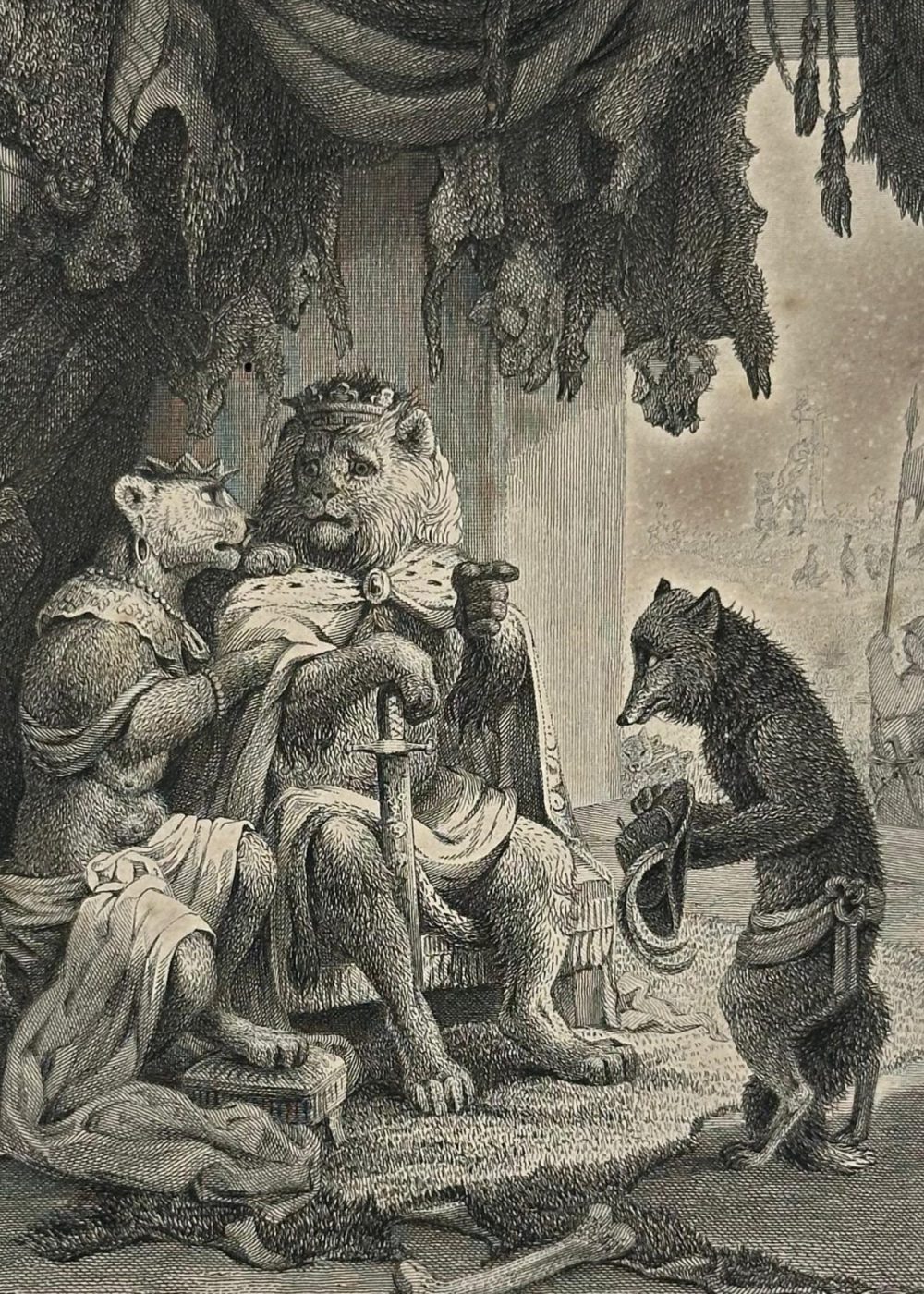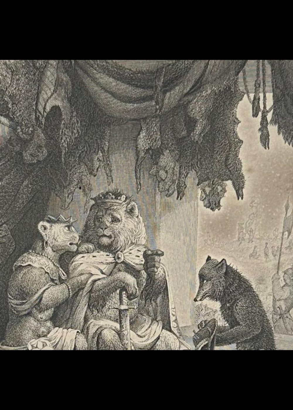This richly detailed anthropomorphic engraving depicts a pivotal scene from the medieval allegorical tale Reynard the Fox. Seated on a throne draped in regal cloth, a lion king and queen, symbolizing sovereign authority, preside over the trial of the cunning fox Reynard, who stands deferentially with cap in hand. Reynard’s tales, originating in 12th-century Europe, center on a clever and morally ambiguous fox who outwits both enemies and rulers alike. The fable critiques corruption, vanity, and hypocrisy in feudal society—qualities symbolized here by the bemused and majestic lion, a ruler struggling to maintain justice amid deceit. The engraving’s theatrical composition, with its richly draped interior and dynamic postures, adds a satirical flair typical of Grandville’s anthropomorphic illustrations. The poem below the image heightens the drama, presenting the lion’s suspicion toward Reynard’s notorious lies.