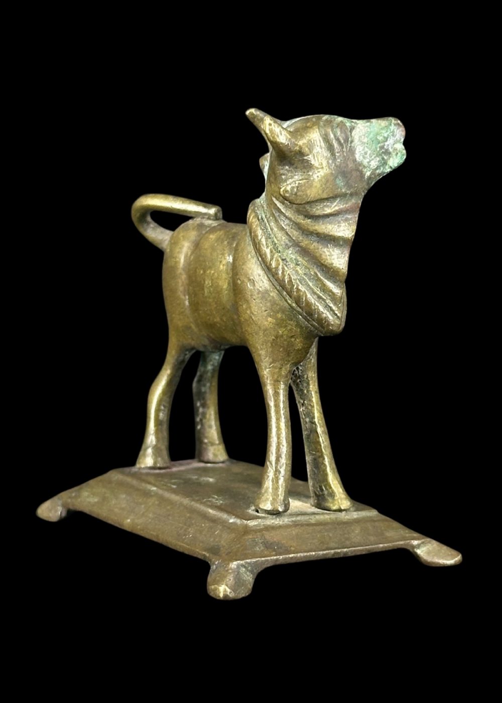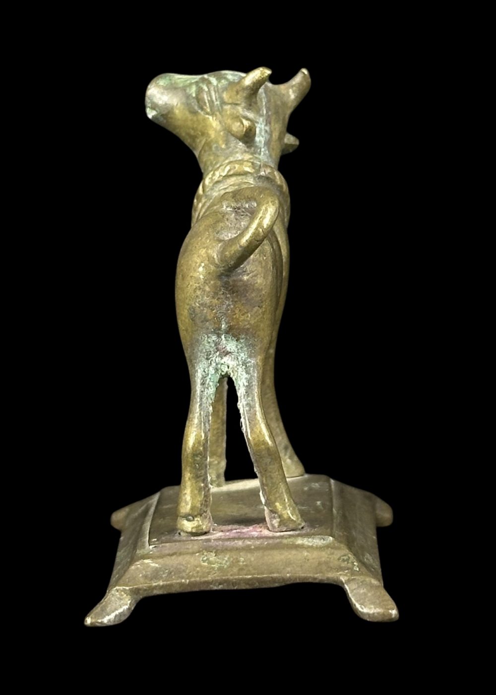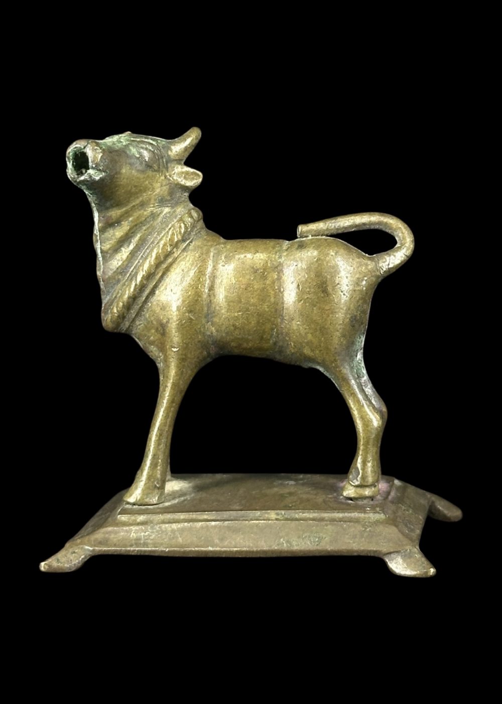 A dynamic bronze sculpture of a bull, captured mid-roar with its head raised and mouth open. The figure stands firmly on a rectangular base, adorned with a rope-like collar and a curved tail. Crafted in England the piece reflects the era’s interest in animal symbolism and expressive form, possibly serving as a decorative or symbolic object.