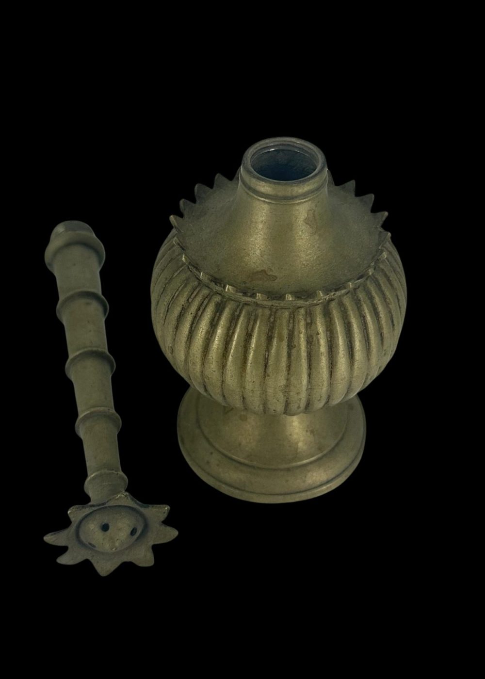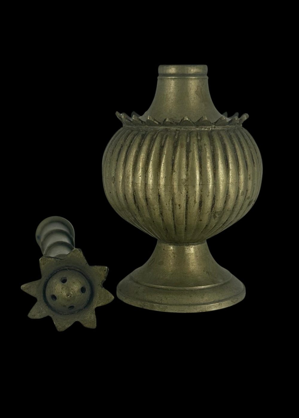 This elegant rose water sprinkler, crafted in German silver, reflects the refined artistry of North Indian metalwork. Its slender, tapering neck rises from a fluted, bulbous body and culminates in a petal-shaped nozzle punctuated with fine perforations for dispersing scented water. Decorative ringed accents along the shaft and a sturdy round base enhance both functionality and visual balance. The piece blends traditional forms with industrial silver alloys, offering a glimpse into evolving aesthetic practices that retained ceremonial purpose while embracing new materials.