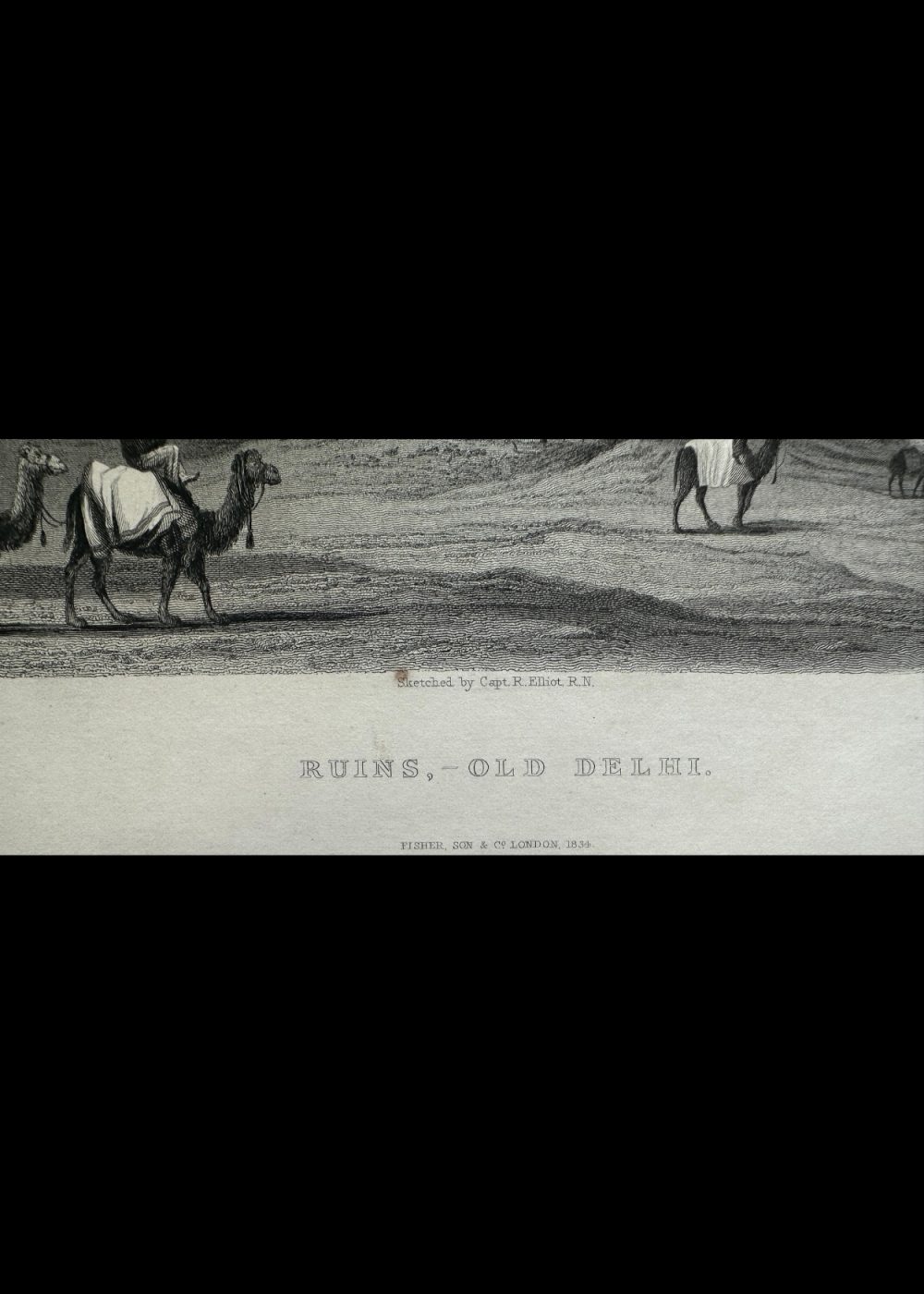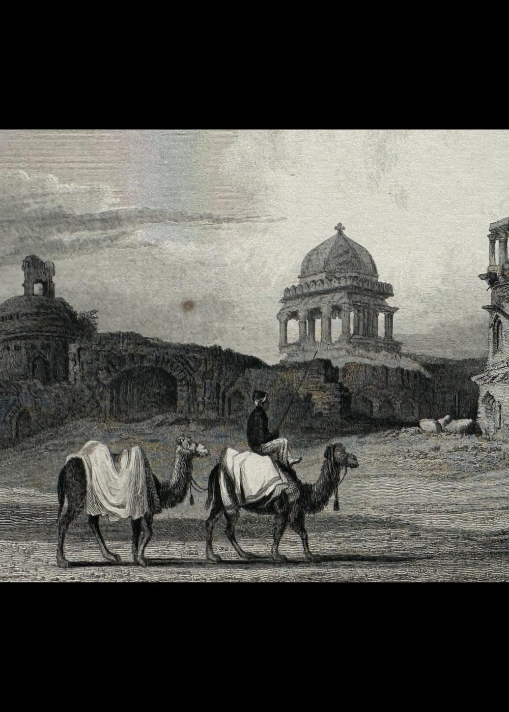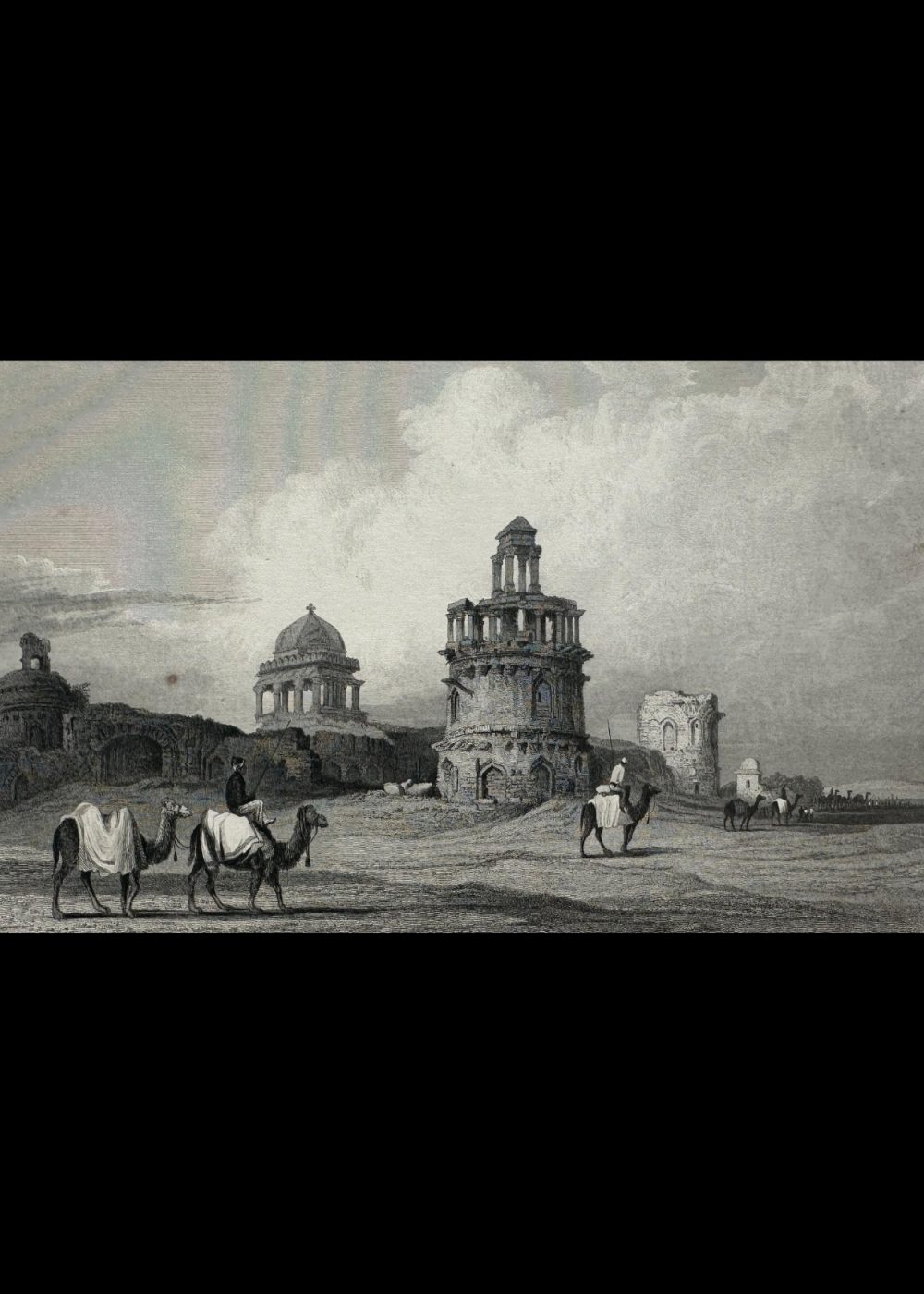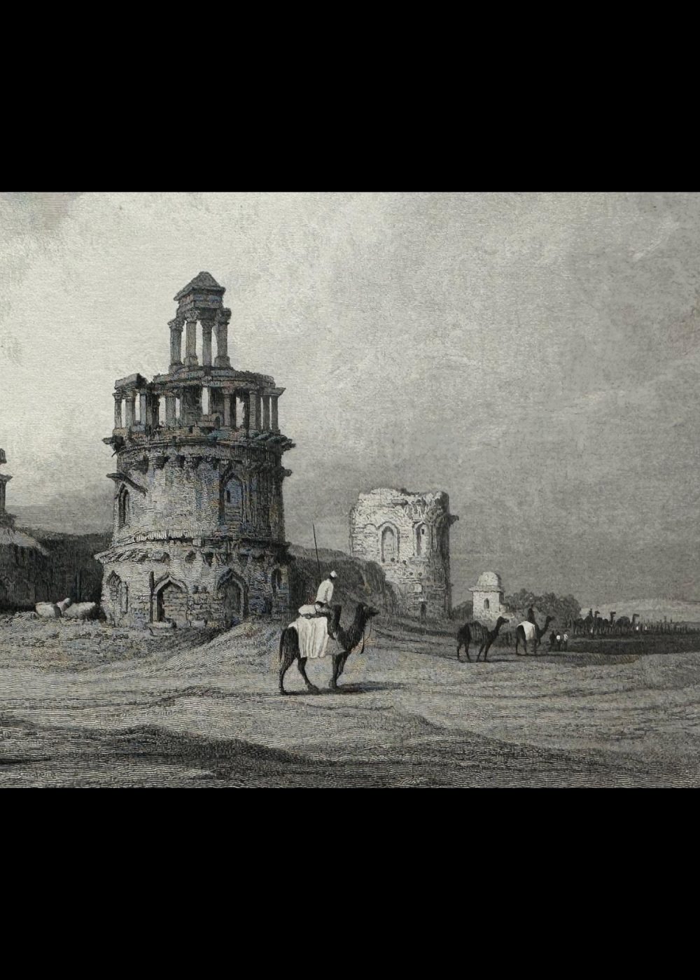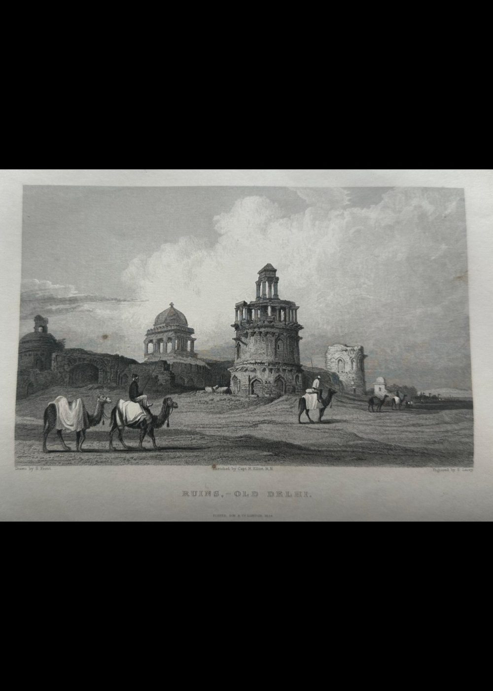 This engraving depicts the “Ruins, Old Delhi,” showcasing a scenic view of historical ruins in Delhi, India. The image is detailed with two camels, each carrying riders in traditional attire, traversing the desolate landscape of ancient architecture. The ruins, featuring intricately designed structures, evoke a sense of both beauty and decay, reflecting the passage of time. The engraving is sketched by Captain R. Elliot, R.N., and engraved by S. Lacey, with the original drawing by S. Prout. This artwork is a part of the “India-China” book, capturing the essence of India’s rich historical and architectural heritage. The composition is delicate, emphasizing the grandeur of the ruins against the vast sky.
