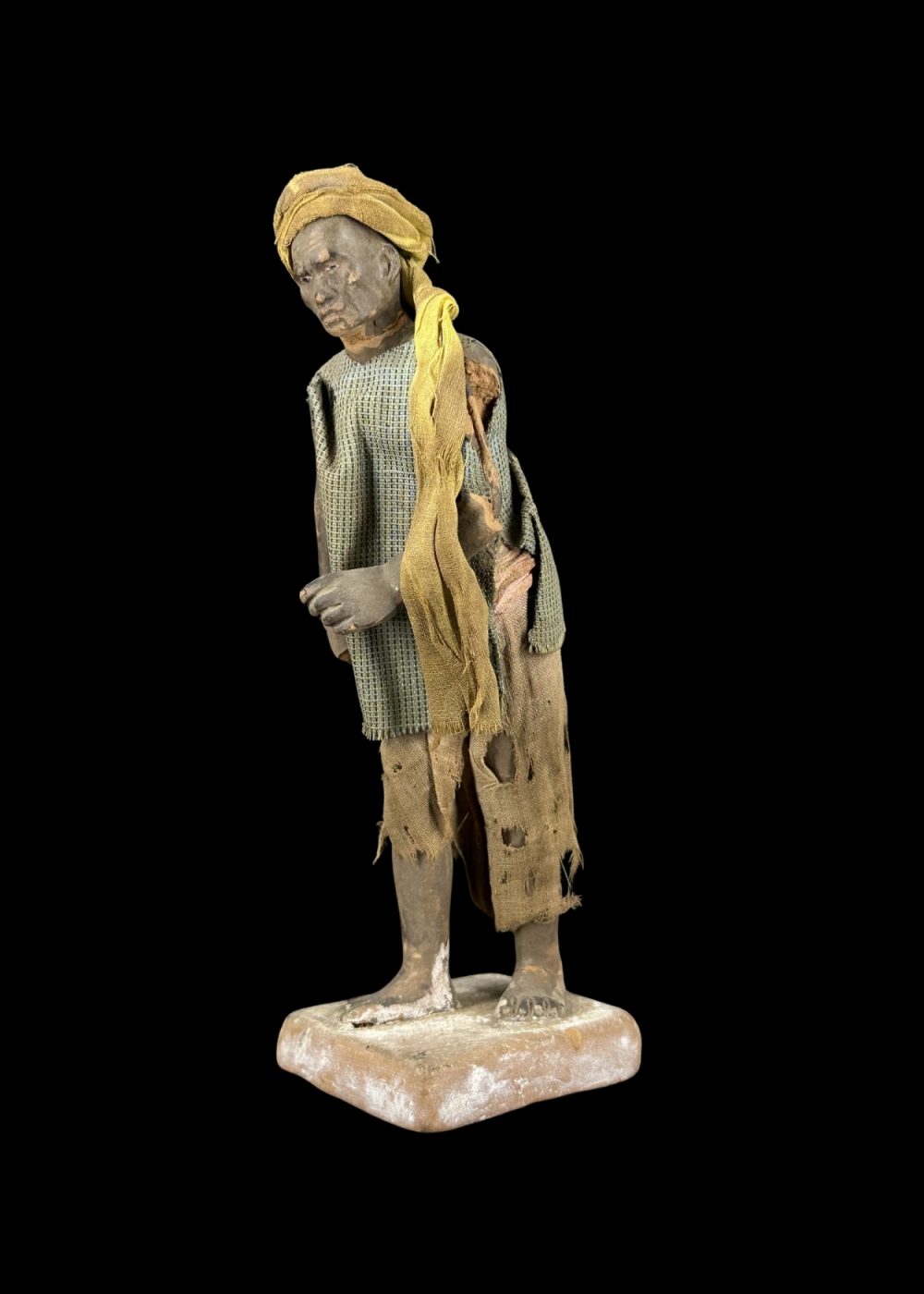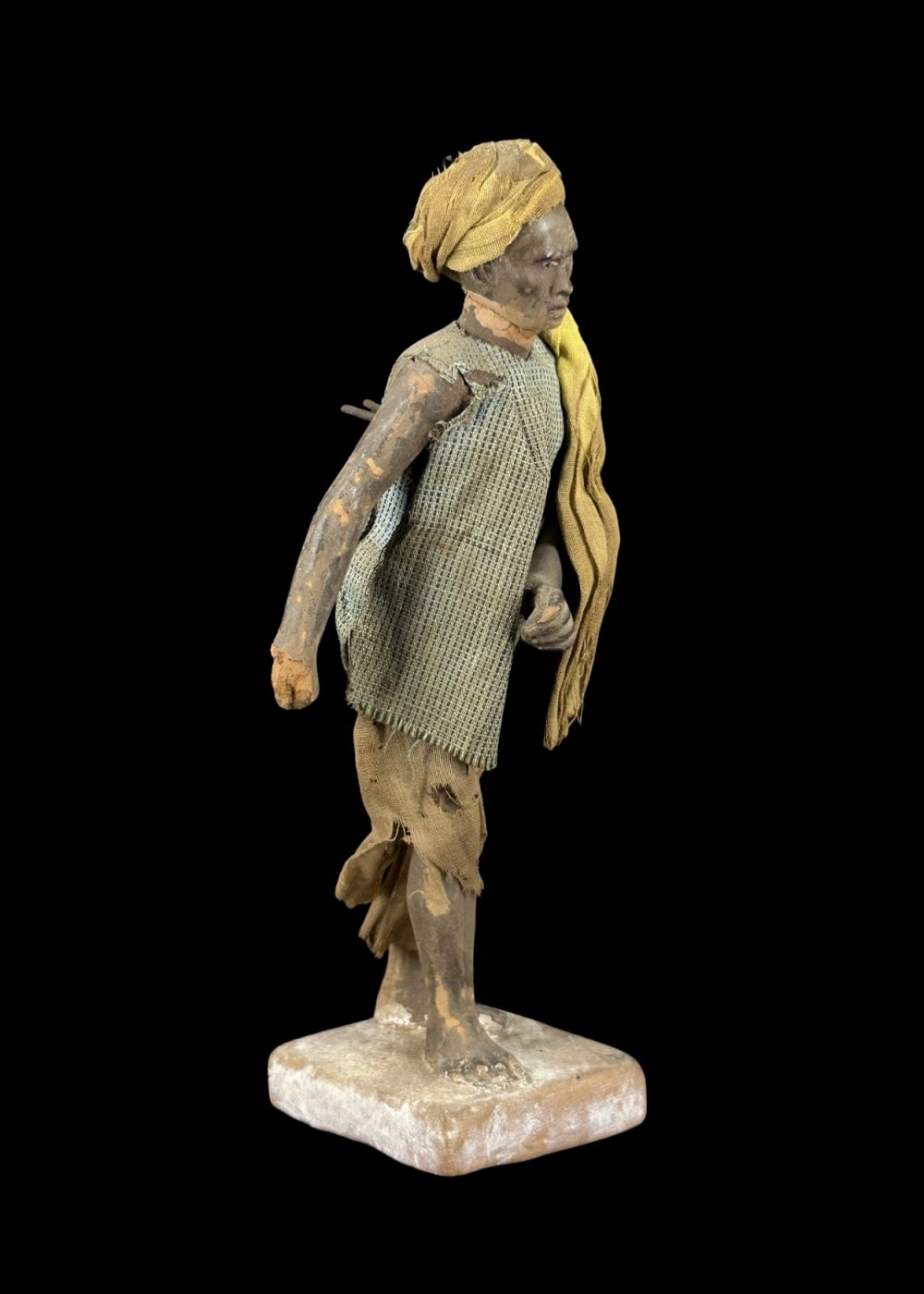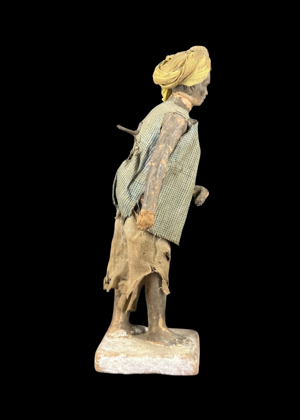 This rustic figurine represents a village farmer clad in worn, earthy garments, with a cloth draped over one shoulder and a turban on his head. The weathered appearance and modest stance evoke the humility and endurance of rural life. Capturing the essence of agrarian existence, the sculpture pays tribute to the hardworking individuals whose labor forms the backbone of traditional agricultural communities. The simplicity in dress and posture reflects dignity amidst hardship.