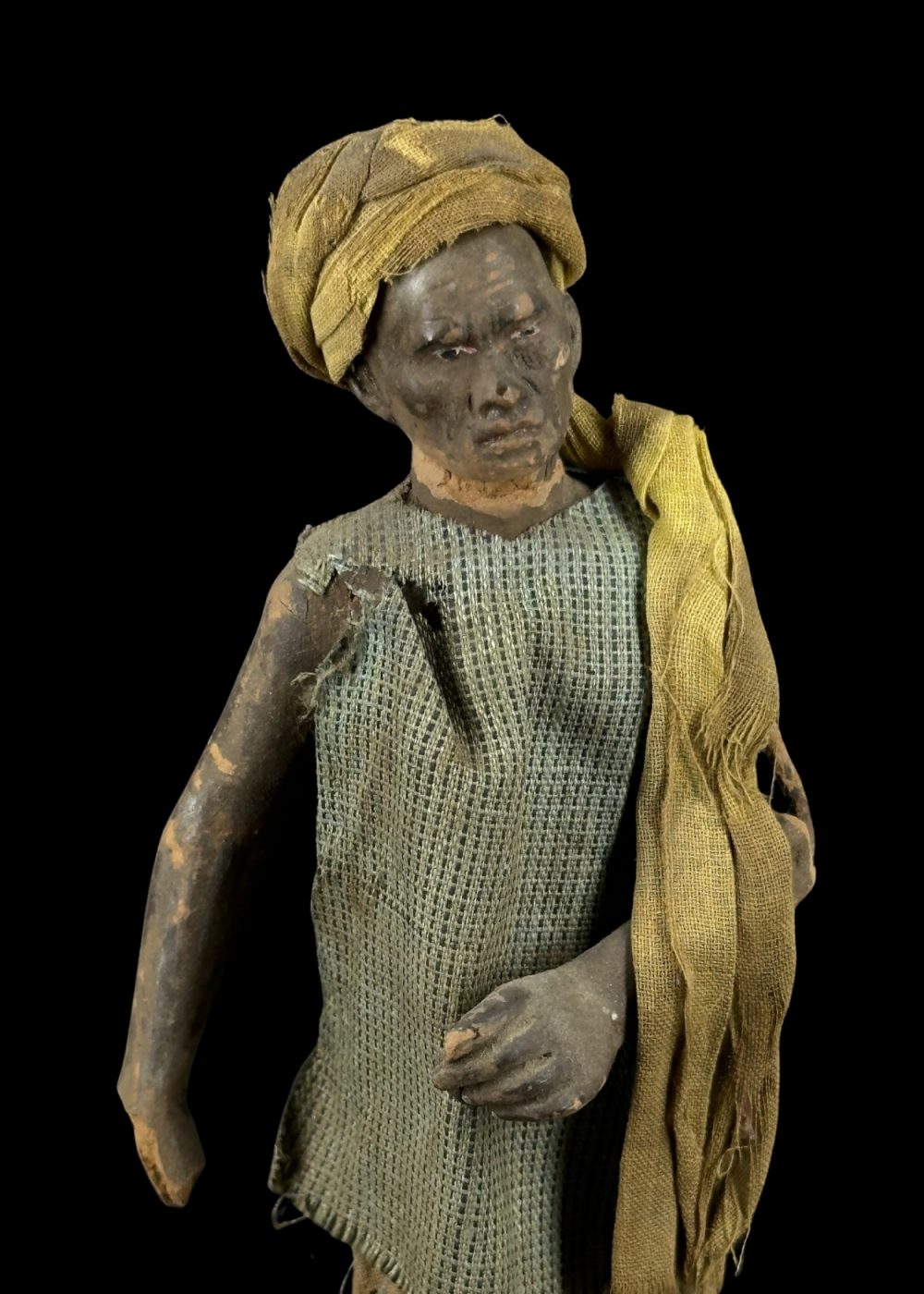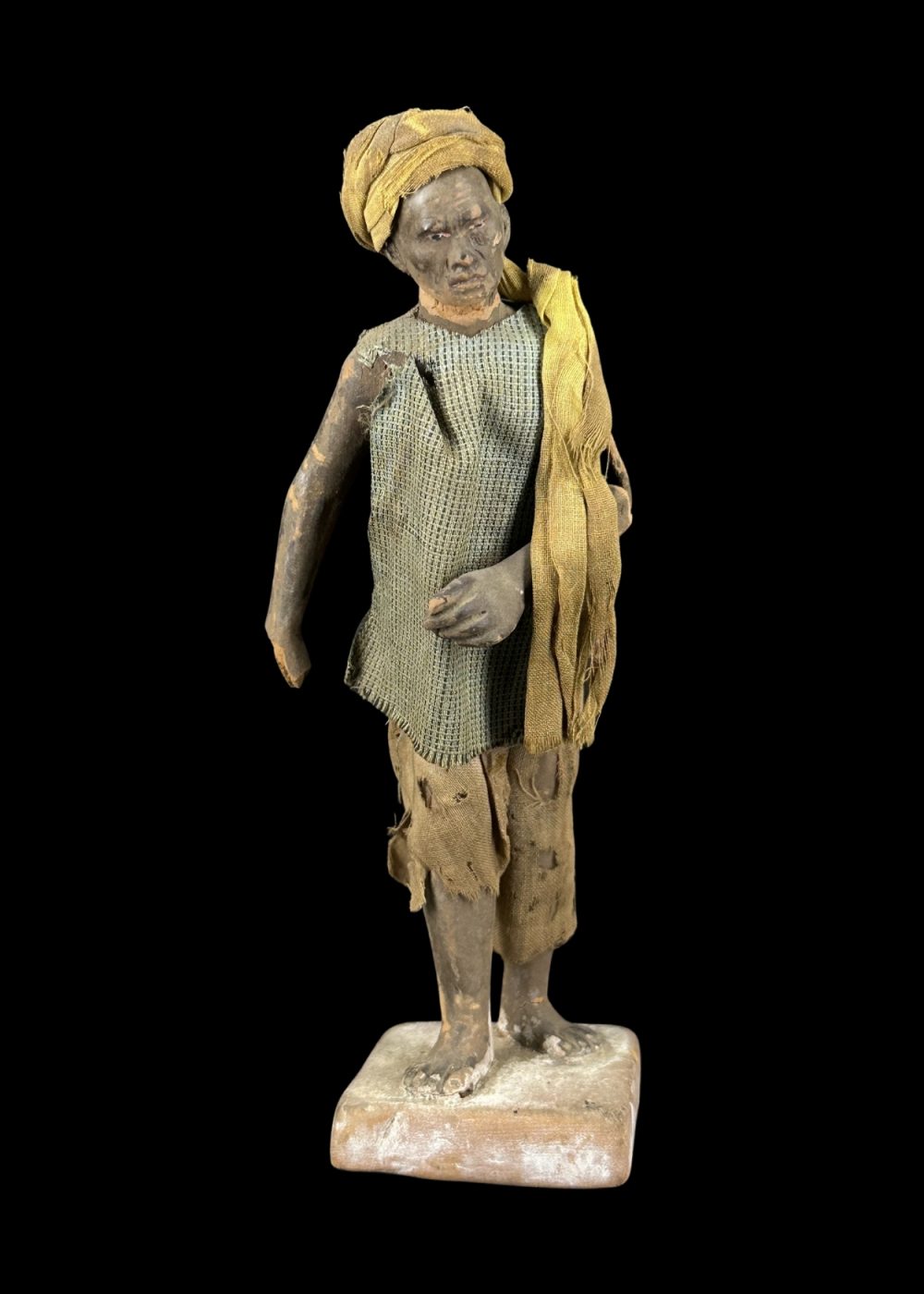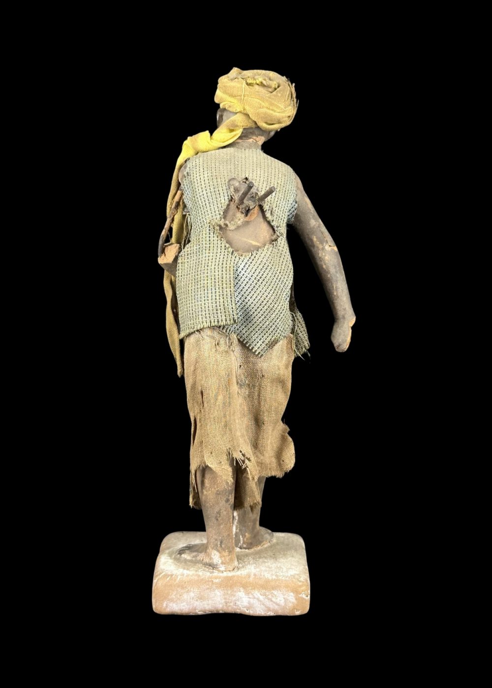This rustic figurine represents a village farmer clad in worn, earthy garments, with a cloth draped over one shoulder and a turban on his head. The weathered appearance and modest stance evoke the humility and endurance of rural life. Capturing the essence of agrarian existence, the sculpture pays tribute to the hardworking individuals whose labor forms the backbone of traditional agricultural communities. The simplicity in dress and posture reflects dignity amidst hardship.