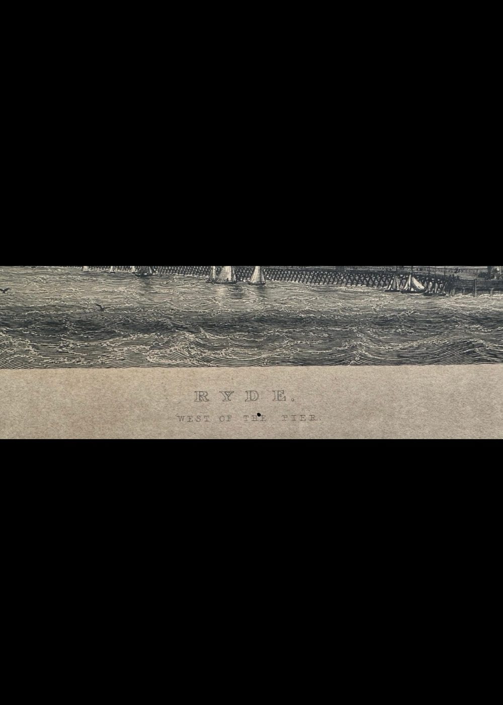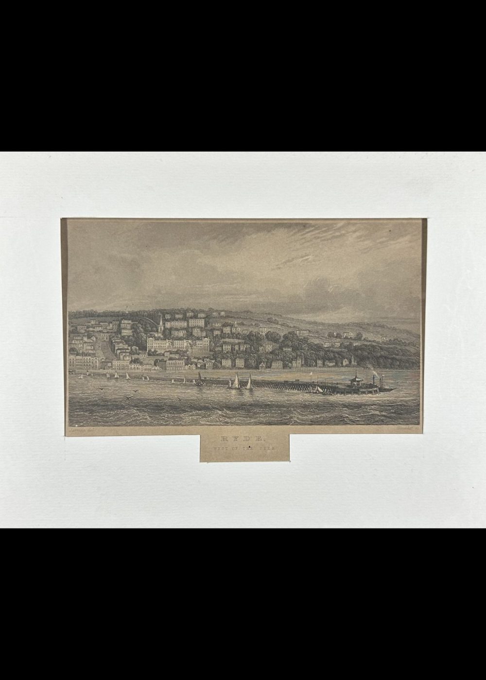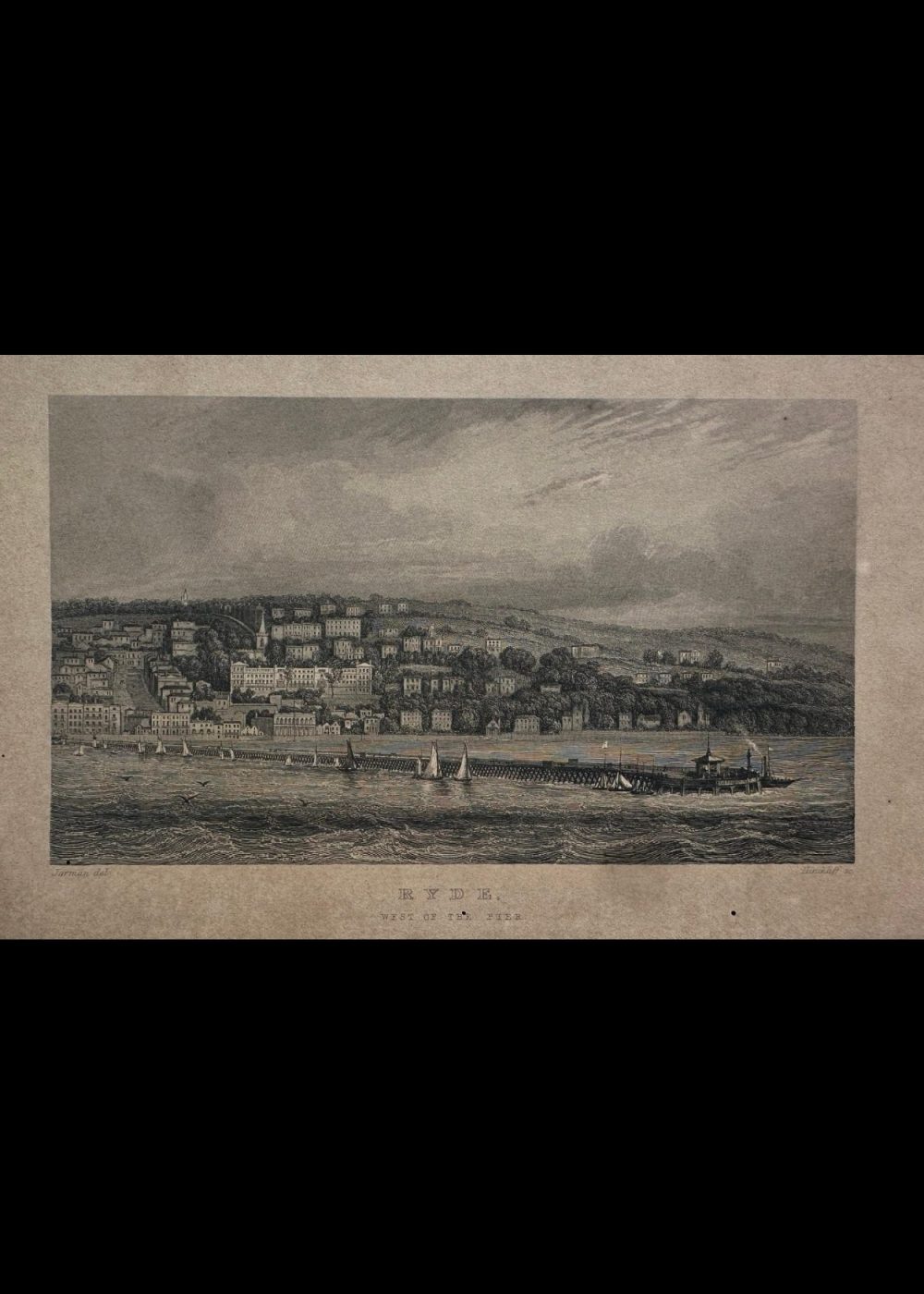 This is a vintage engraved illustration titled “Ryde. View of the Pier” depicting the seaside town of Ryde, located on the northeast coast of the Isle of Wight, England. The image showcases a panoramic view from the sea, looking toward the town with its many Georgian and Victorian-style buildings nestled on a gently rising hillside. The Ryde Pier, one of the oldest seaside piers in the UK, stretches into the water, lined with sailboats and a small pavilion or landing station at its end. The surrounding waters are calm, with subtle waves rendered in fine engraving detail. Above, the sky is cloudy yet serene, adding atmosphere to the historic maritime scene. This artwork likely dates back to the 19th century and captures the charm and character of Ryde during the height of its popularity as a Victorian seaside resort.