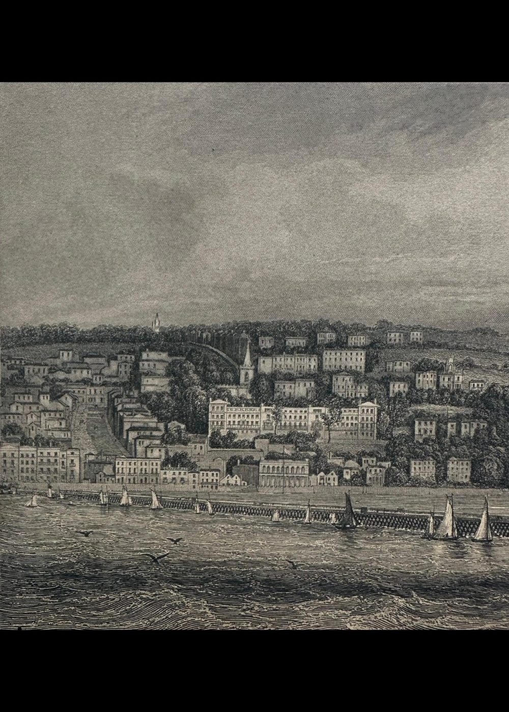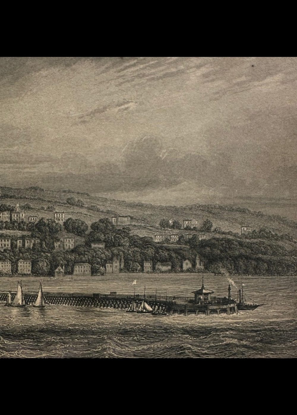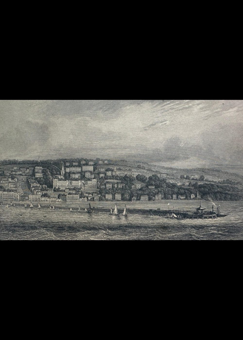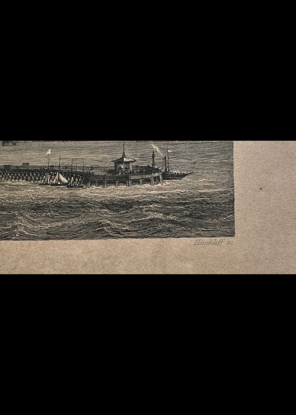This is a vintage engraved illustration titled “Ryde. View of the Pier” depicting the seaside town of Ryde, located on the northeast coast of the Isle of Wight, England. The image showcases a panoramic view from the sea, looking toward the town with its many Georgian and Victorian-style buildings nestled on a gently rising hillside. The Ryde Pier, one of the oldest seaside piers in the UK, stretches into the water, lined with sailboats and a small pavilion or landing station at its end. The surrounding waters are calm, with subtle waves rendered in fine engraving detail. Above, the sky is cloudy yet serene, adding atmosphere to the historic maritime scene. This artwork likely dates back to the 19th century and captures the charm and character of Ryde during the height of its popularity as a Victorian seaside resort.