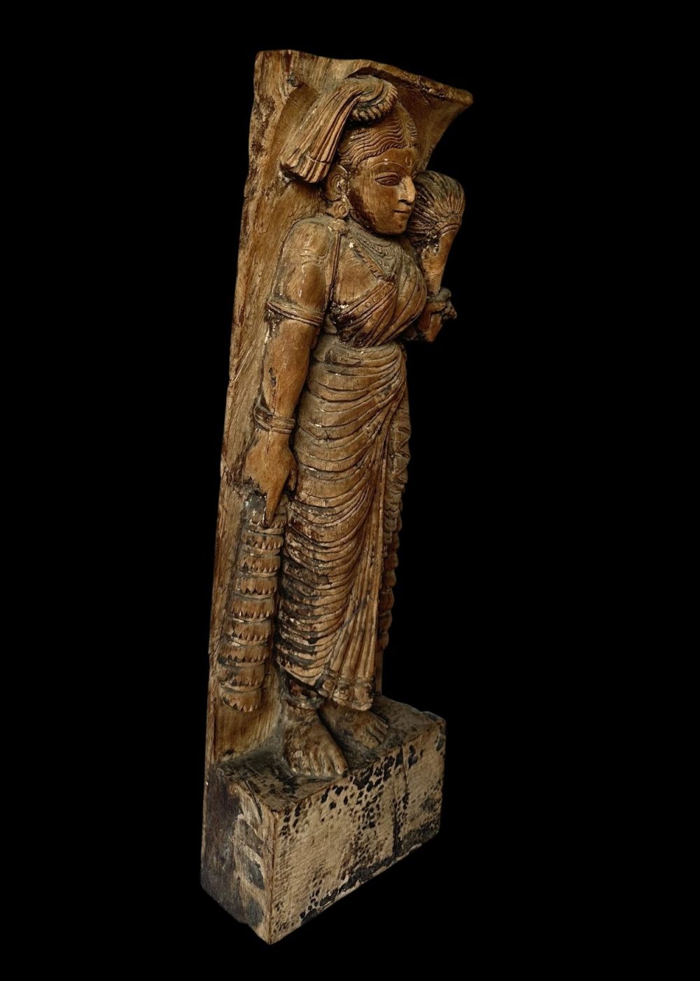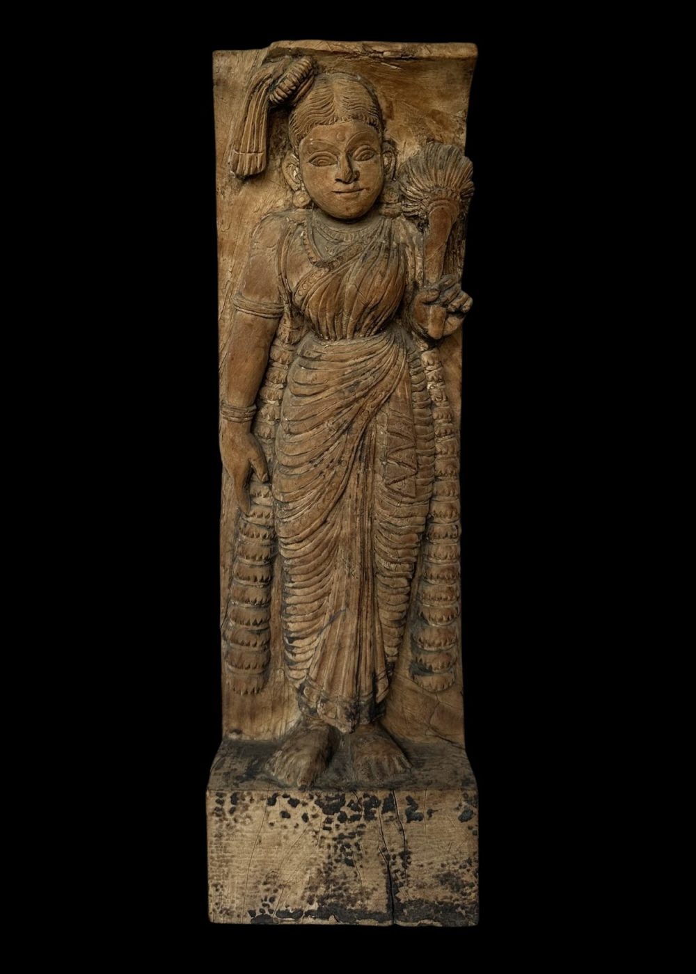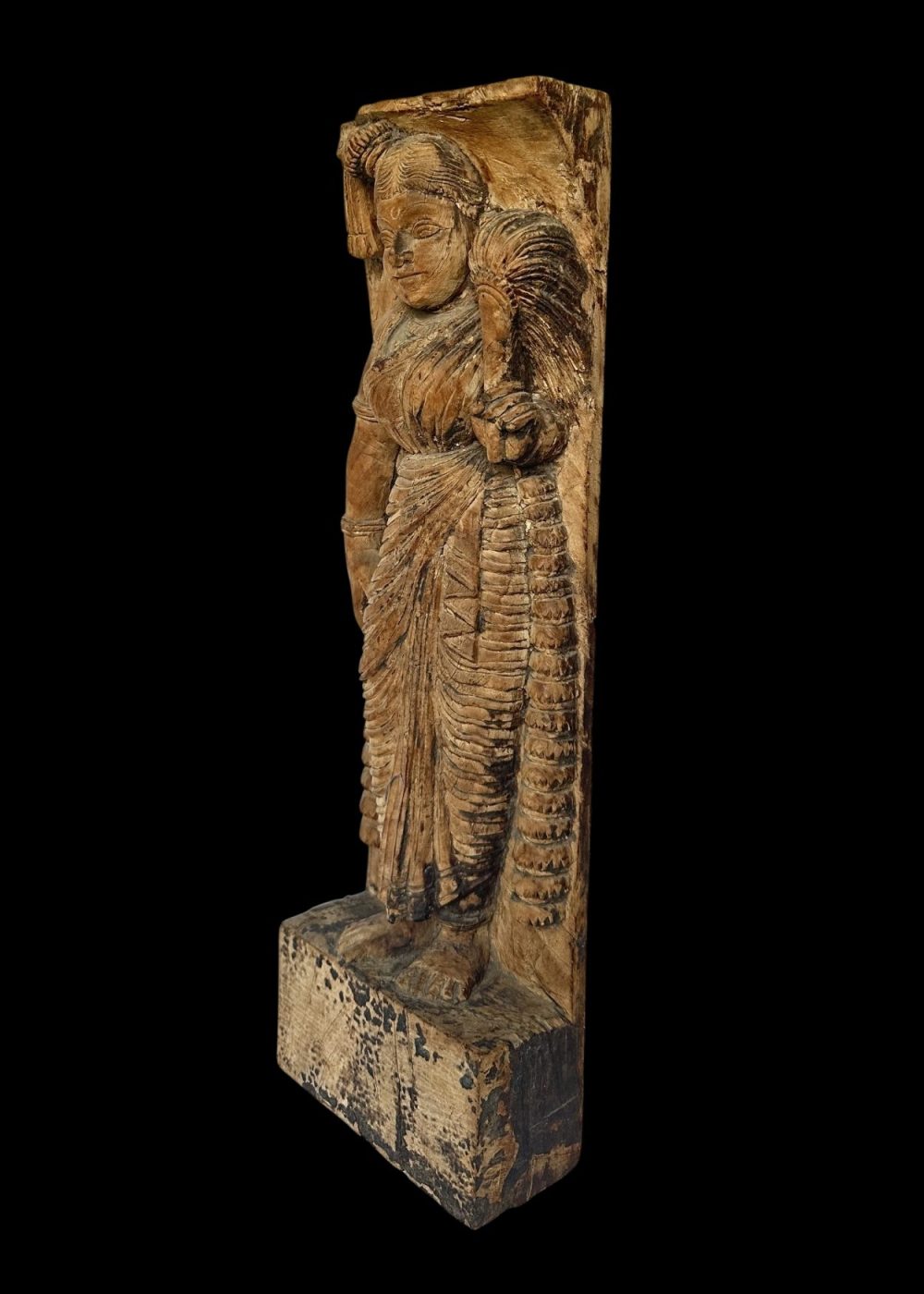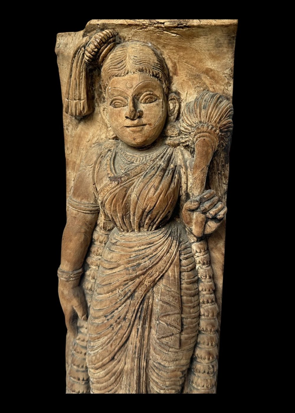This 20th-century wooden chariot panel from Tamil Nadu depicts a graceful female figure, possibly a temple dancer or celestial maiden, holding a sheaf of grain or ceremonial item. Dressed in traditional attire with finely detailed jewelry and drapery, the figure embodies elegance and cultural reverence. As part of a ceremonial chariot, this panel highlights the region’s vibrant tradition of temple art, where such figures symbolize devotion, prosperity, and divine celebration during religious processions.