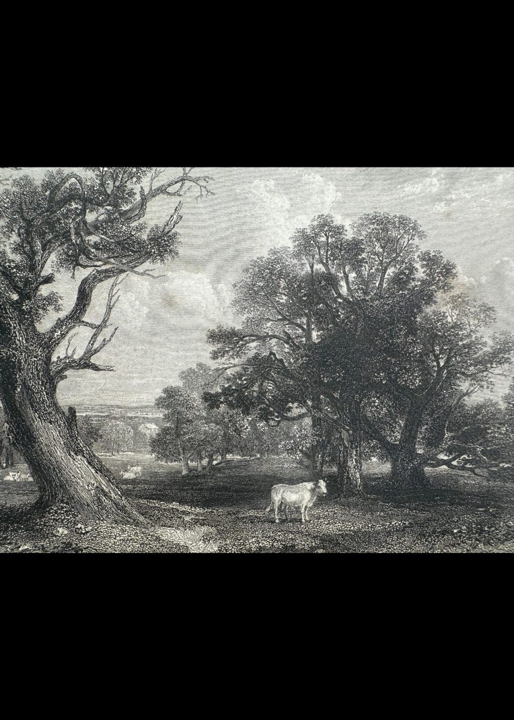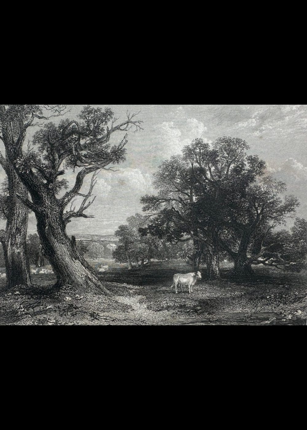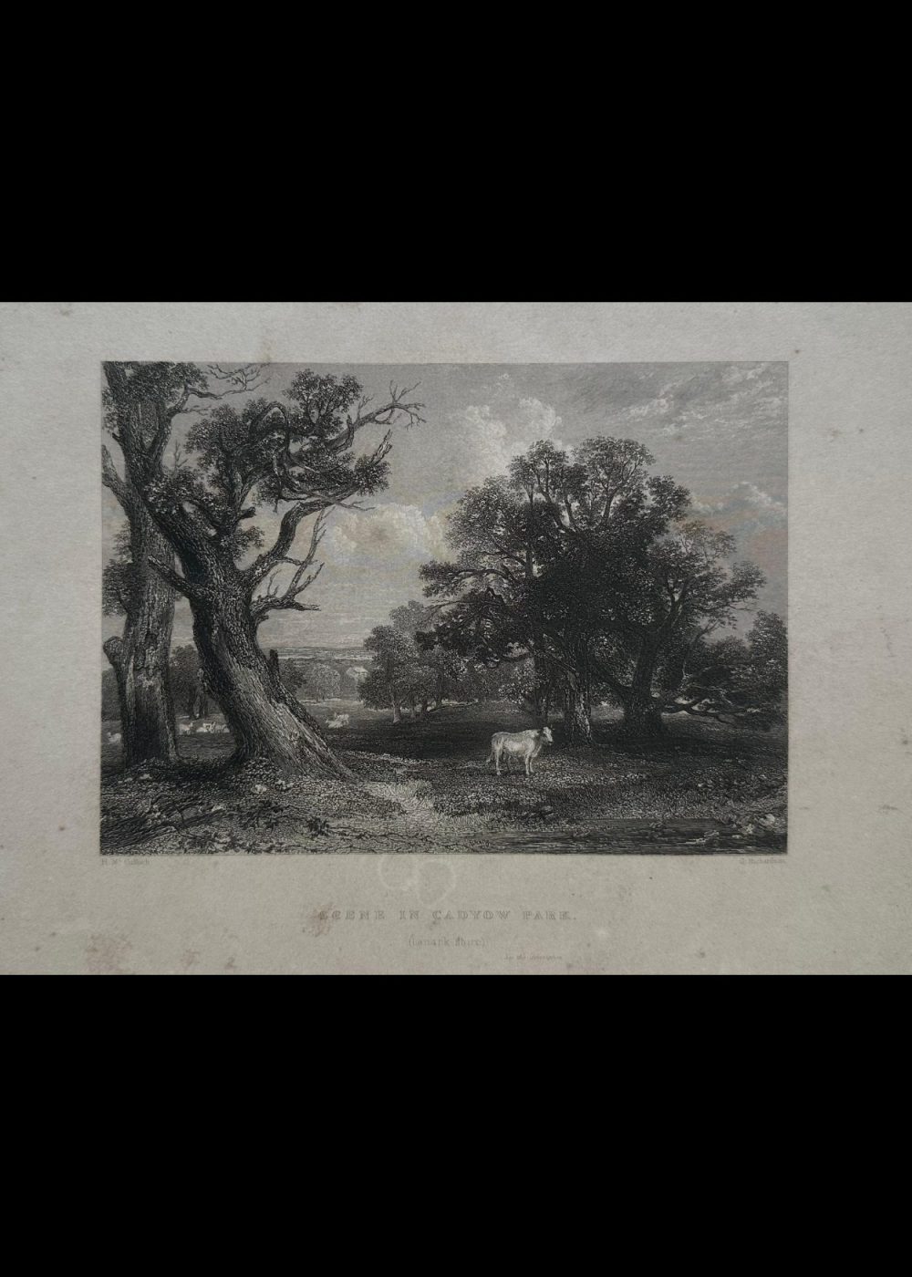 London, published for the proprietors by gen Geo. Virtue, 26, Ivy Lame, 1838. This detailed engraving depicts a tranquil woodland scene in Cadzow Park, Lanarkshire. Dominated by ancient, gnarled trees, the composition features a solitary white cow standing in the dappled shade, while other cattle graze in the distance. The artwork captures the park’s pastoral charm and rich natural beauty. Engraved by G. Richardson after a work by H. W. Callcott.