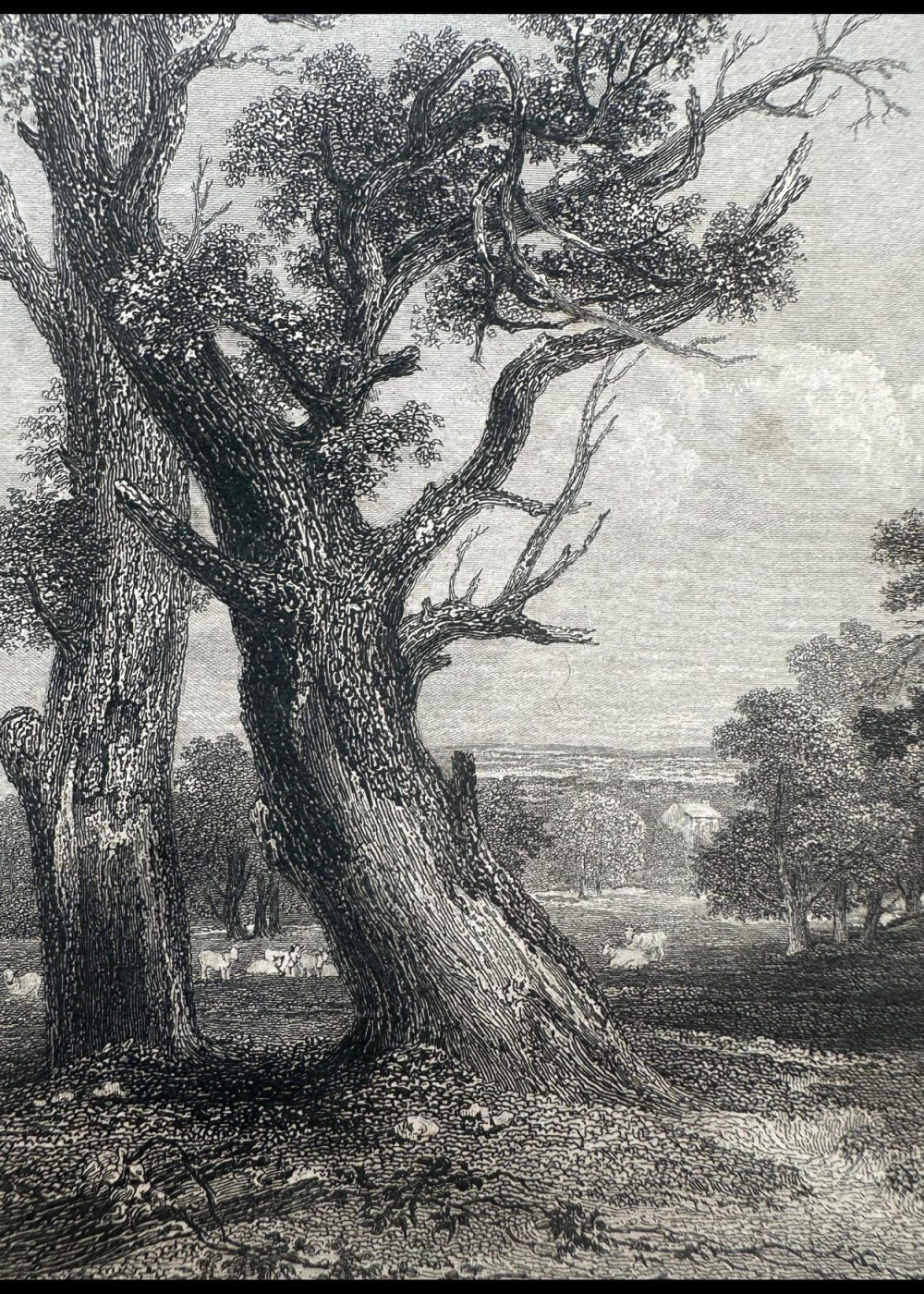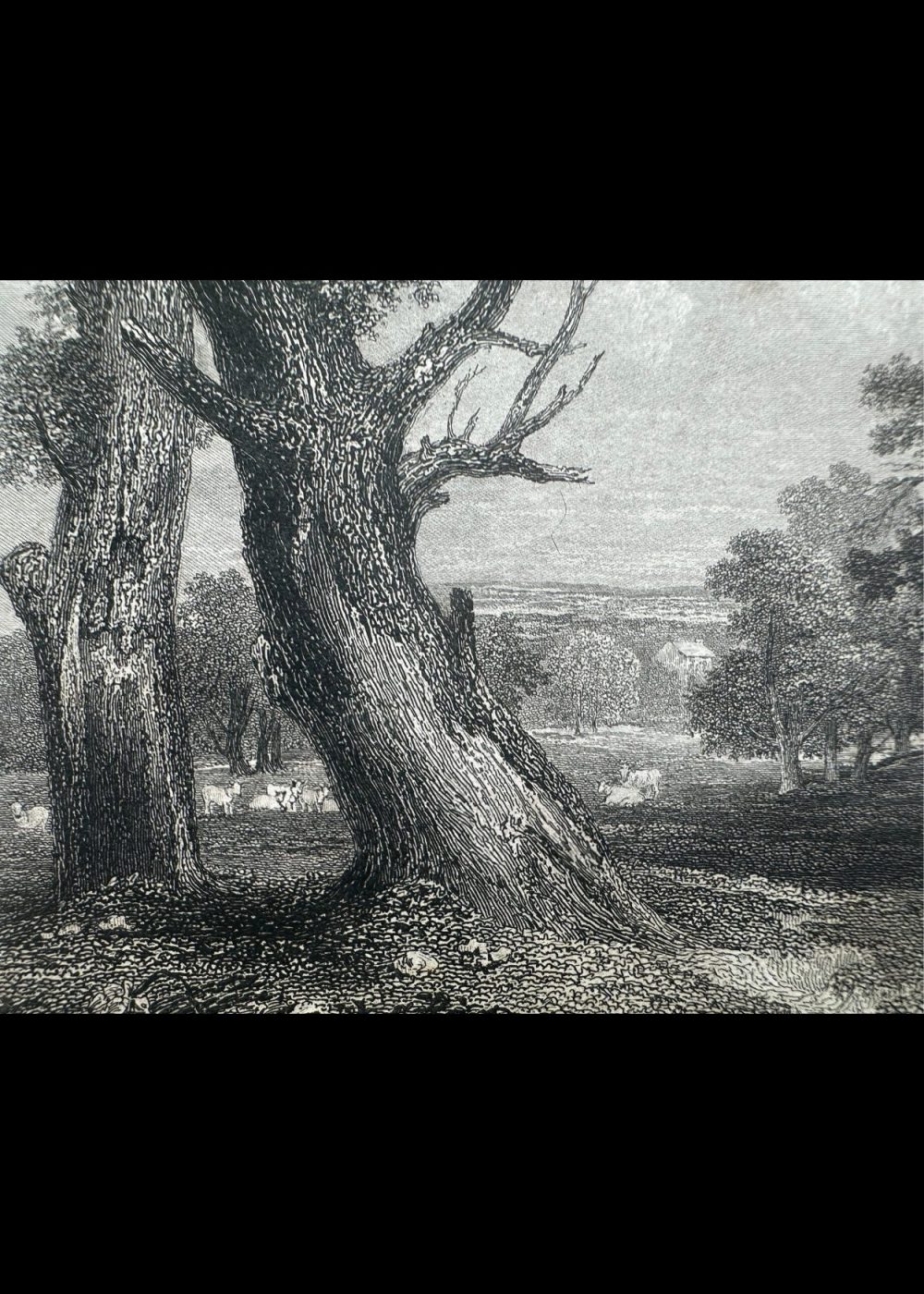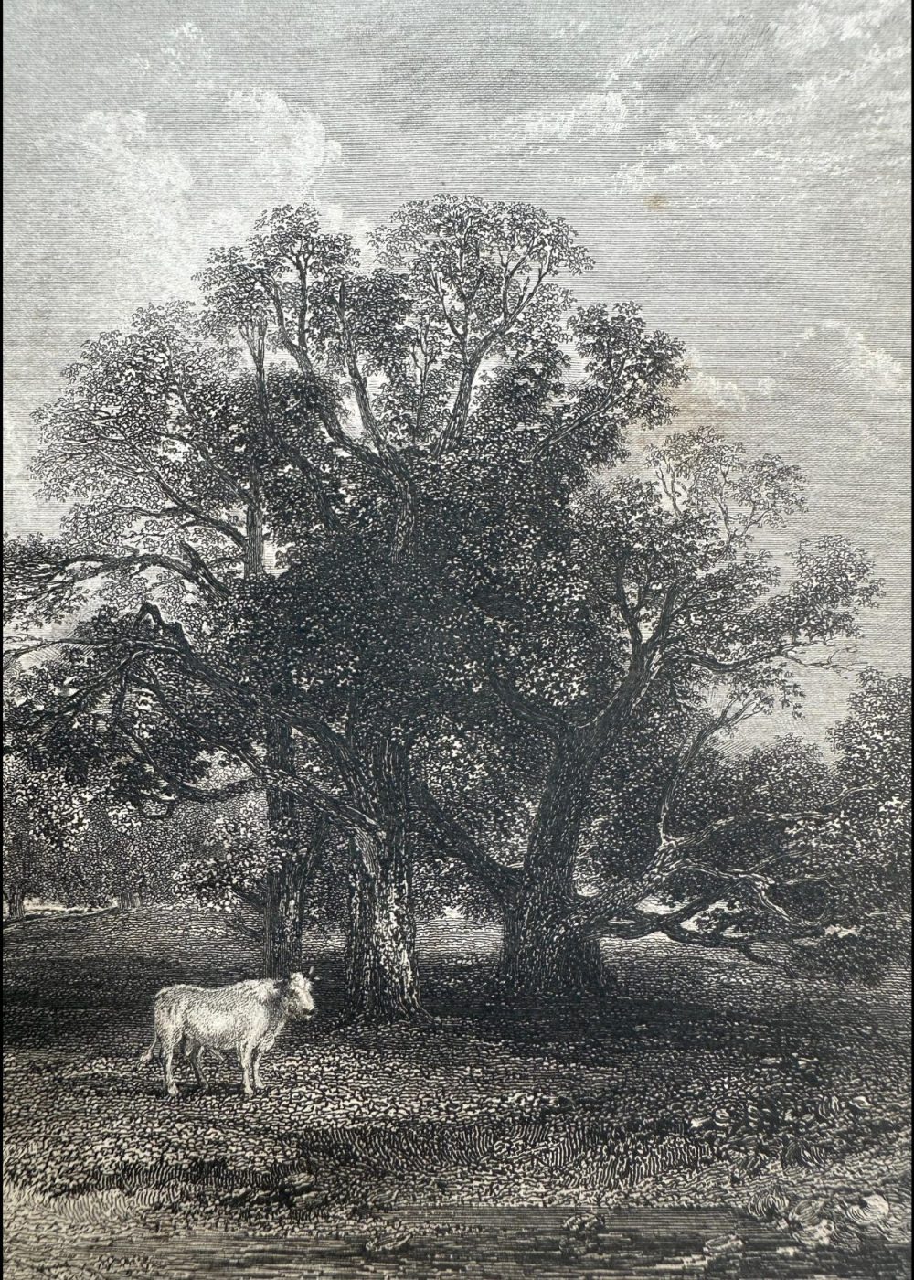 London, published for the proprietors by gen Geo. Virtue, 26, Ivy Lame, 1838. This detailed engraving depicts a tranquil woodland scene in Cadzow Park, Lanarkshire. Dominated by ancient, gnarled trees, the composition features a solitary white cow standing in the dappled shade, while other cattle graze in the distance. The artwork captures the park’s pastoral charm and rich natural beauty. Engraved by G. Richardson after a work by H. W. Callcott.