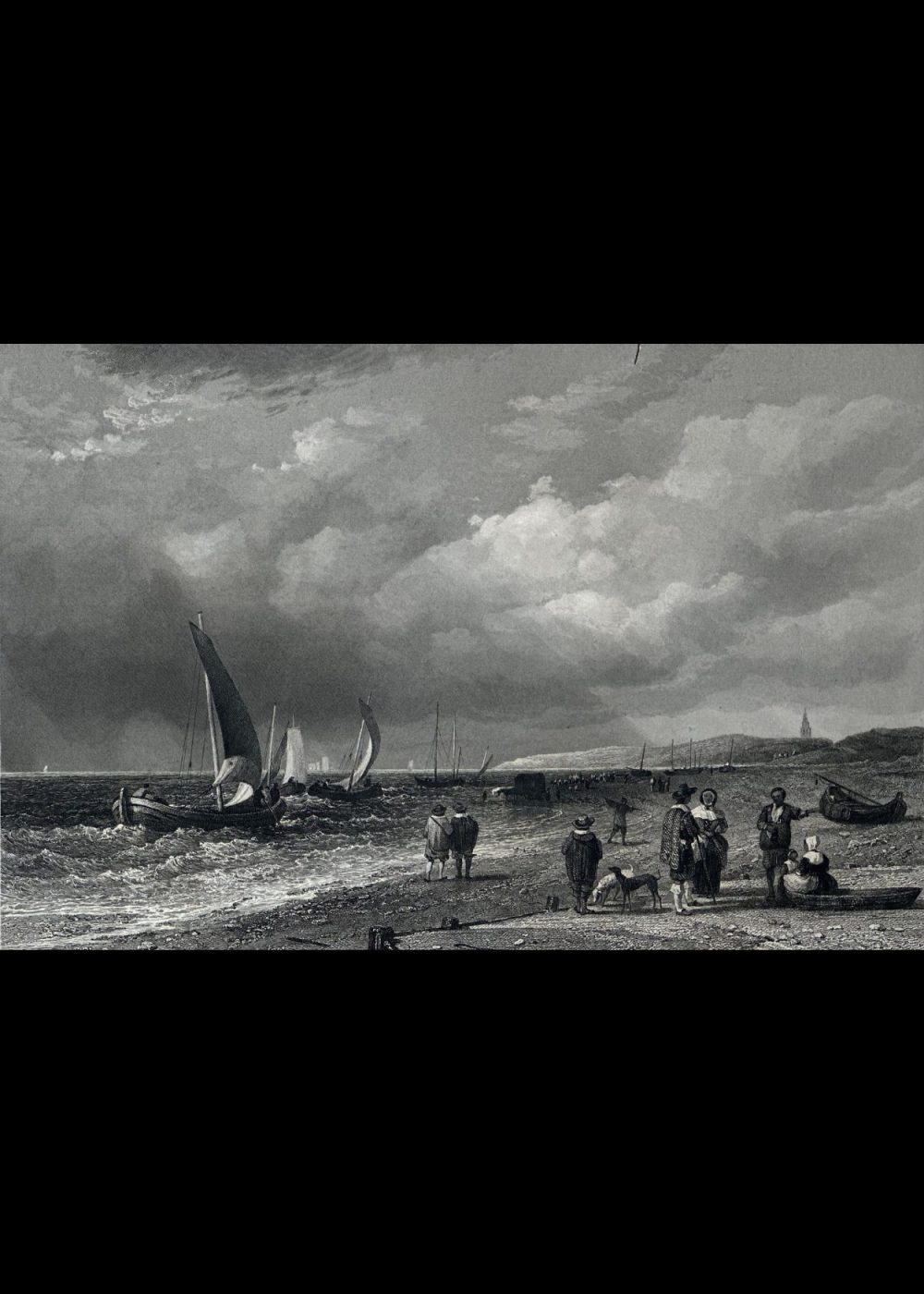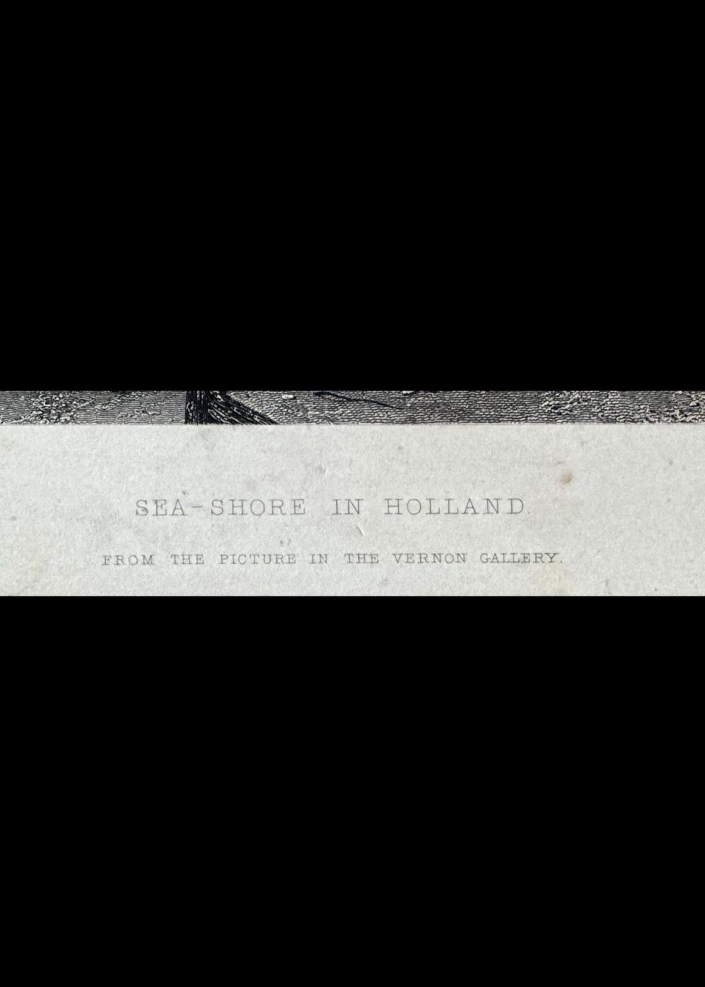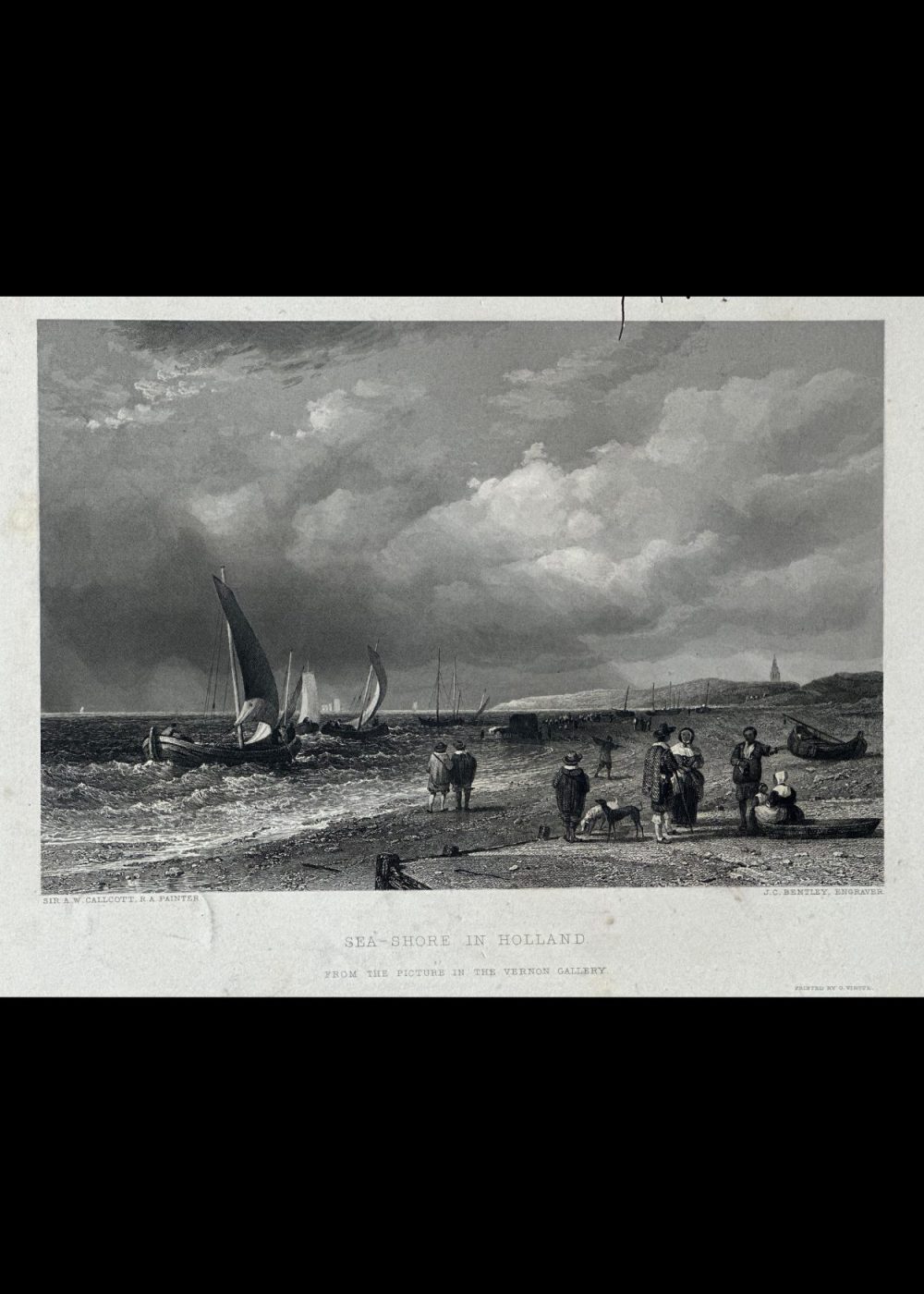 This engraving, after a painting by Sir A.W. Callcott, R.A., depicts a bustling Dutch shoreline under a dramatic sky. Sailing boats with billowing sails approach the shore, while groups of people and animals animate the sandy beach. The scene captures the daily life and maritime spirit of Holland, balancing natural grandeur with human activity. Engraved by J.C. Bentley, the work reflects both atmospheric depth and fine detail, evoking the timeless connection between sea and shore.