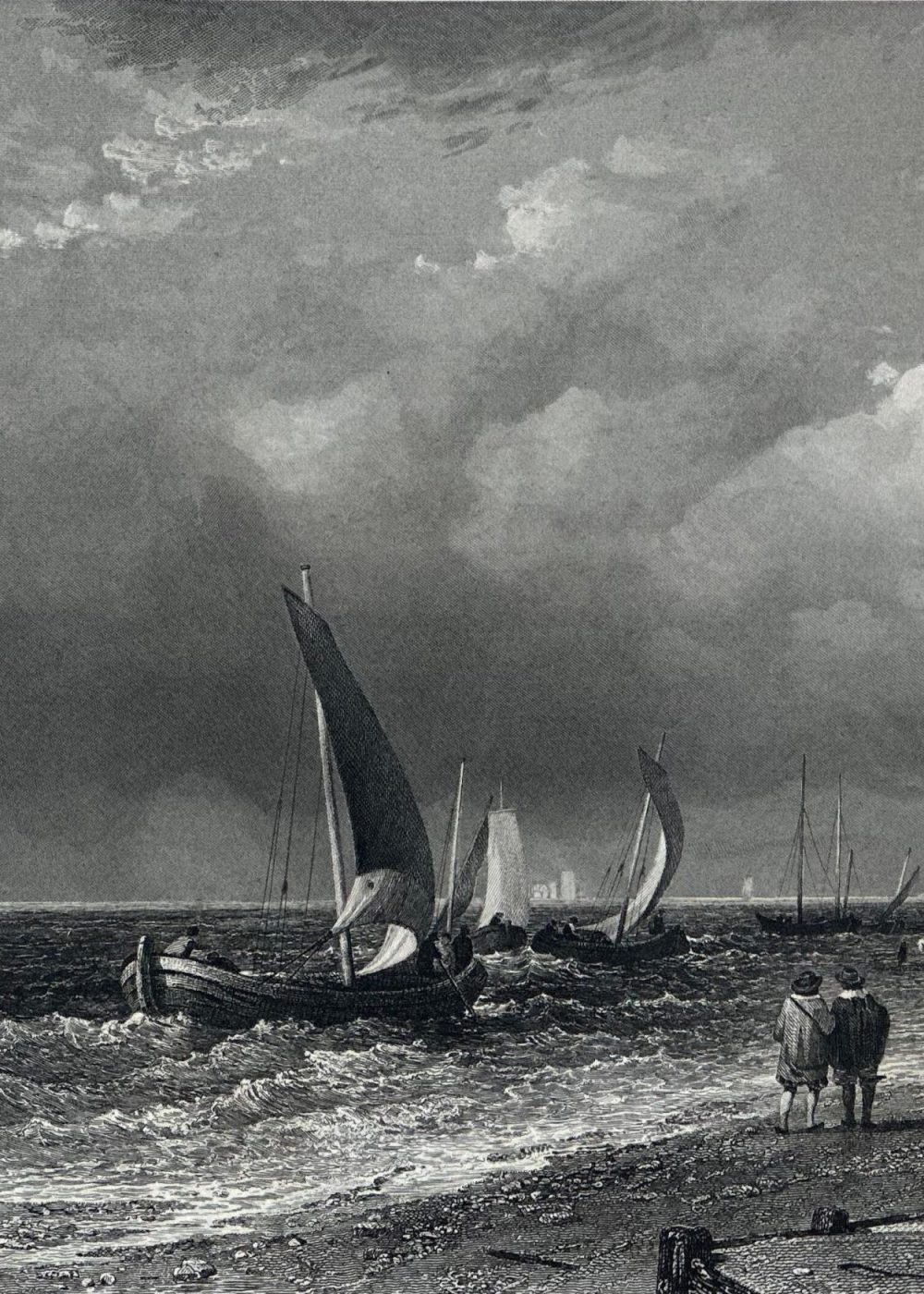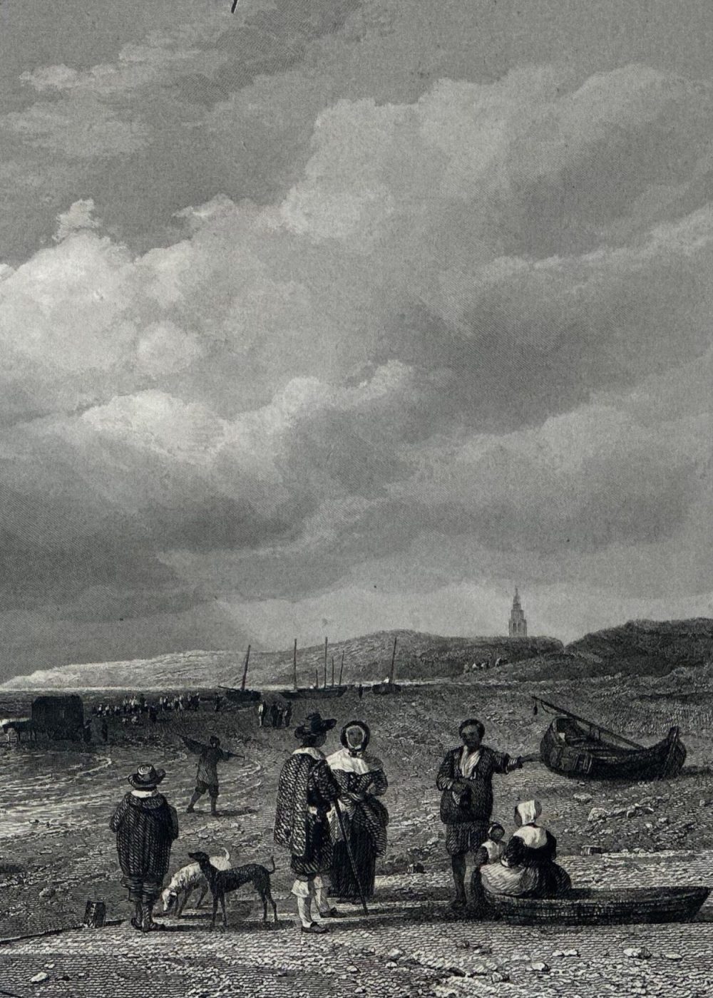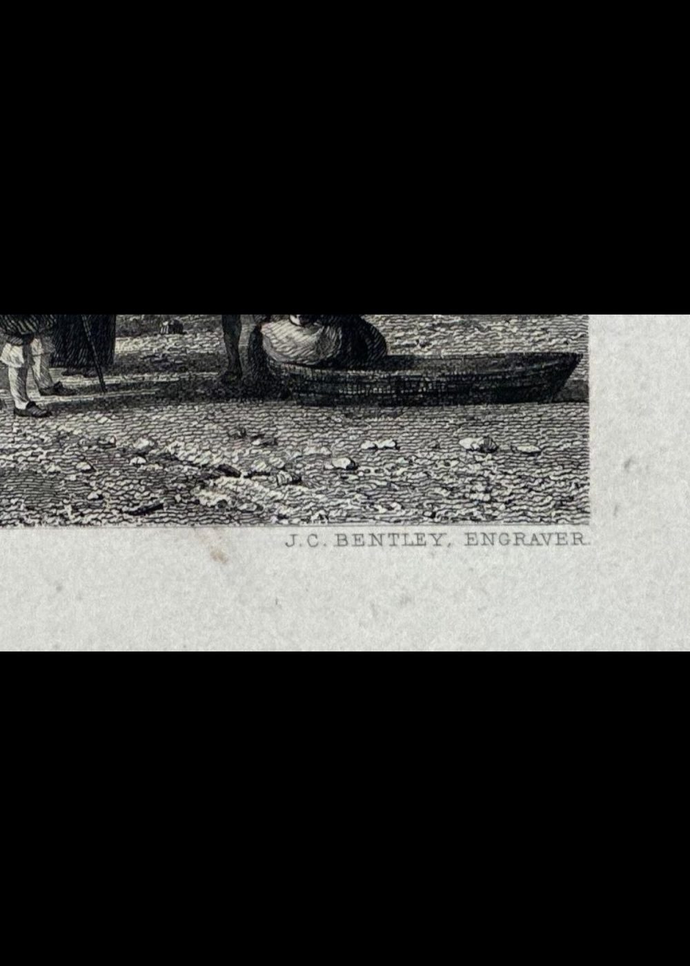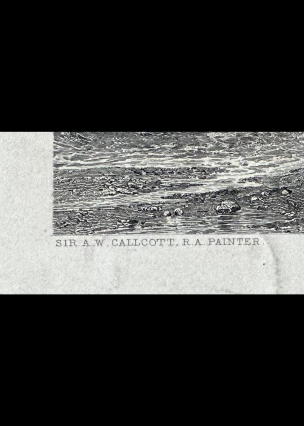 This engraving, after a painting by Sir A.W. Callcott, R.A., depicts a bustling Dutch shoreline under a dramatic sky. Sailing boats with billowing sails approach the shore, while groups of people and animals animate the sandy beach. The scene captures the daily life and maritime spirit of Holland, balancing natural grandeur with human activity. Engraved by J.C. Bentley, the work reflects both atmospheric depth and fine detail, evoking the timeless connection between sea and shore.