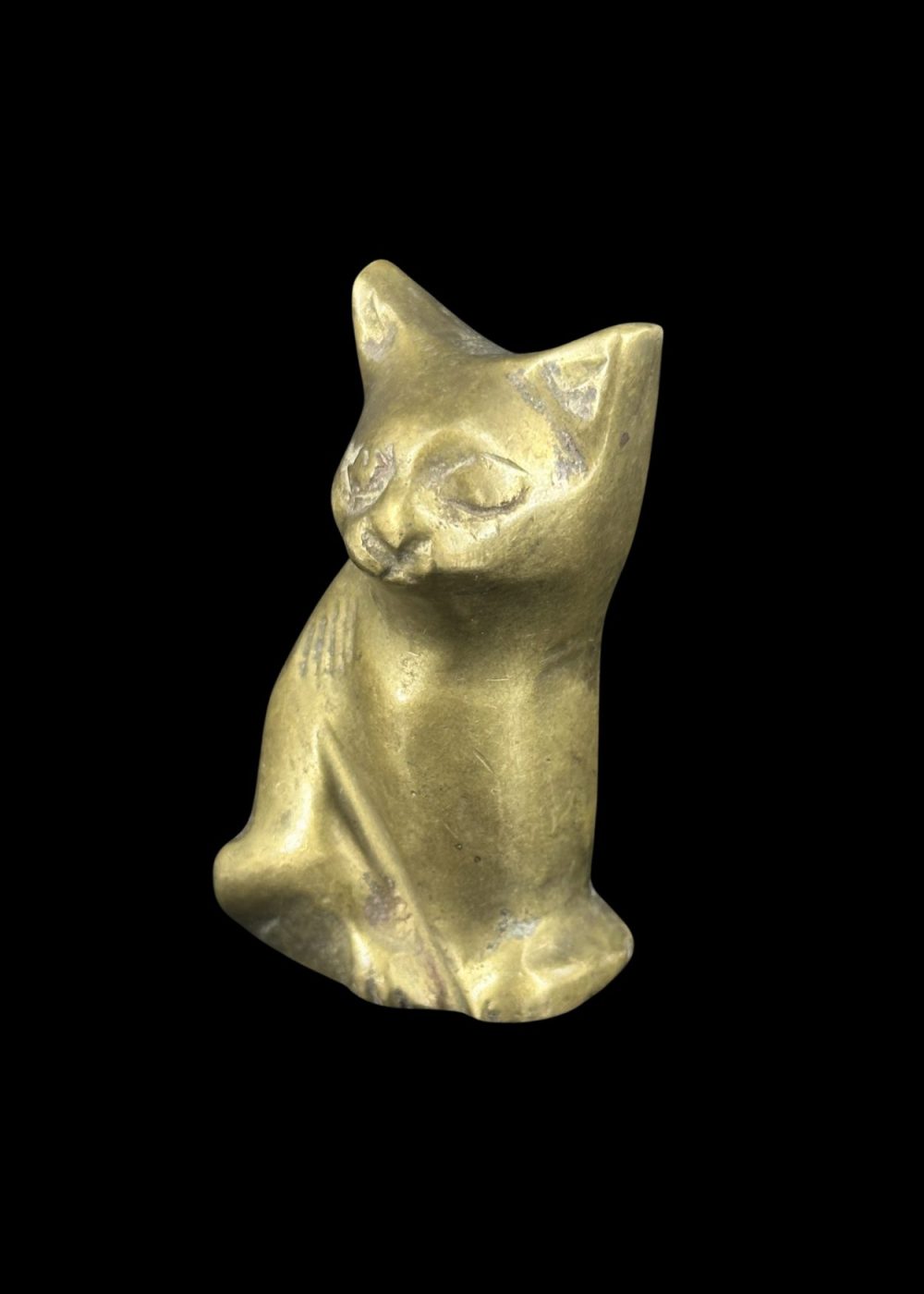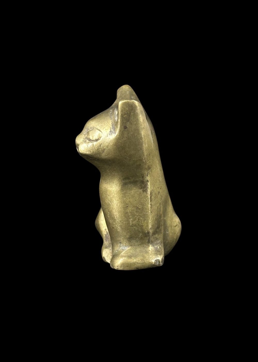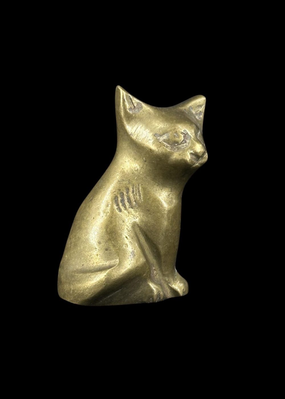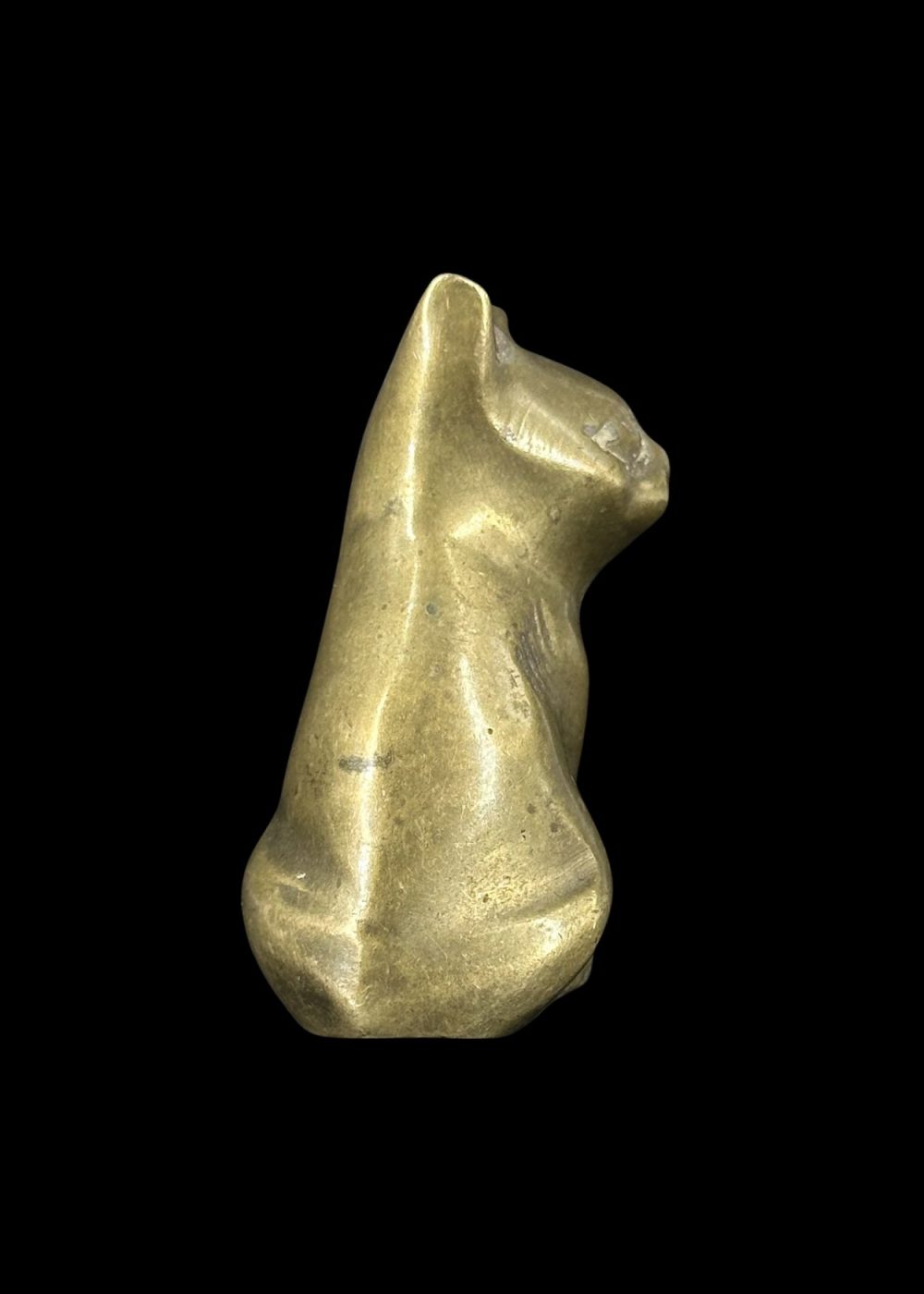 A small bronze figurine of a seated cat, characterized by its smooth surface and understated detailing. Subtle incised lines along the back suggest fur texture, while the overall form emphasizes elegance and poise. The piece reflects minimalist design principles and enduring appeal in decorative bronze work.