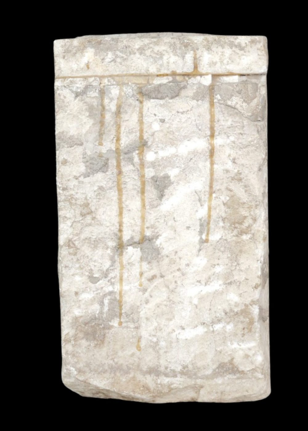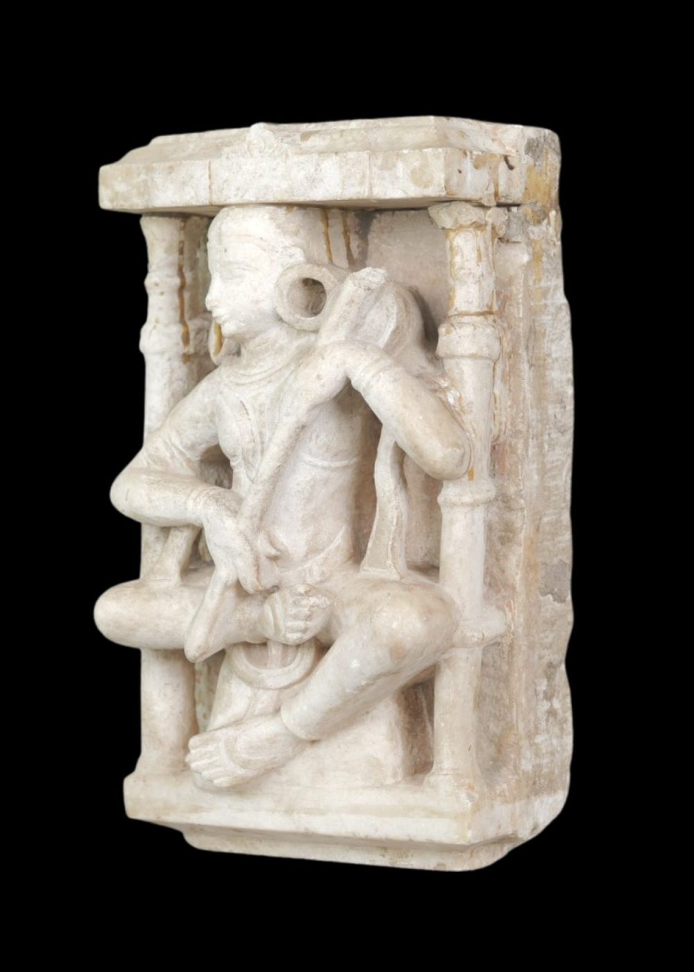This ancient stone sculpture depicts a seated deity in a cross-legged posture, holding a mace-like object in one hand—a gesture symbolizing strength or divine authority. Framed by two pillar-like elements, the figure is integrated into an architectural niche, suggesting its original placement within a temple or shrine. Intricate carvings highlight the deity’s ornaments and attire, while the weathered surface speaks to the artifact’s age and enduring devotional significance.