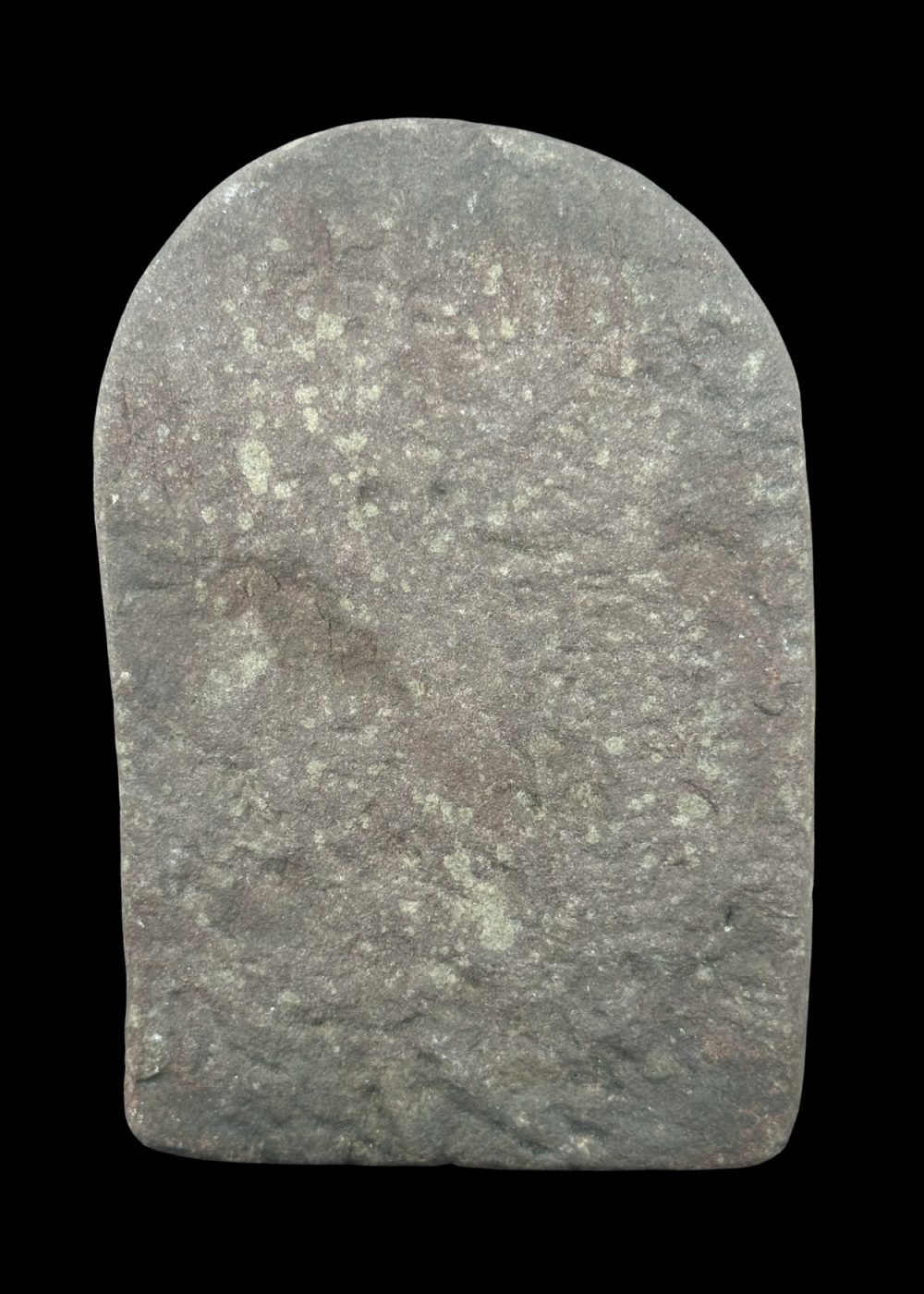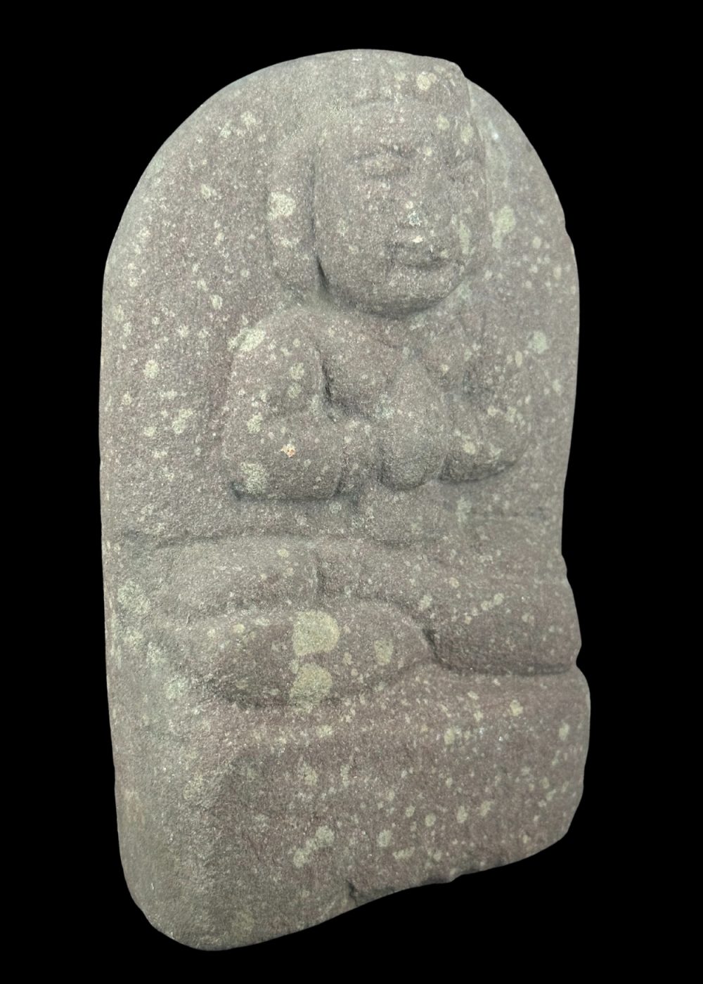 This Seated Figure in Meditation, Stone Sculpture Carved from a single block of speckled stone, this sculpture depicts a figure seated in a meditative posture, hands gently positioned in front—possibly in a gesture of prayer or dhyana (contemplation). The form is compact and symmetrical, with minimal ornamentation, emphasizing spiritual focus over decorative detail. The weathered surface and subdued palette of grays and whites suggest age and prolonged exposure, enhancing its aura of quiet reverence. Likely rooted in a religious or philosophical tradition, the sculpture embodies themes of inner stillness and devotion.