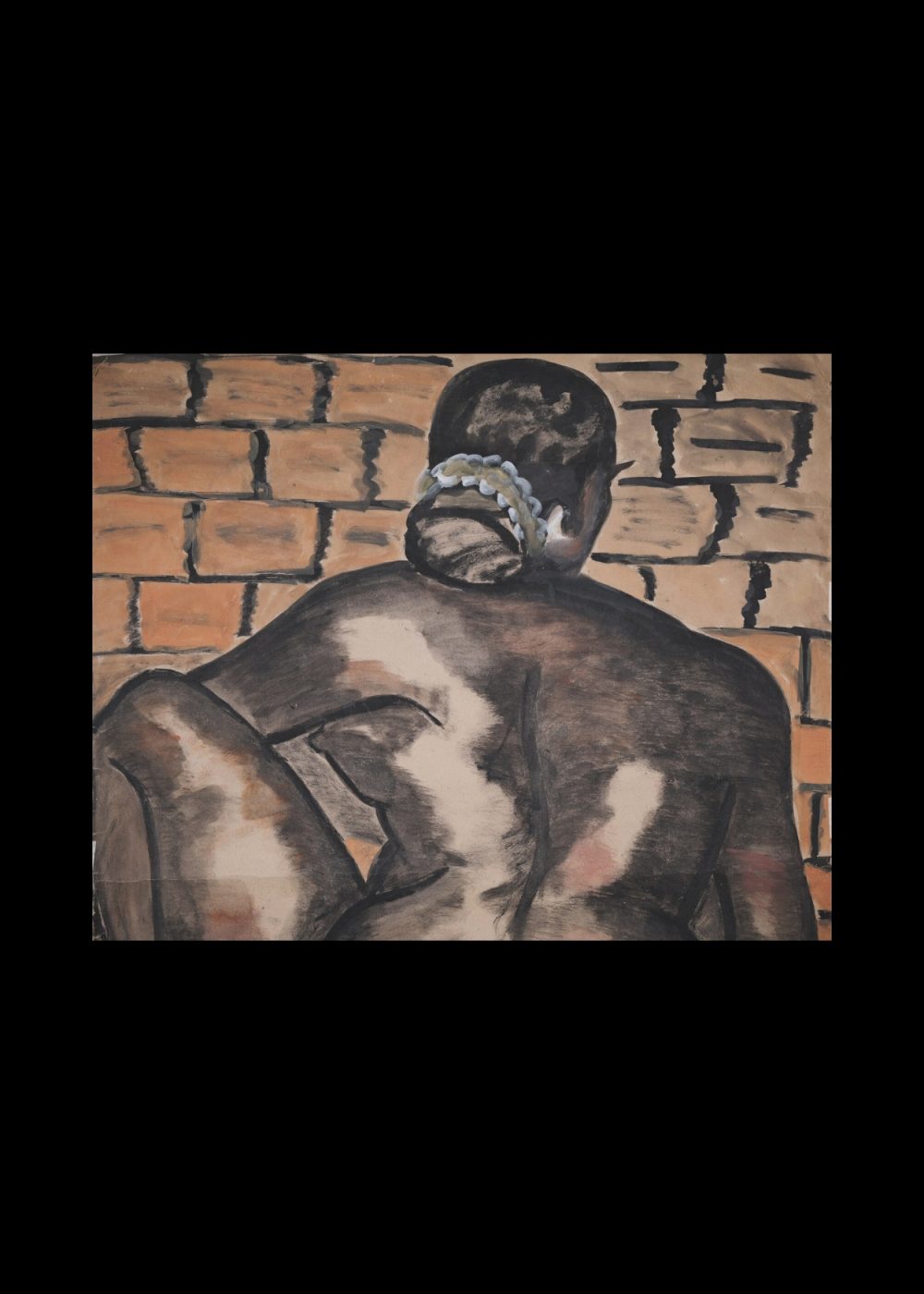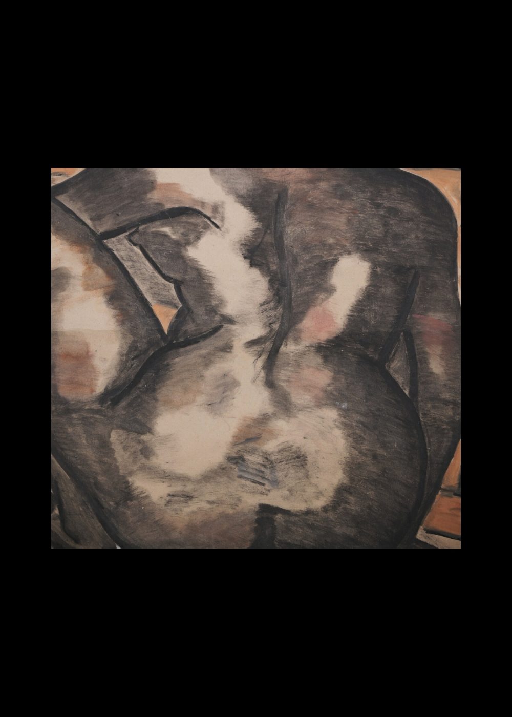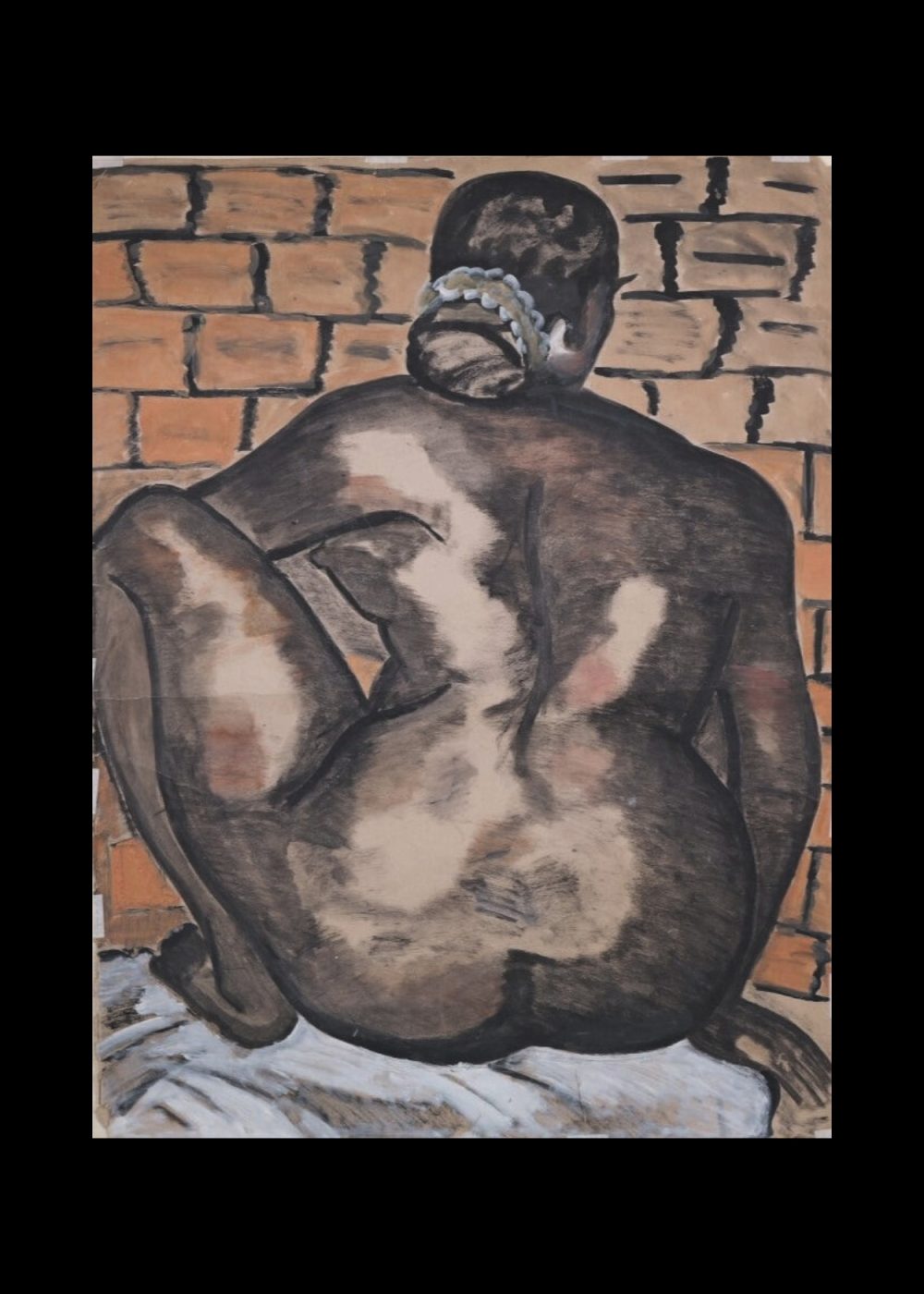 This bold and earthy composition presents a nude female figure seated with her back to the viewer, framed against a textured brick wall. The subject’s pose is dynamic, with one leg raised and the body slightly turned, accentuating the muscular form and curvature. The tonal variations in the skin are rendered with expressive brushstrokes, highlighting naturalism while retaining an impressionistic rawness. A subtle hair accessory adds a delicate touch. The choice of a minimal setting and natural posture emphasizes both vulnerability and strength, reflecting a modernist exploration of the human form. The work is likely influenced by or attributed to the Indian artist Krishnaji Howlaji Ara (ARA), known for his powerful nude studies.
