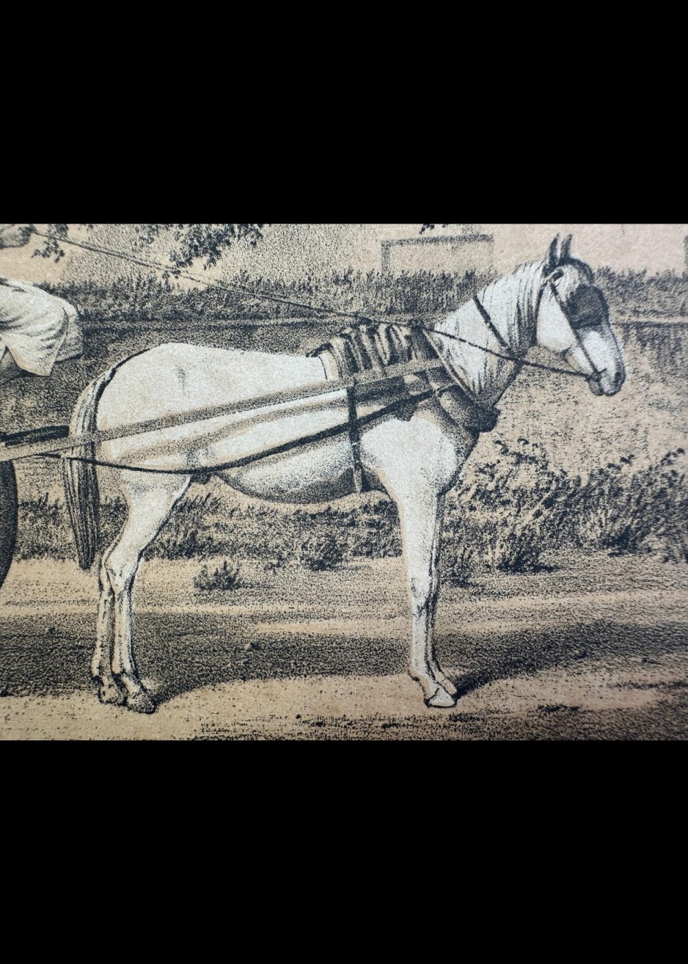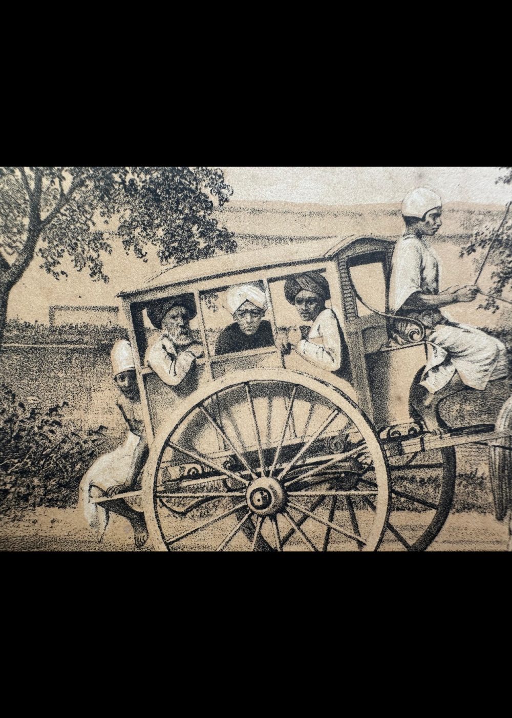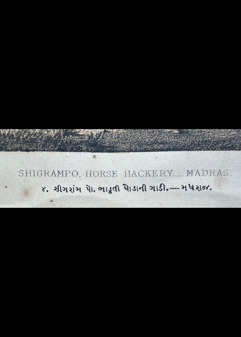 This cromo-lithograph depicts a “Shigrampo,” a horse-drawn hackery (carriage), commonly used in Madras (now Chennai) during the 19th century. The image shows a horse hitched to a simple yet sturdy carriage, with several passengers inside, including an Indian driver riding along with them. The carriage is in motion, drawn by a white horse, while the backdrop includes trees and greenery, typical of the landscape of that era. The soft, sepia tones of the artwork add a historical feel, showcasing daily life and transportation in colonial India. The lithograph is signed by the artist Vincent Brooks and includes inscriptions in both English and Gujarati, as part of the “Travel of India” book, which highlights various aspects of colonial India’s infrastructure and daily life.