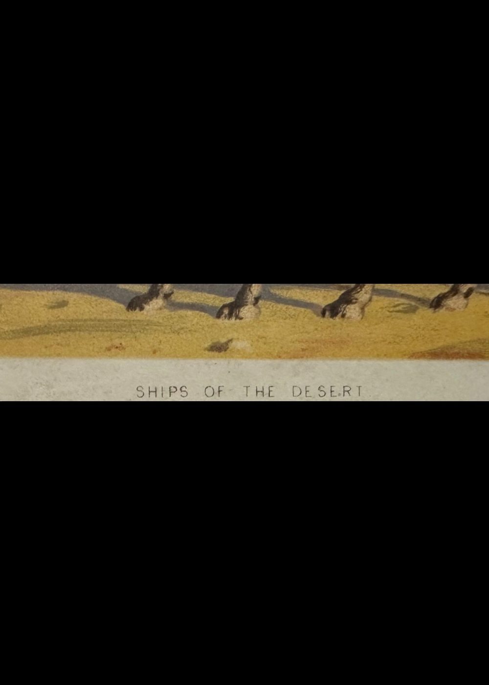 This 19th-century hand-colored lithograph titled “Ships of the Desert” presents a romanticized Orientalist portrayal of European women traveling through the arid landscapes of North Africa or the Middle East. The scene features two elegantly dressed women seated atop richly adorned camels, each shaded by parasols, evoking an air of refinement and leisure amid the harsh desert environment. Their camels are ornately caparisoned with tasseled blankets and decorative bridles.