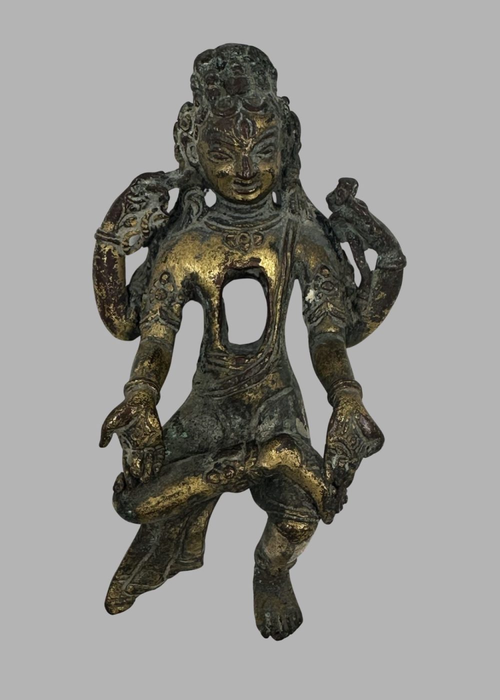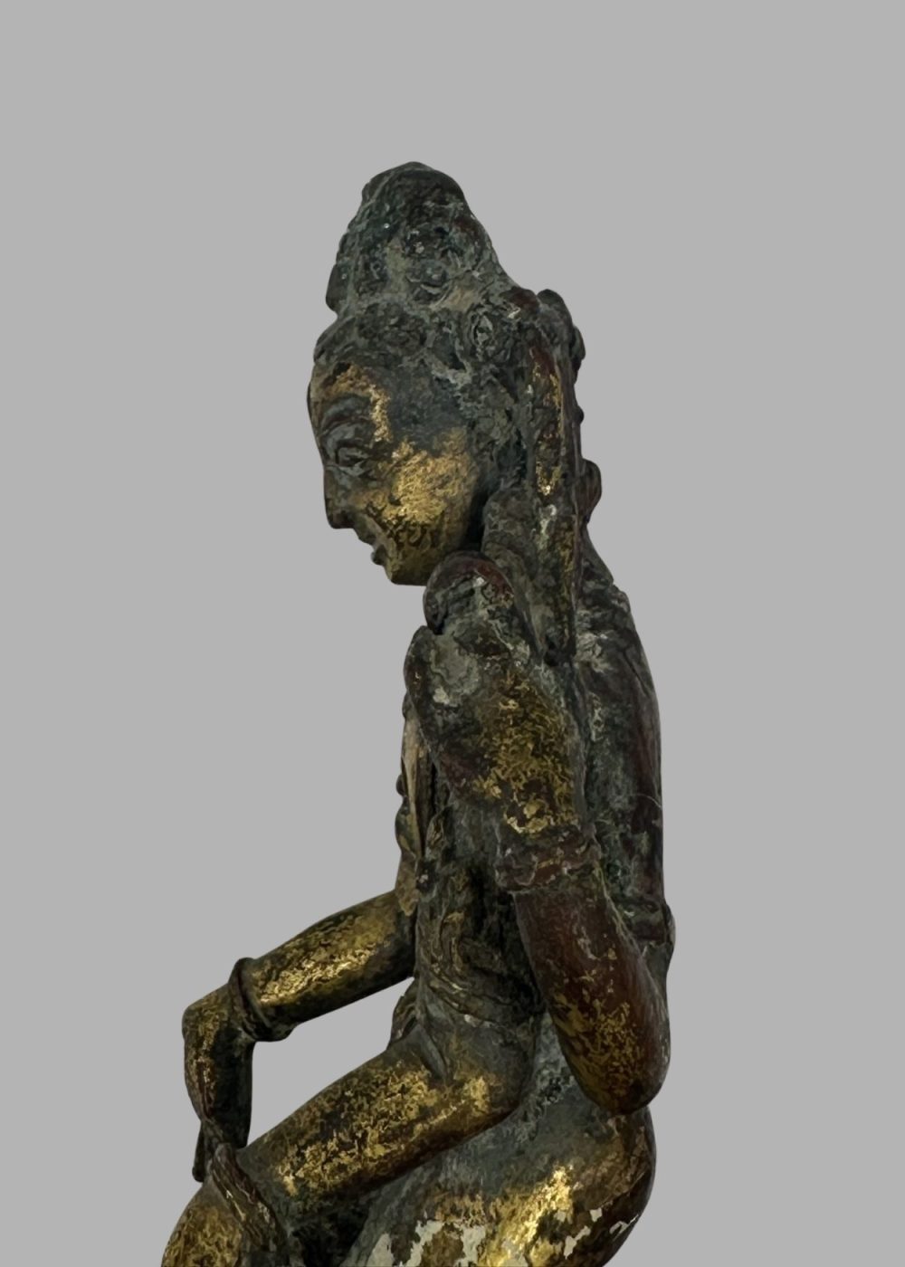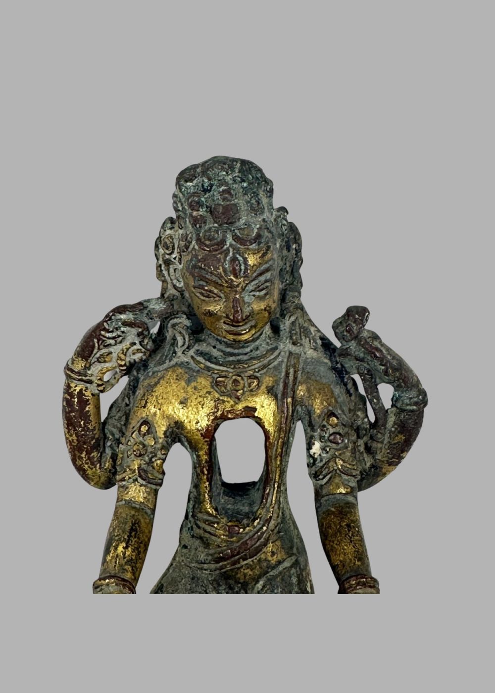 This gilt bronze sculpture from Nepal portrays Lord Shiva, one of the principal deities of Hinduism, captured in a seated posture of meditative poise and divine grace. Although the lotus base is now missing, Shiva’s form clearly suggests that it once belonged to a larger devotional ensemble or altar piece. Shiva is depicted with a benevolent expression, multiple arms bearing symbolic gestures (mudras) and attributes that once likely included a trident, drum, or serpent—all traditional emblems of his cosmic powers. The gilding, though partially worn, still shimmers with spiritual vitality, reflecting both the sacred function and exquisite craftsmanship of the piece. Ornamented with elaborate jewelry, a finely detailed crown, and flowing garments, the sculpture exemplifies the rich iconographic language of Himalayan art. The aged patina and traces of corrosion lend authenticity and historical depth, pointing to its prolonged use in ritual settings. This work stands as a testament to Nepal’s profound devotional traditions and masterful bronze casting techniques, embodying the spiritual and artistic richness of the Himalayan cultural landscape.