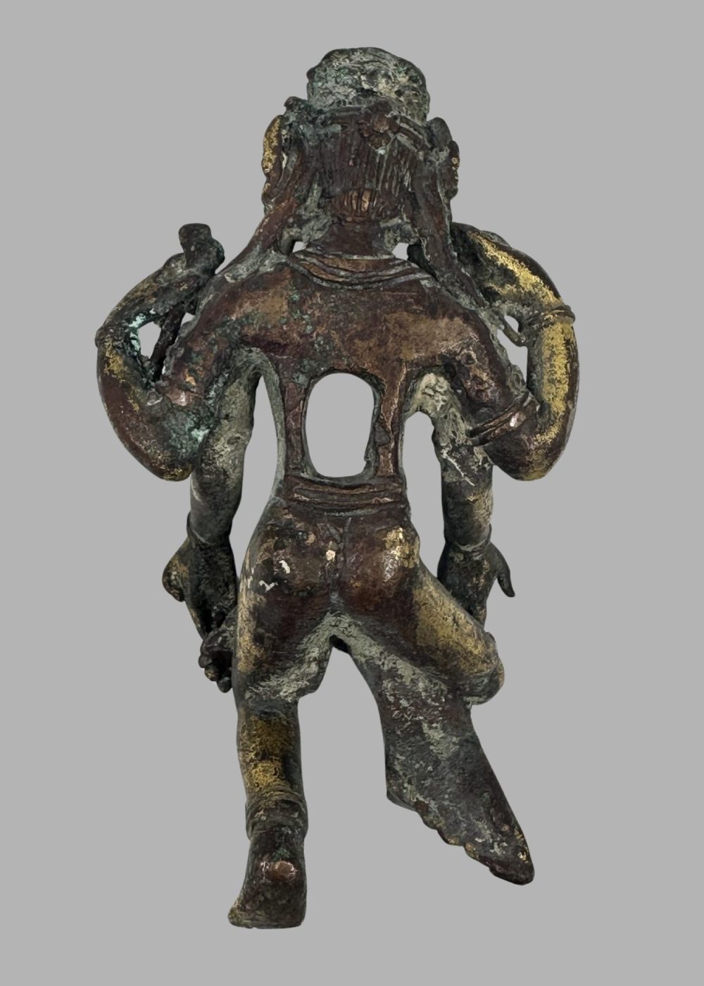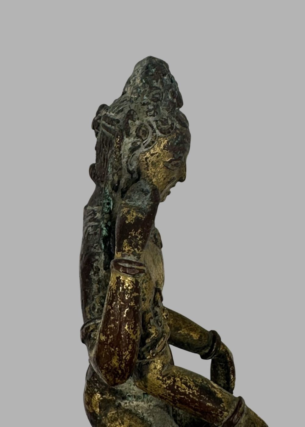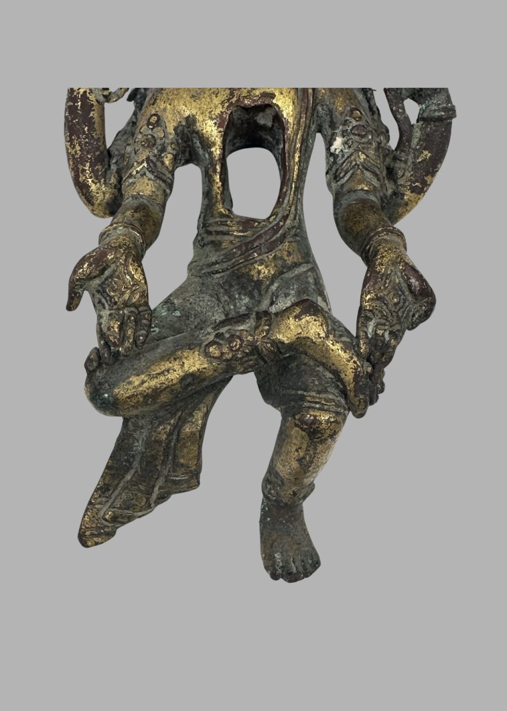 This gilt bronze sculpture from Nepal portrays Lord Shiva, one of the principal deities of Hinduism, captured in a seated posture of meditative poise and divine grace. Although the lotus base is now missing, Shiva’s form clearly suggests that it once belonged to a larger devotional ensemble or altar piece. Shiva is depicted with a benevolent expression, multiple arms bearing symbolic gestures (mudras) and attributes that once likely included a trident, drum, or serpent—all traditional emblems of his cosmic powers. The gilding, though partially worn, still shimmers with spiritual vitality, reflecting both the sacred function and exquisite craftsmanship of the piece. Ornamented with elaborate jewelry, a finely detailed crown, and flowing garments, the sculpture exemplifies the rich iconographic language of Himalayan art. The aged patina and traces of corrosion lend authenticity and historical depth, pointing to its prolonged use in ritual settings. This work stands as a testament to Nepal’s profound devotional traditions and masterful bronze casting techniques, embodying the spiritual and artistic richness of the Himalayan cultural landscape.