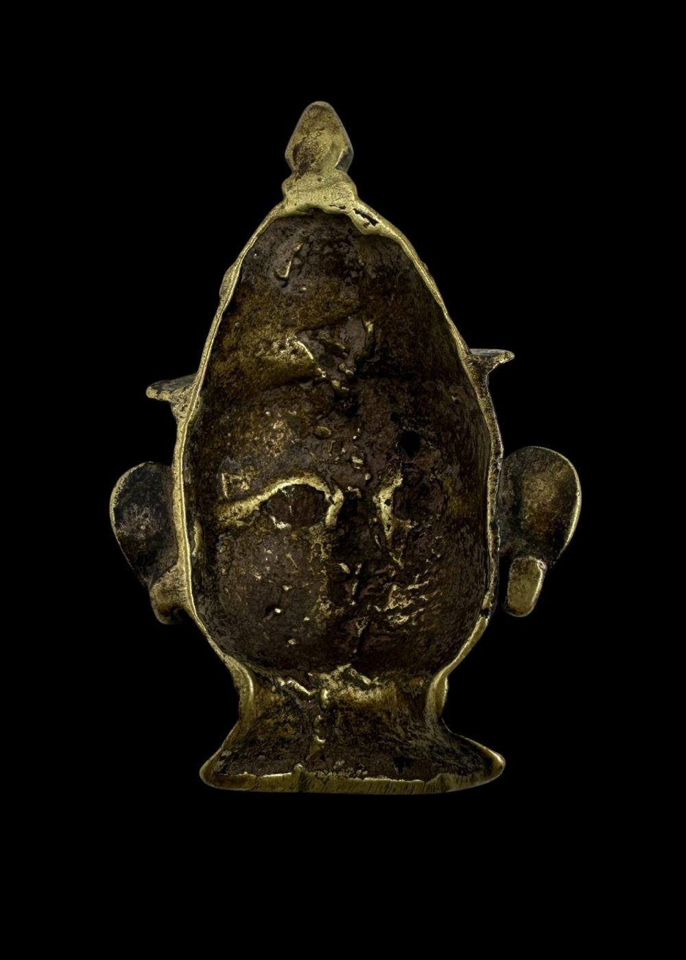 Brass sculpture of Lord Shiva’s head, featuring a composed expression with almond-shaped eyes, arched brows, and a prominent urna (third eye) at the forehead. The figure wears a conical headdress with incised detailing, flanked by large disc-shaped earrings and a stylized mustache—hallmarks of regional Maratha iconography. The smooth contours and gilded surface suggest use in domestic shrines or temple rituals, possibly as a mukhalinga (linga cover) to humanize the abstract form of Shiva. This piece reflects the folk devotional traditions of western India, blending spiritual symbolism with ornamental craftsmanship.