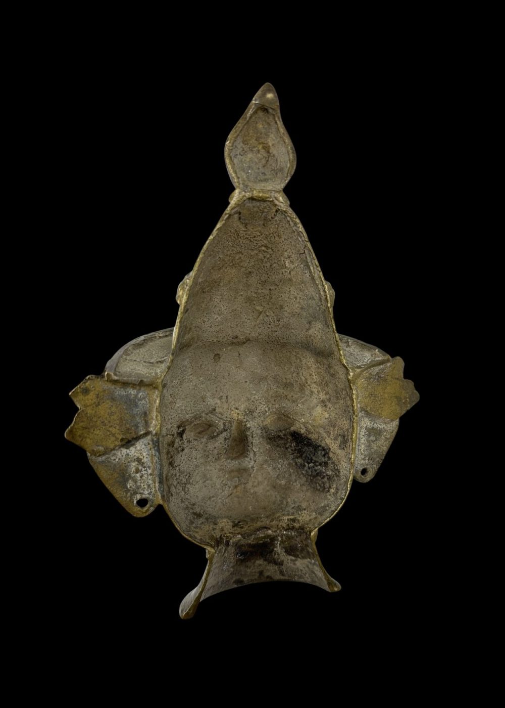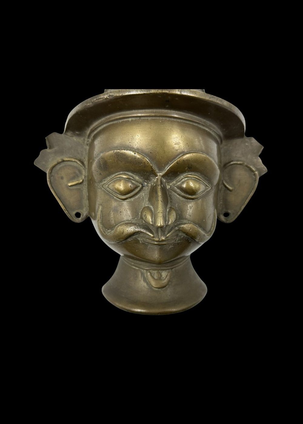 Brass sculpture of Lord Shiva’s head, possibly crafted as a mukhalinga—a linga cover featuring anthropomorphic features. The face is rendered with almond-shaped eyes, arched brows, and a composed expression, framed by a long curled mustache and wide ears. A conical headdress with decorative trim crowns the head, pierced with apertures possibly for ritual attachment. The stylized features and serene countenance reflect Maratha-period iconography, blending folk aesthetics with devotional symbolism. Likely used in temple rituals or domestic shrines, this piece embodies Shiva’s presence in a tangible, approachable form.