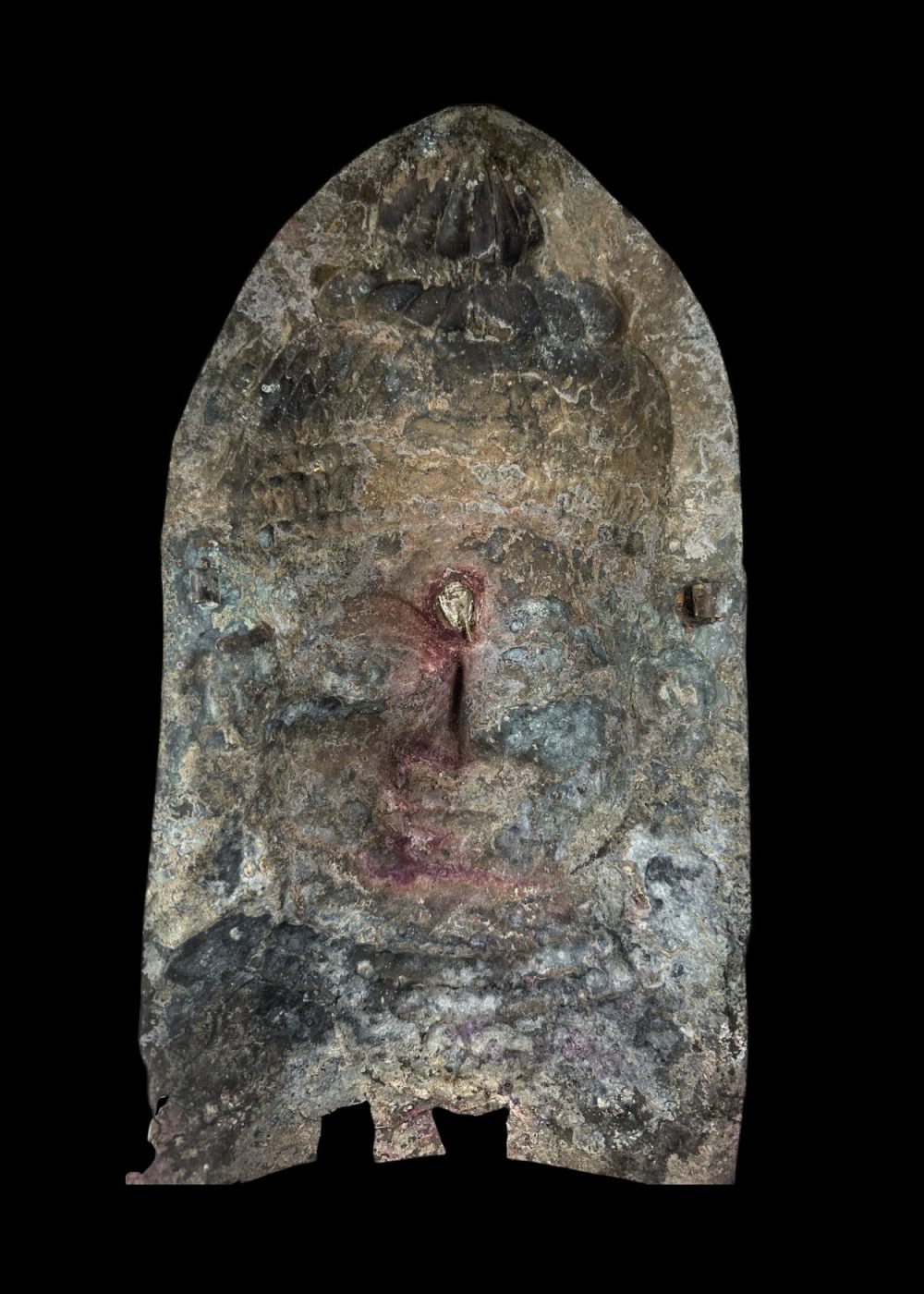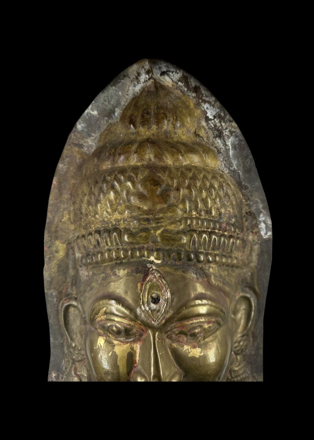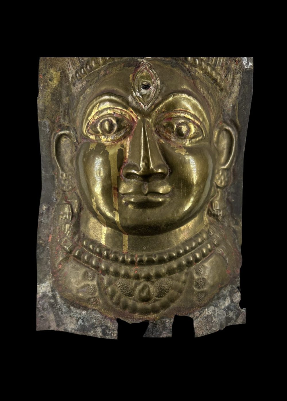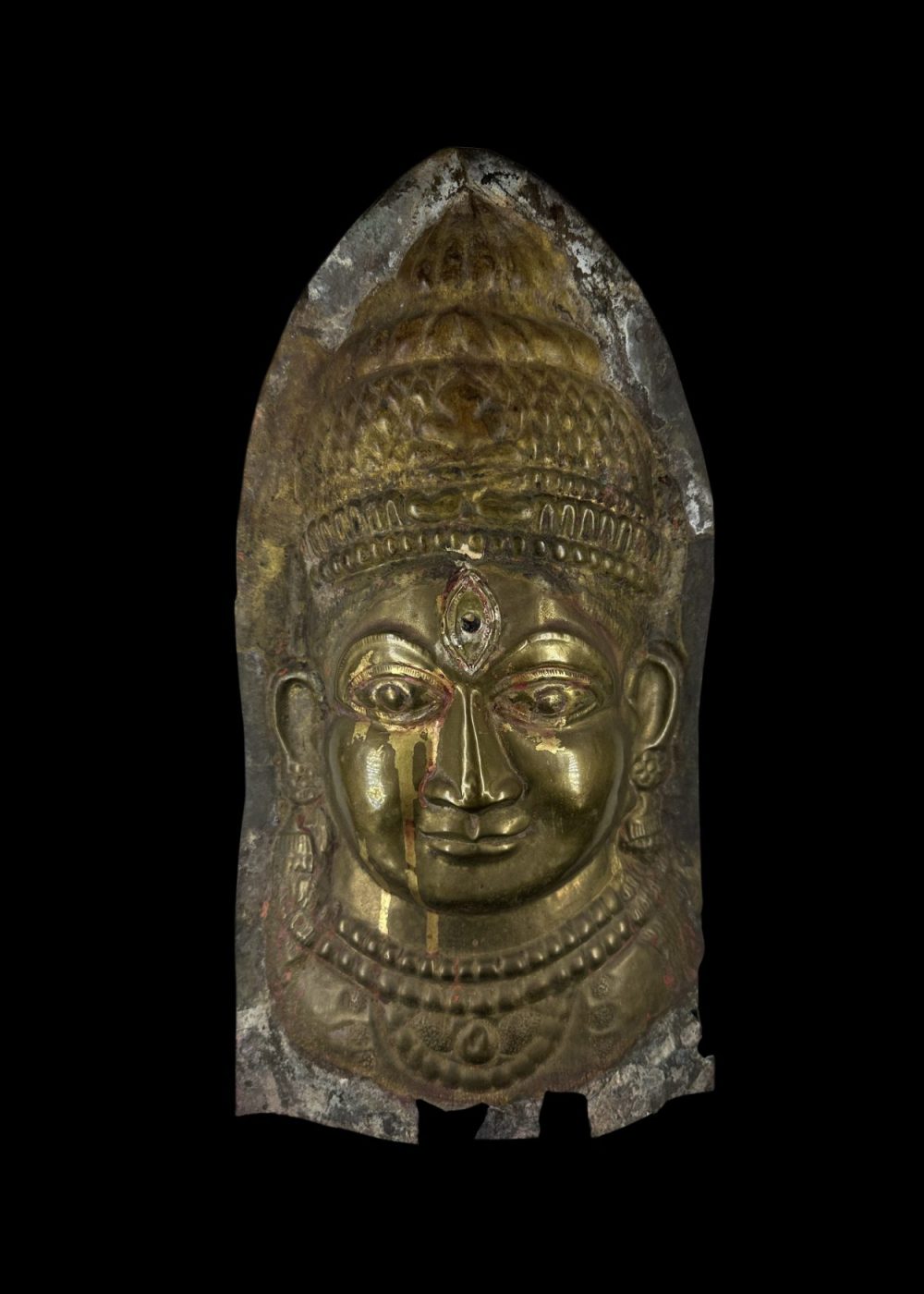 Brass gilt sculpture of Lord Shiva’s head, featuring a serene expression, almond-shaped eyes, and finely arched brows. The elaborate headdress is adorned with floral and geometric motifs, flanked by large ear ornaments and a beaded necklace. The gilded surface enhances its ritual significance, suggesting use in temple settings or ceremonial processions. This regional Himachali piece reflects the devotional artistry of the Western Himalayas, blending spiritual gravitas with ornamental finesse.