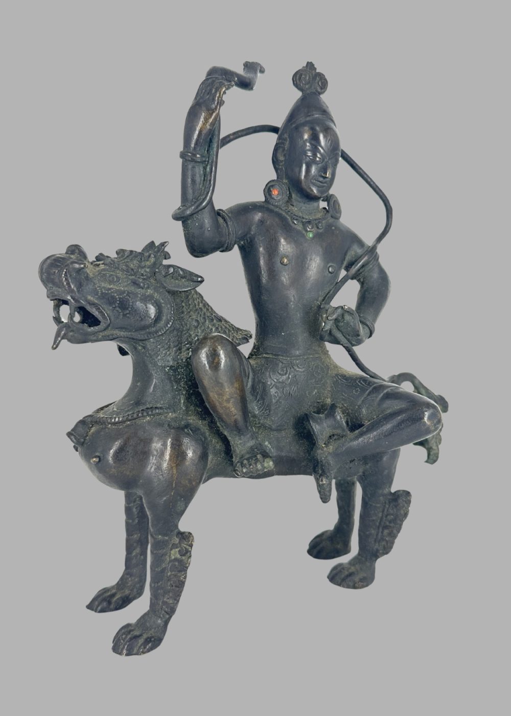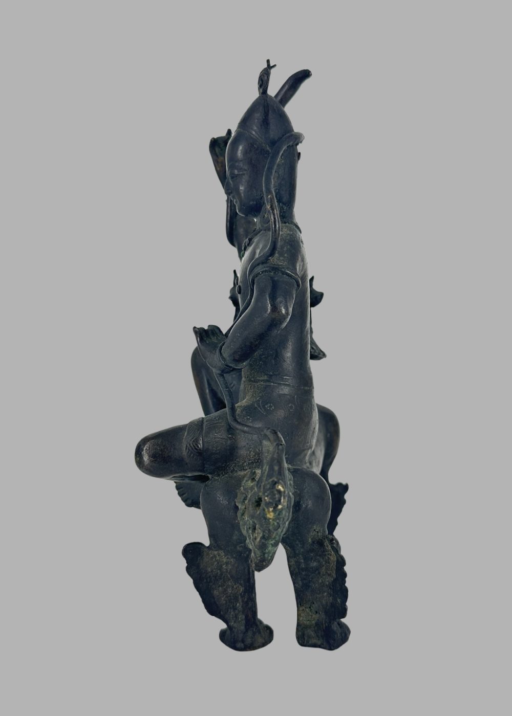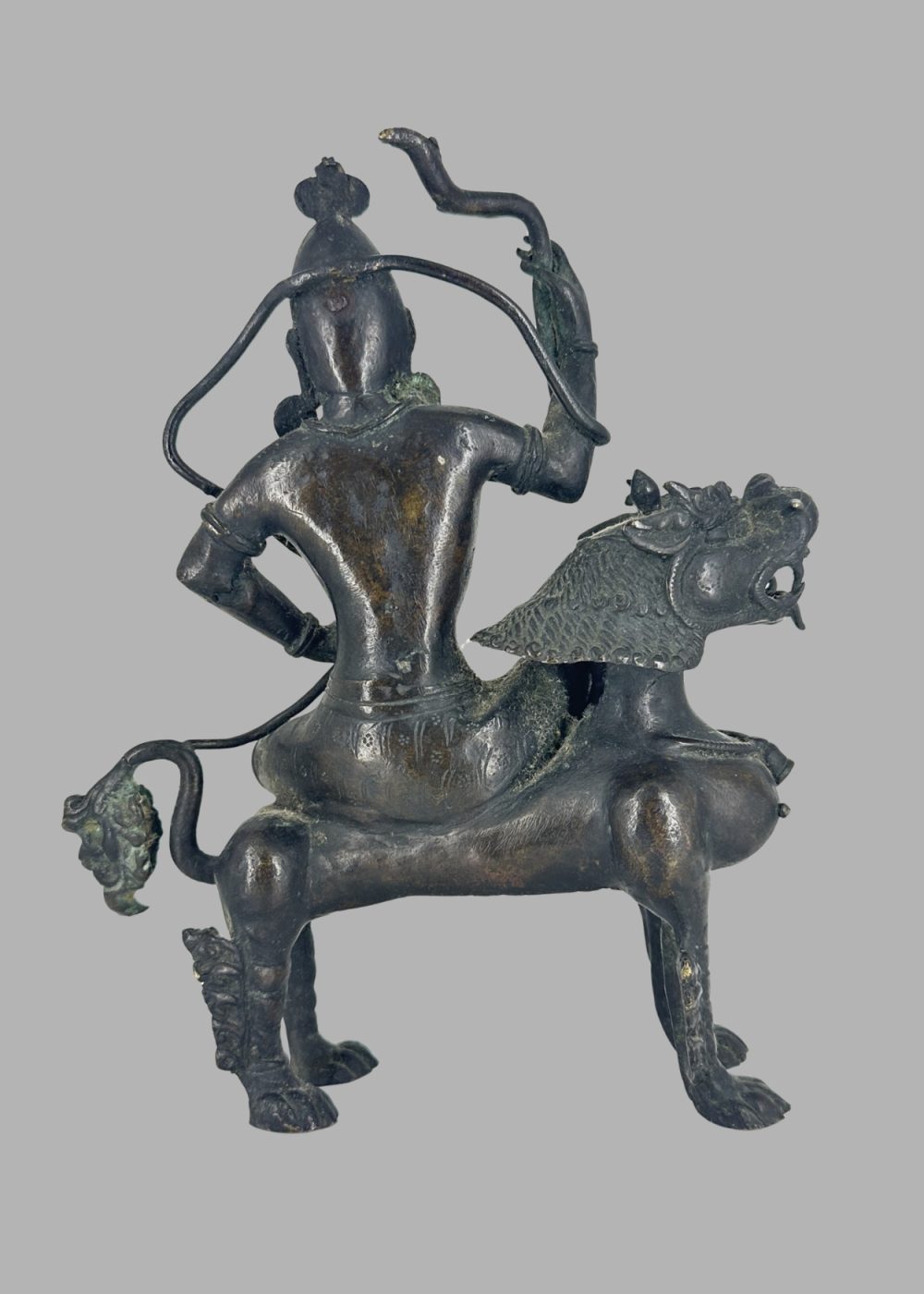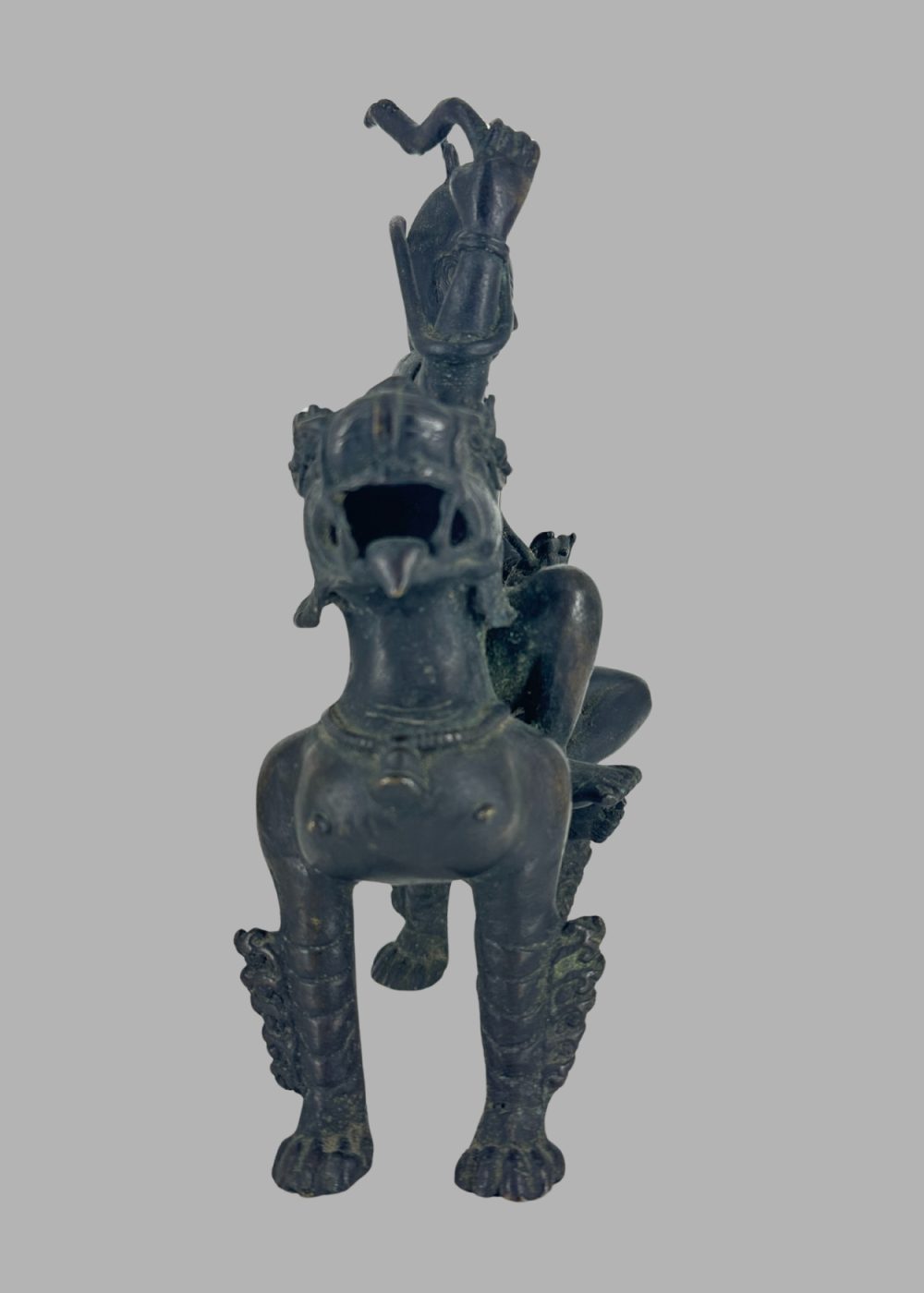 This striking bronze sculpture from Nepal portrays Lord Shiva seated regally atop a stylized lion, merging powerful symbolism with refined craftsmanship. Though Shiva is traditionally associated with Nandi the bull, this unique depiction places him on a lion, symbolizing dominion over primal forces and a fusion of iconographic traditions—possibly drawing influence from Buddhist and Tantric artistic motifs. Shiva is shown in a dynamic posture, holding a serpent and a weapon, conveying both his role as destroyer of ignorance and protector of cosmic balance. His detailed headdress, jewelry, and expressive features reflect the continuity of Nepalese bronze artistry, rooted in ancient casting techniques and spiritual symbolism. The lion is rendered with bold energy—its roaring expression and muscular form reinforcing the deity’s divine power and authority. This contemporary creation bridges the past and present, celebrating Nepal’s enduring legacy of religious sculpture while embracing imaginative reinterpretation within sacred art.