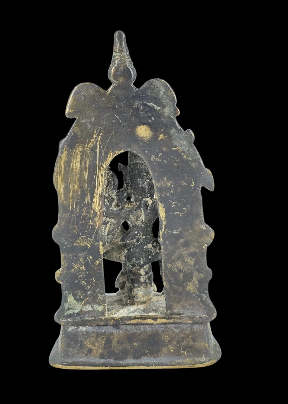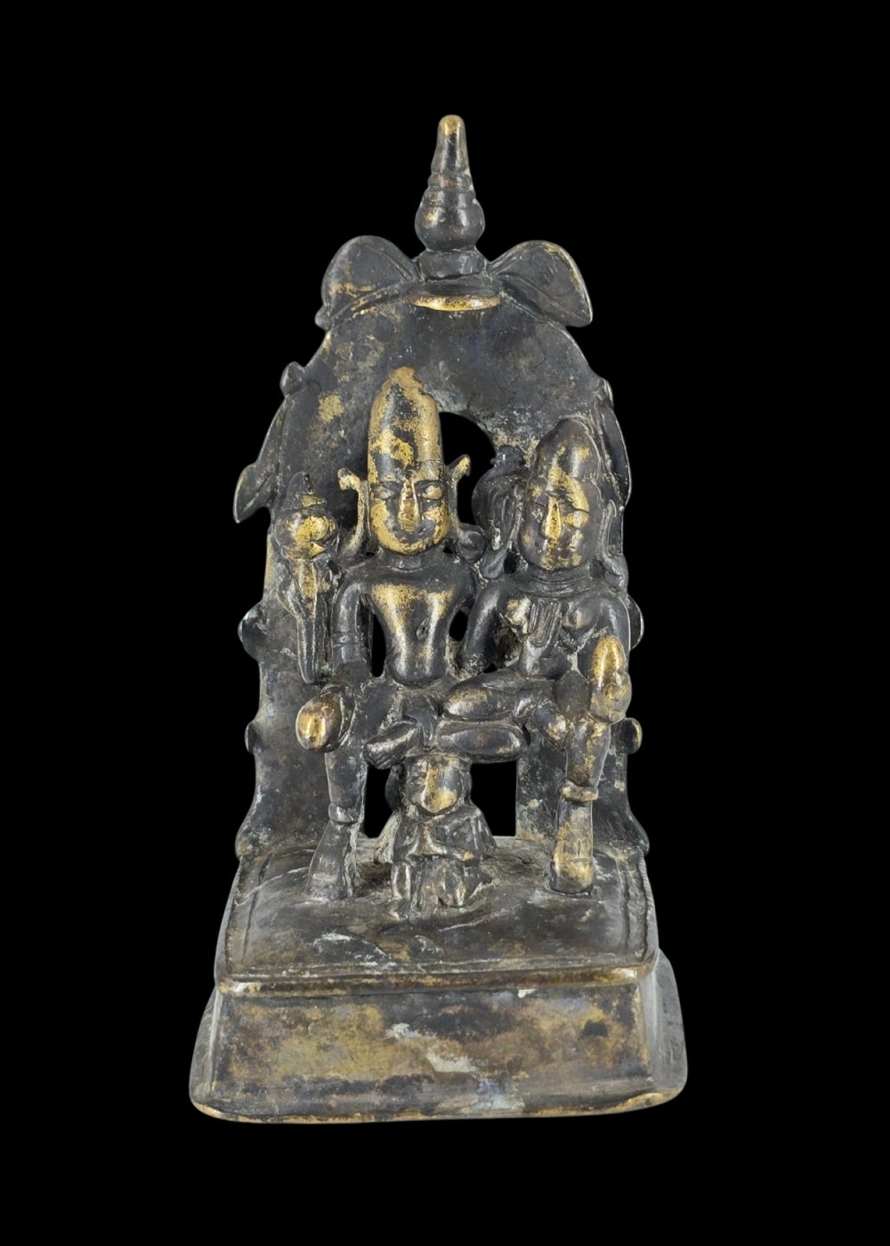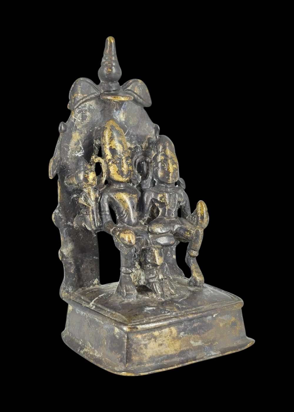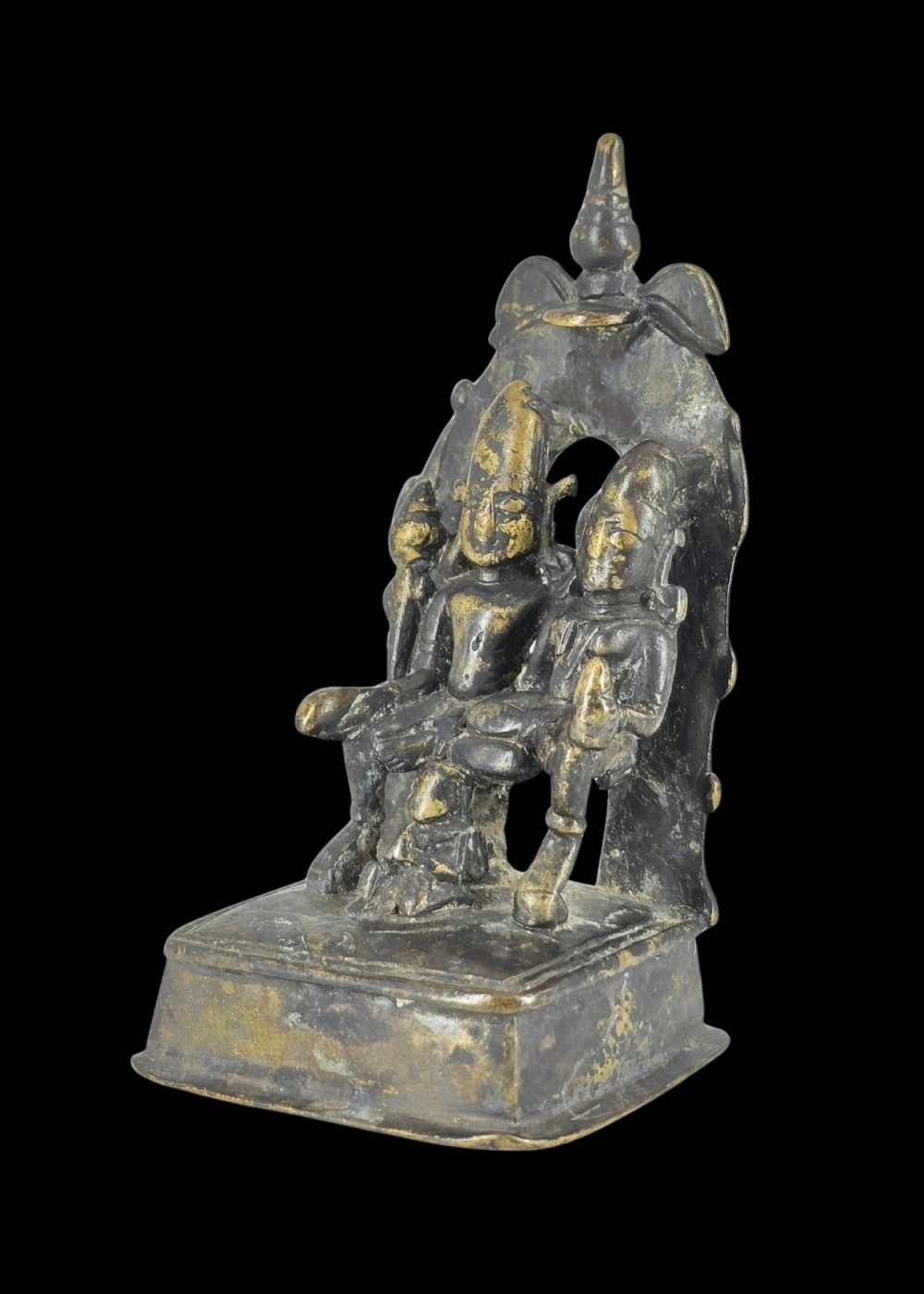 Bronze sculpture of Shiva and Parvati from West Bengal. The divine couple is depicted seated together beneath an ornate arch, symbolising harmony and divine union. Shiva is shown holding his characteristic attributes, while Parvati sits gracefully at his side. The composition is rich with symbolic detailing, and the worn dark patina with traces of gilding reflects centuries of worship and regional bronze artistry of Bengal.