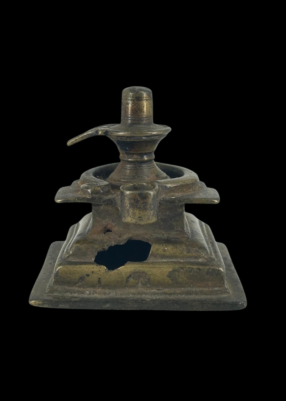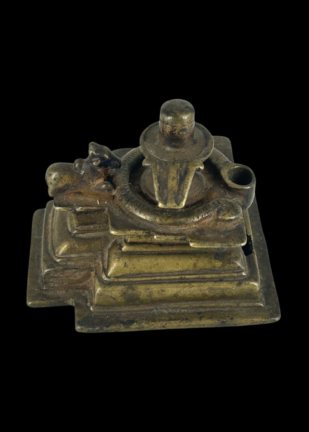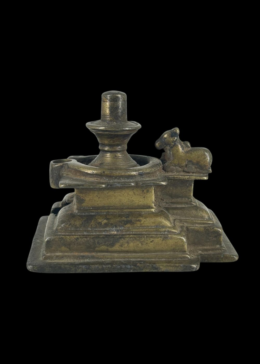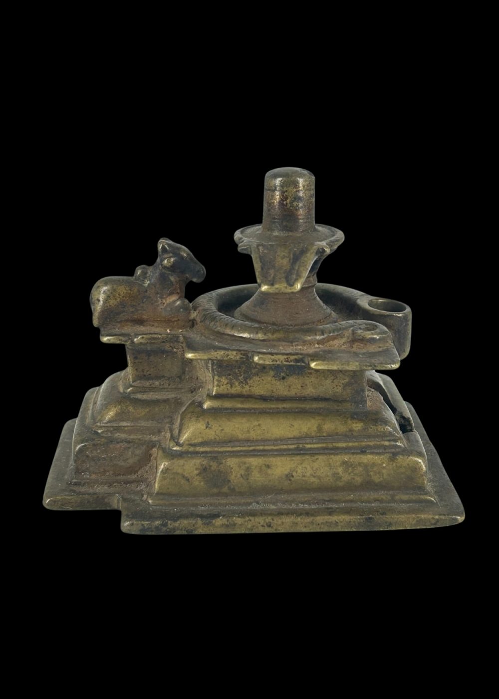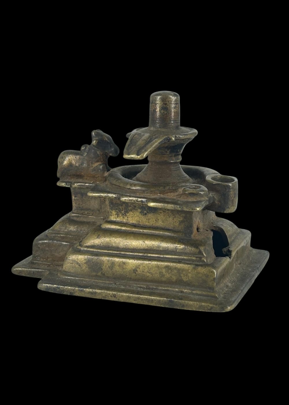 This is a bronze Shiva Lingam placed on a square stepped pedestal, accompanied by Nandi, the sacred bull, positioned in reverence. The lingam, symbolizing Lord Shiva, is encircled by the yoni base, representing Shakti, signifying the union of divine energies. The piece bears a naturally aged patina, indicating its ritualistic and devotional use in traditional worship practices.