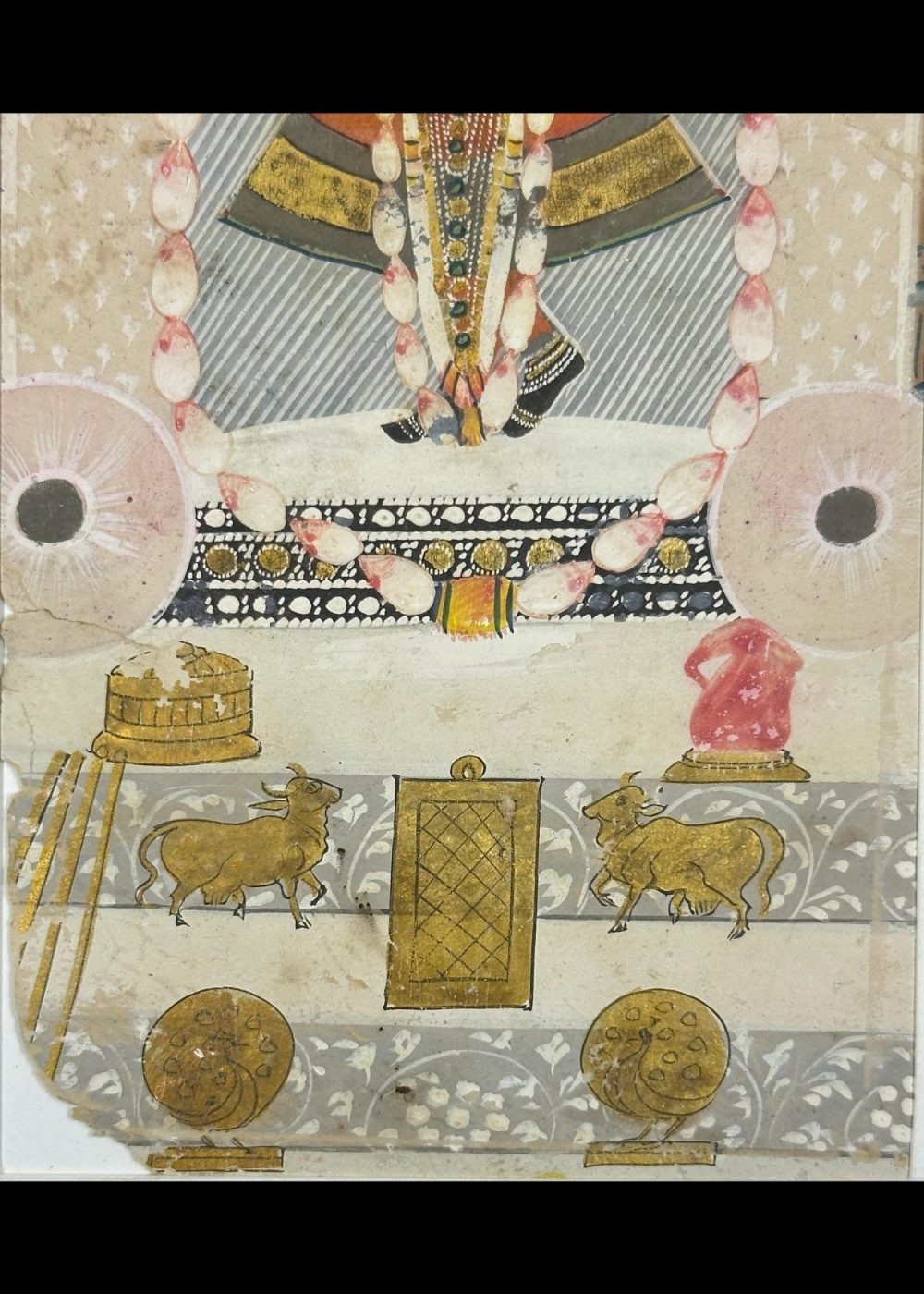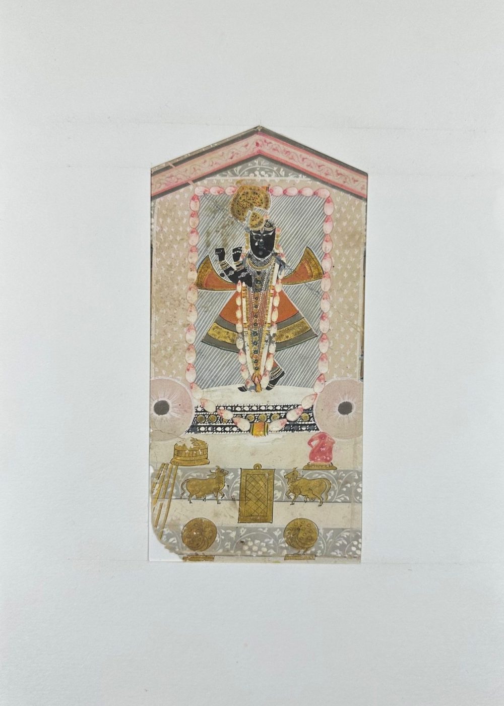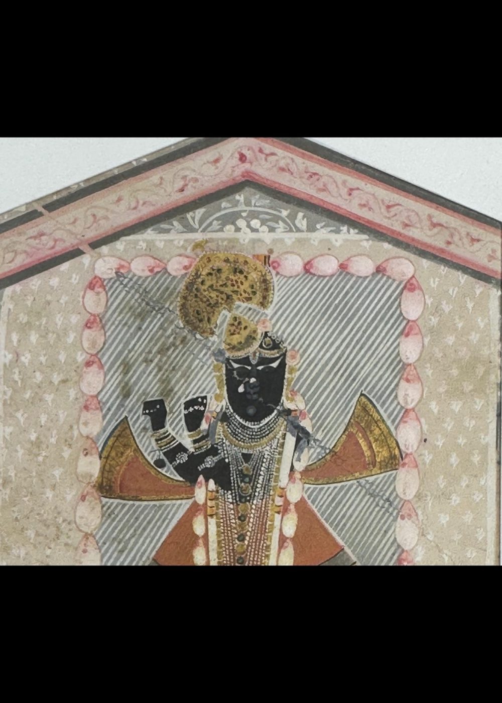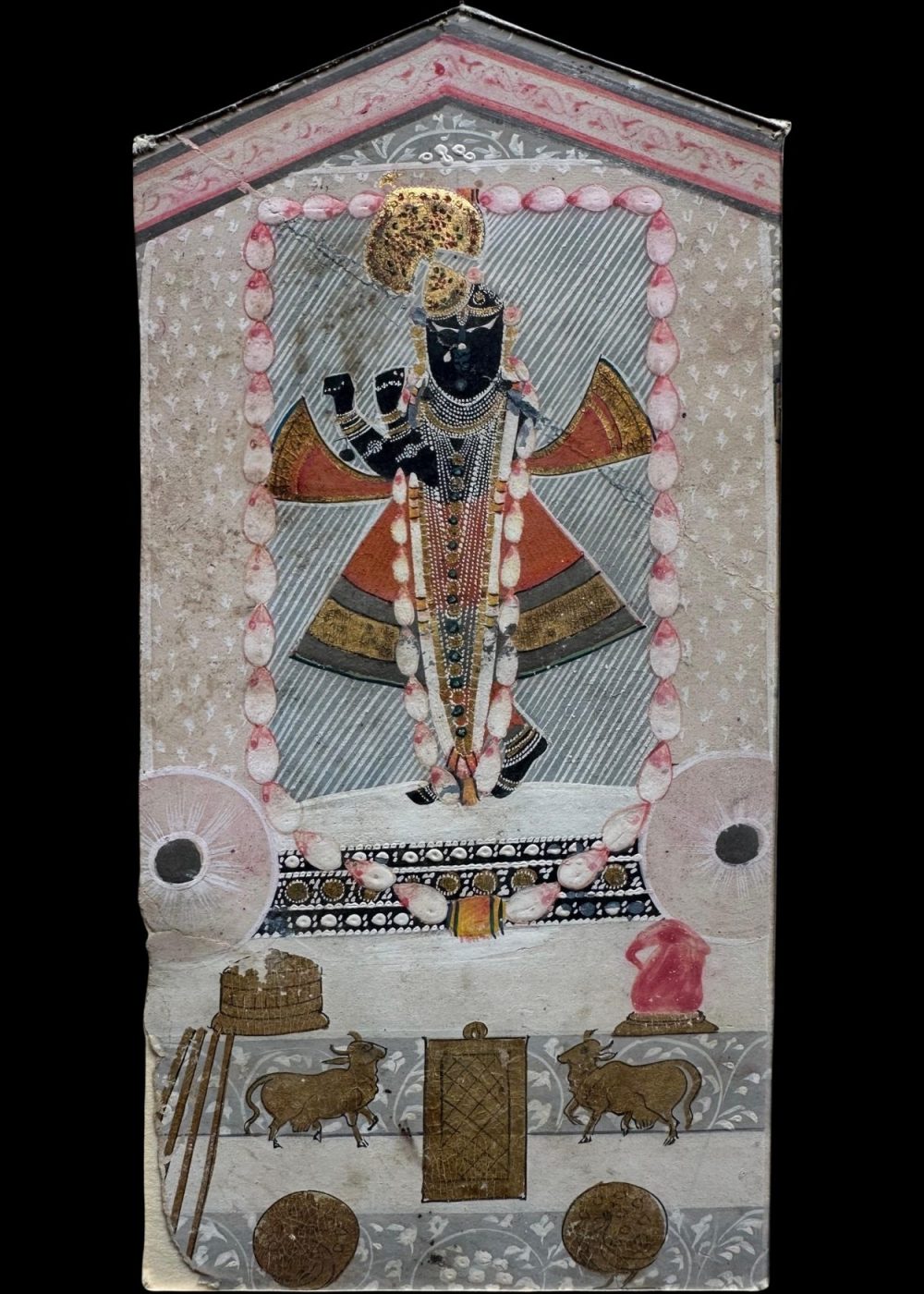 This exquisite miniature painting depicts Shri Nathji, a revered form of Lord Krishna worshipped in the Pushtimarg tradition, enshrined in a sanctified setting. Adorned with intricate jewelry, a radiant golden crown, and a garland of pink lotus buds, the deity stands in the iconic pose with his left arm raised—symbolizing the lifting of Mount Govardhan. Ritual objects, sacred cows, and offerings are painted at his feet, emphasizing the devotional context. The composition reflects the refined aesthetic and spiritual depth of Nathdwara miniature painting, which flourished as visual devotion in Vaishnava temples.