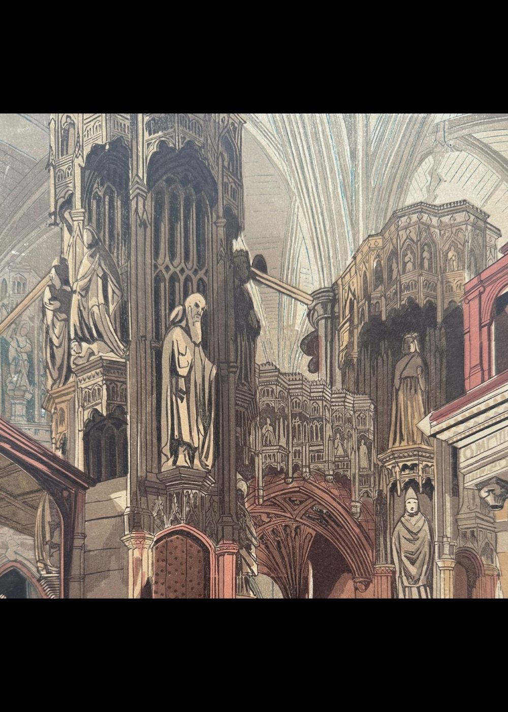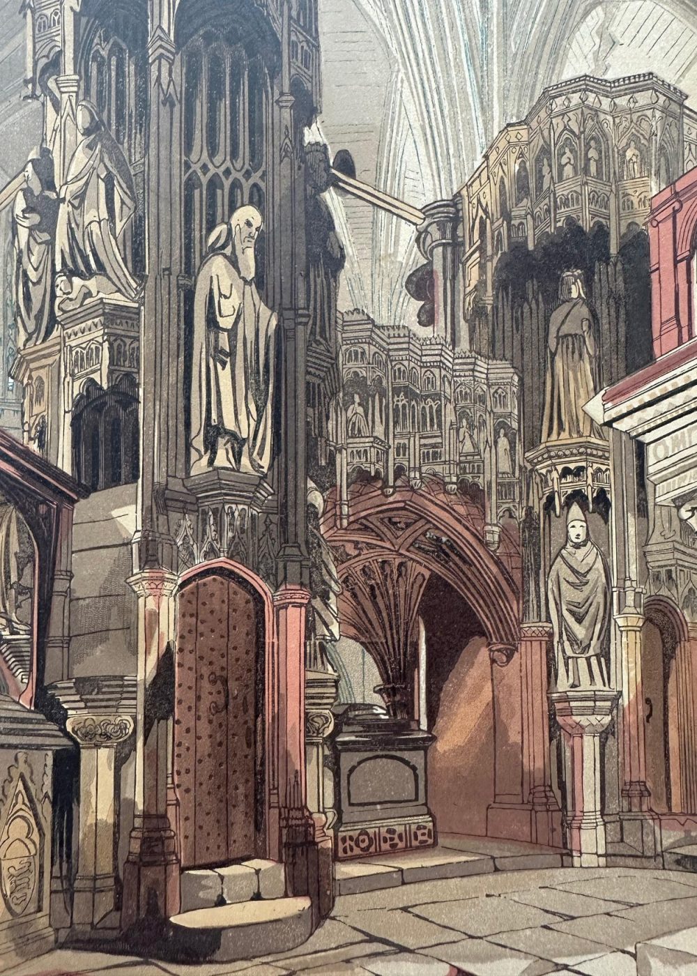 This intricate architectural illustration showcases the ornate Gothic-style shrine dedicated to King Henry V of England. The composition is rich with sculpted details—arched niches, elaborate carvings, and statues of saints or royal figures adorn the monument. Every element reflects the grandeur and reverence accorded to a monarch of historical importance, capturing the artistic flair of medieval craftsmanship and religious devotion.