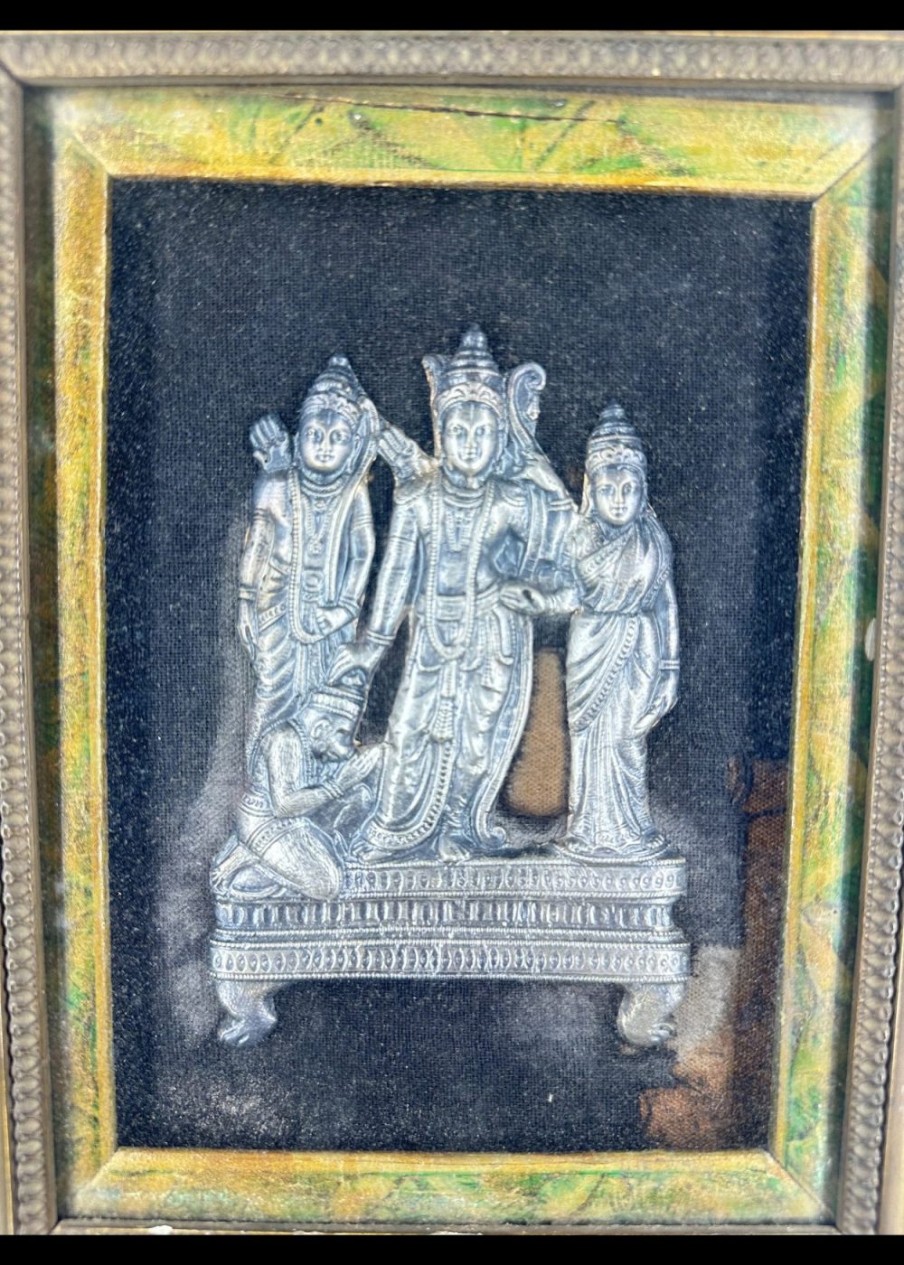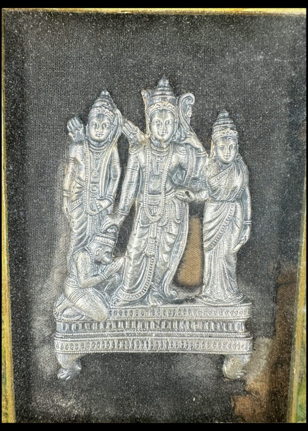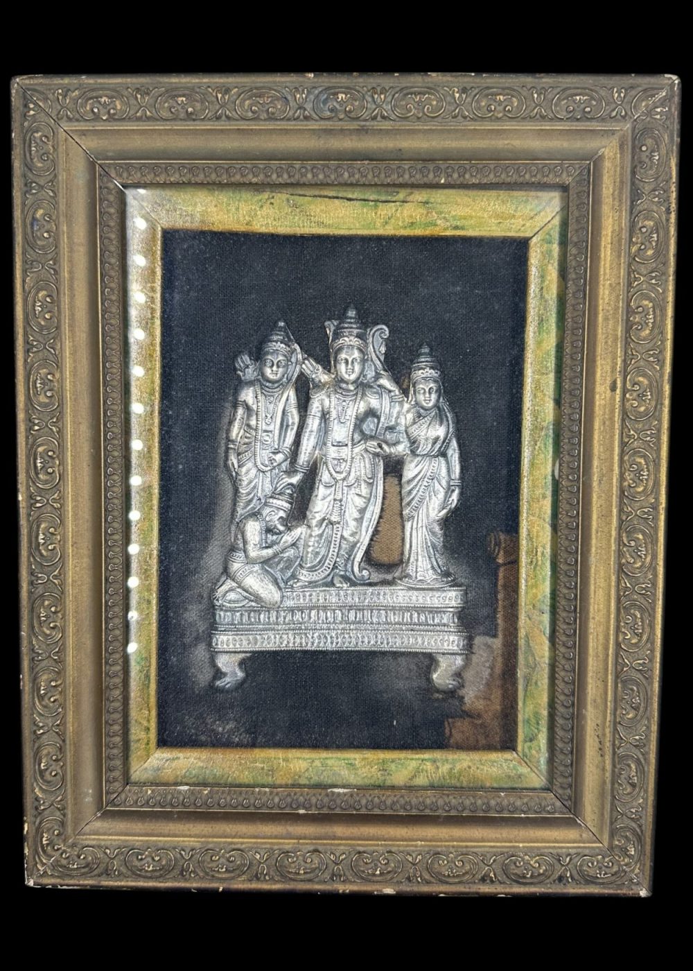 This finely worked silver panel presents a triad of divine figures rendered in high repoussé, framed within elaborately arched niches. Each figure is embellished with ornate attire and symbolic attributes, set against a textured backdrop that heightens their sacred presence. The intricate tooling and symmetrical composition reflect the devotional aesthetics and exceptional craftsmanship of interwar Karnataka, where religious art merged with enduring metal traditions.