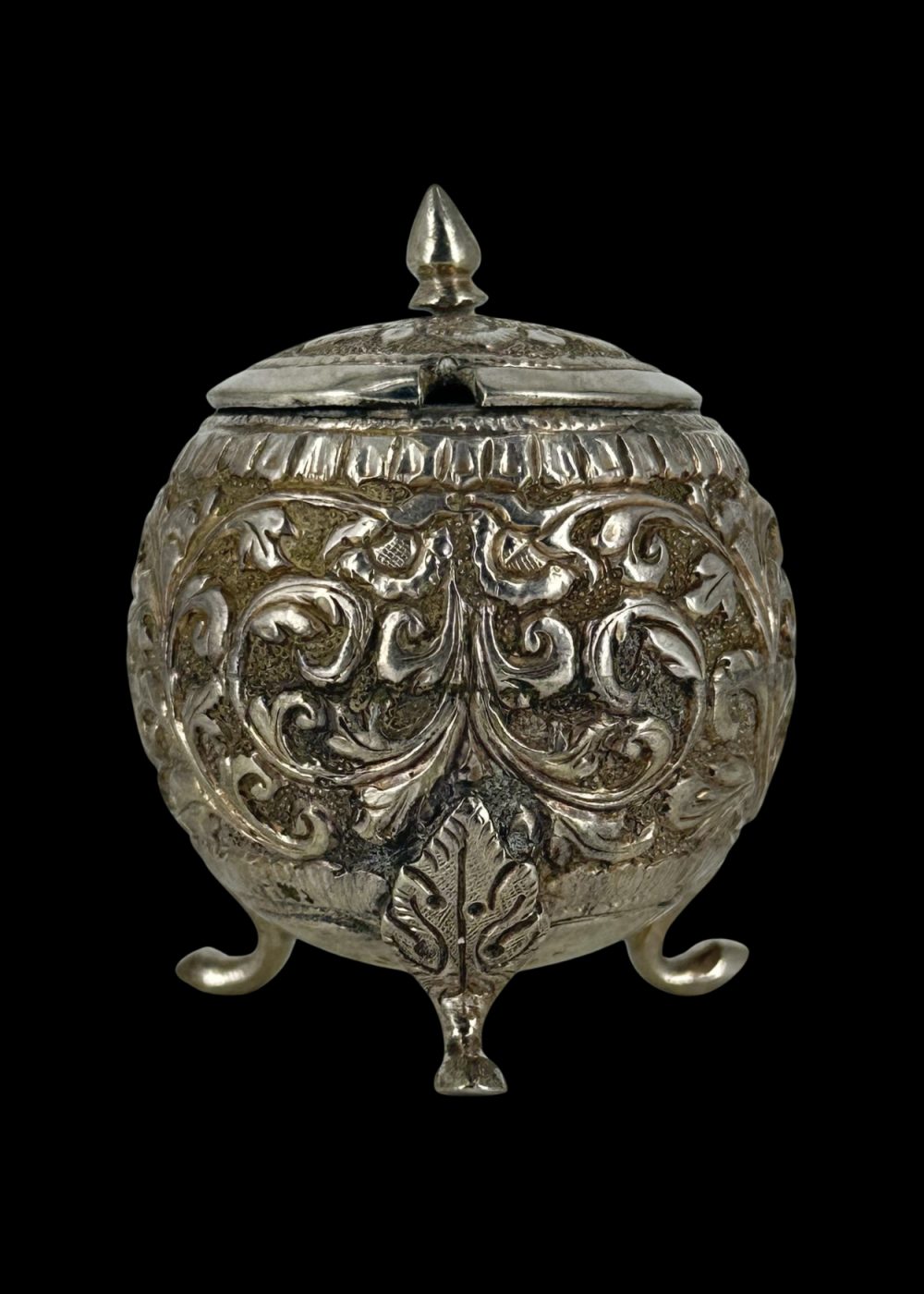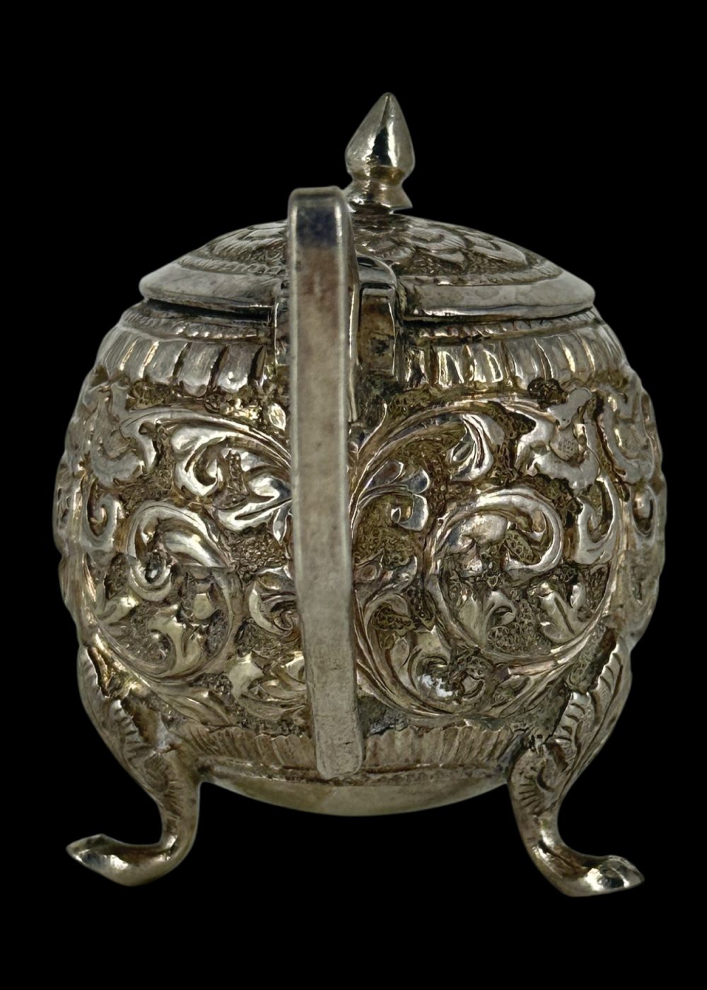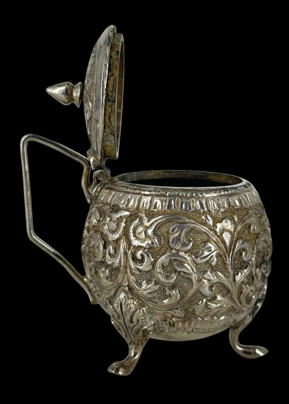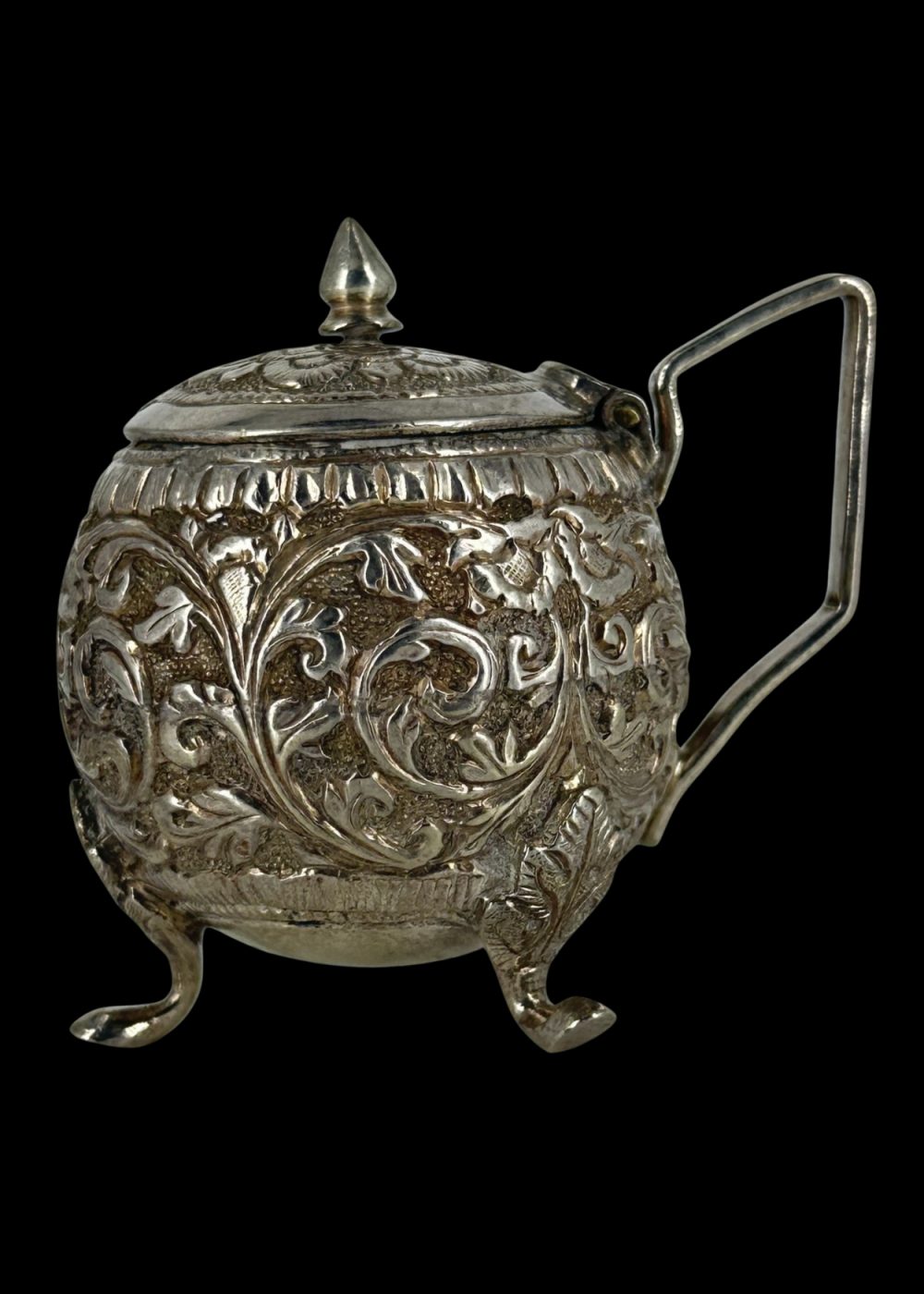 This elegant silver sugar pot from North India, circa 1900, showcases the refined artistry and decorative sophistication of the late colonial period. Crafted in high relief, the pot features intricate floral and foliate repoussé work that adorns its bulbous body, a hallmark of traditional Indian metalwork influenced by Mughal aesthetics. Resting on three delicate claw-like feet, the vessel is both ornamental and functional. Its hinged lid, topped with a pointed finial, opens smoothly to reveal a hollow interior once used to store sugar—an essential element in formal tea service. The side handle, angular and minimal, contrasts the ornate body and ensures ease of use. Such silver objects were often part of lavish tea sets in affluent households, blending Indian craftsmanship with British colonial dining customs. This sugar pot stands as a symbol of cultural synthesis, representing both utility and artistic heritage in everyday luxury.