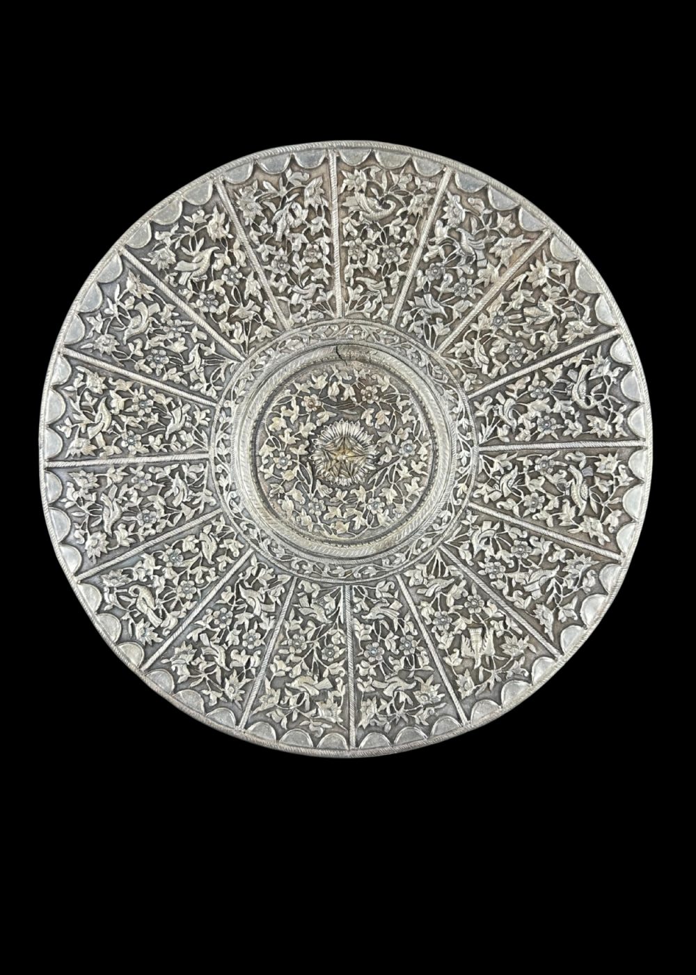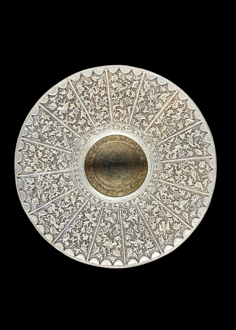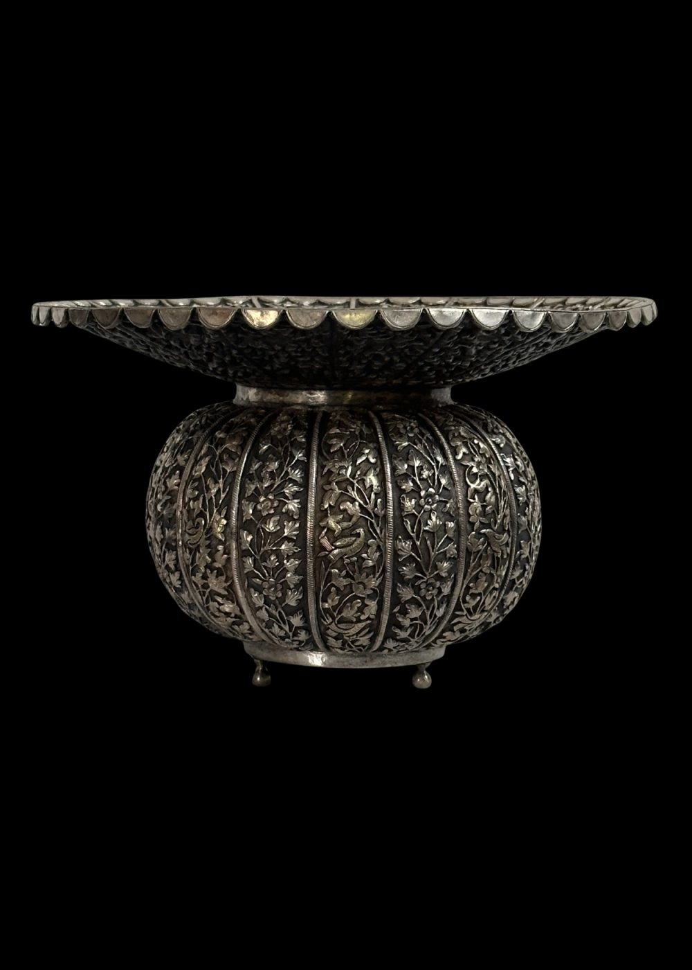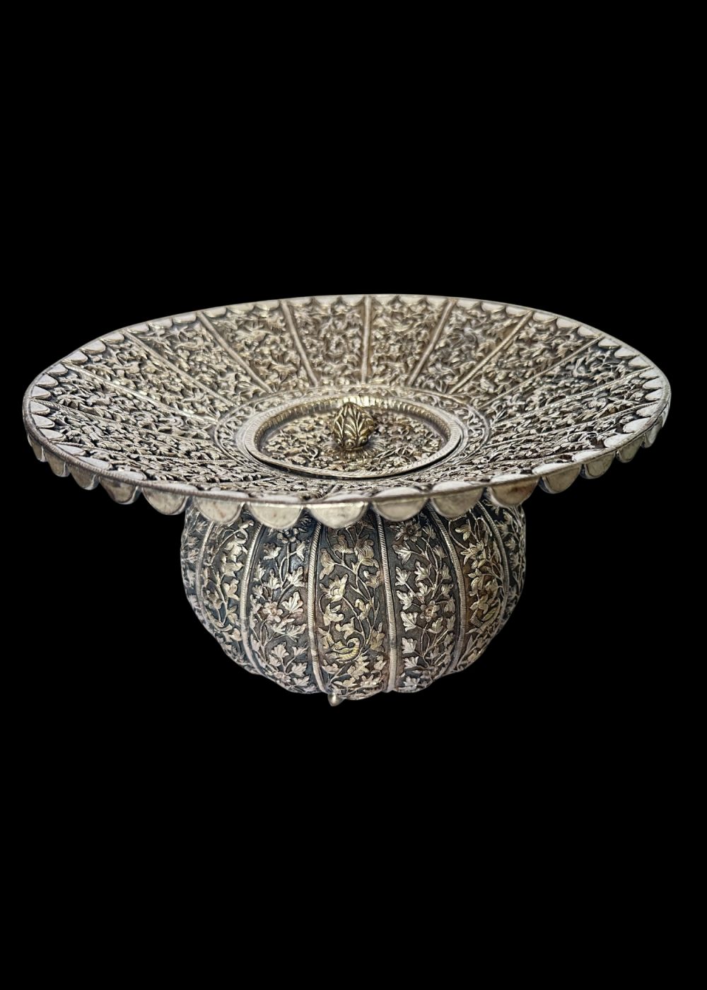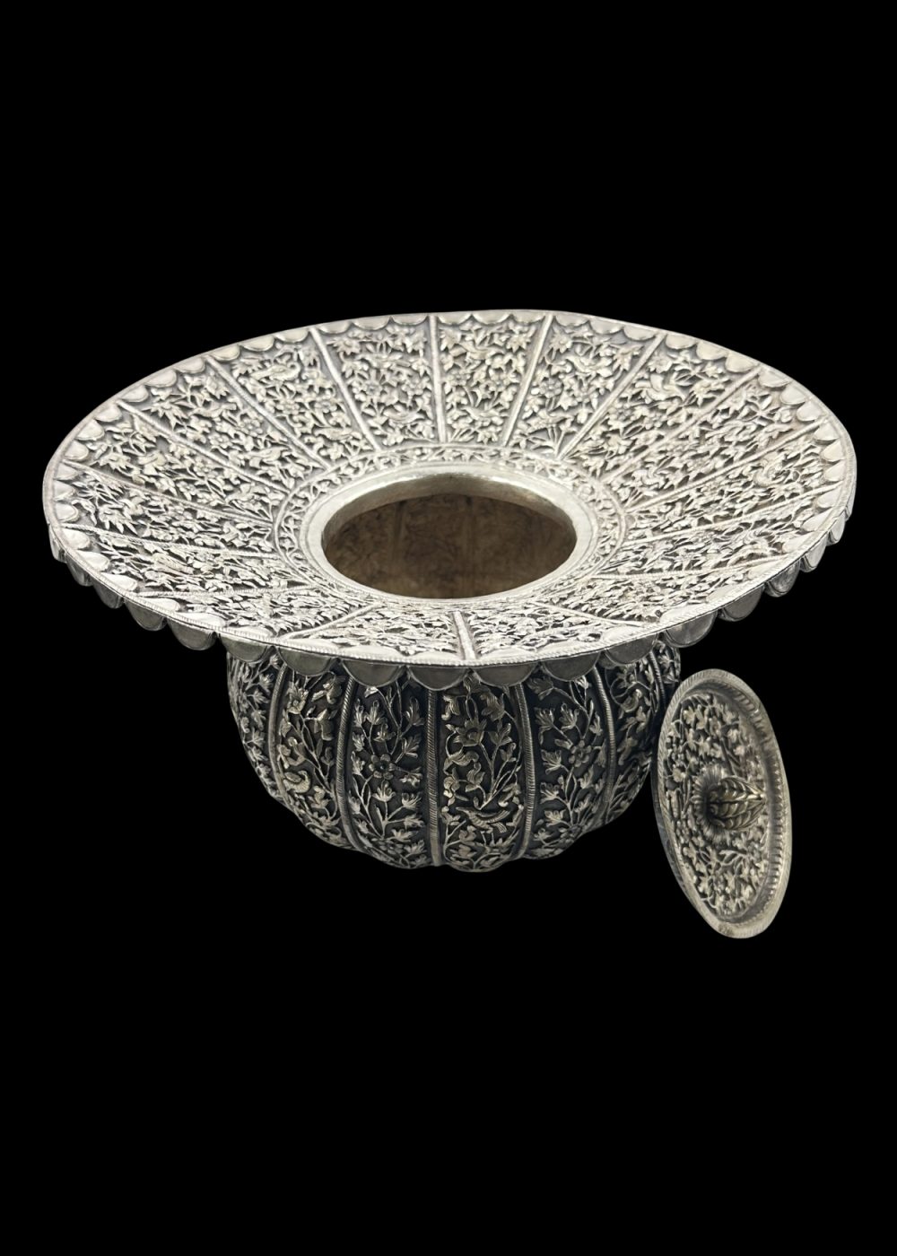 This finely crafted silver thukdani (spittoon) from early 20th-century North India is a striking example of ornamental metalwork used in daily and ceremonial life. Made entirely of silver, the piece features meticulous repoussé floral designs arranged in radiating segments across the flared rim and bulbous body, highlighting the artisan’s skill and attention to symmetry. Used primarily for spitting paan (betel leaf mixture), the thukdani was a common accessory in aristocratic and upper-class Indian households, reflecting both cultural etiquette and hospitality traditions. The removable lid, adorned with a delicately sculpted finial, further elevates its utility with aesthetic refinement. This object not only served a hygienic function but also stood as a marker of sophistication, blending everyday use with the rich decorative traditions of North Indian silver craftsmanship.