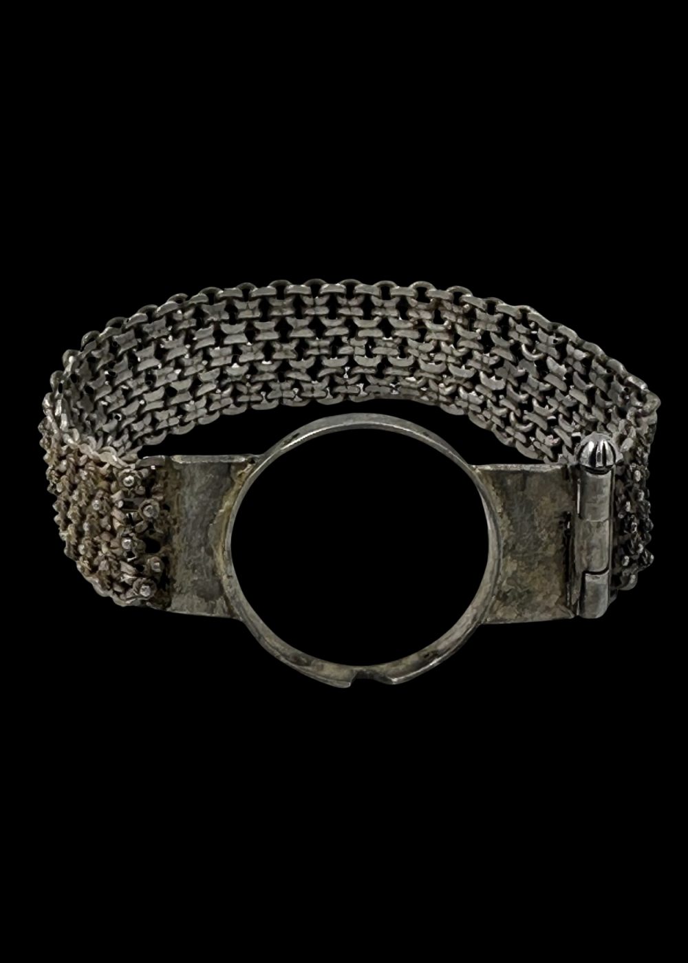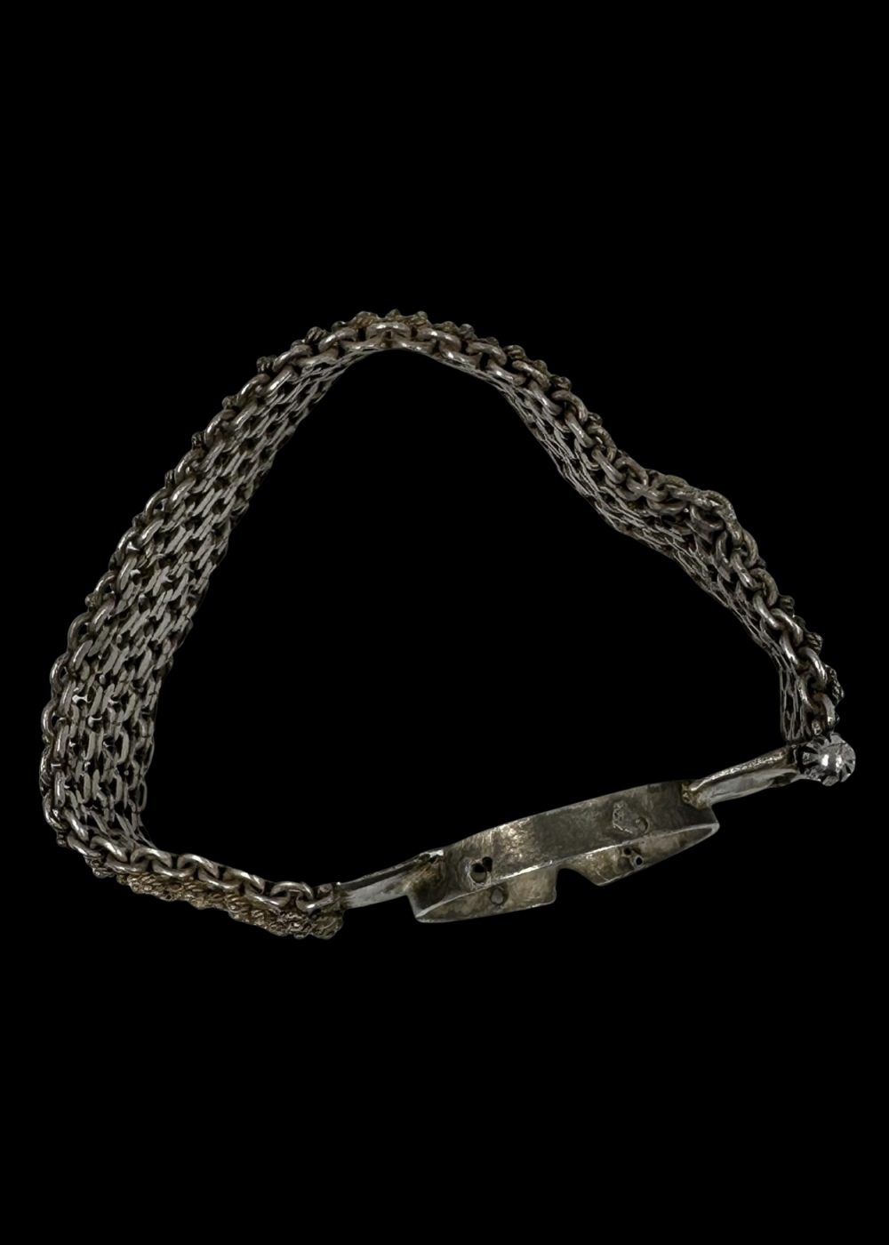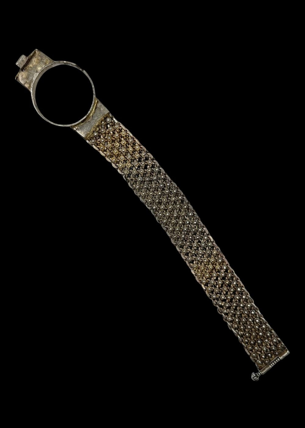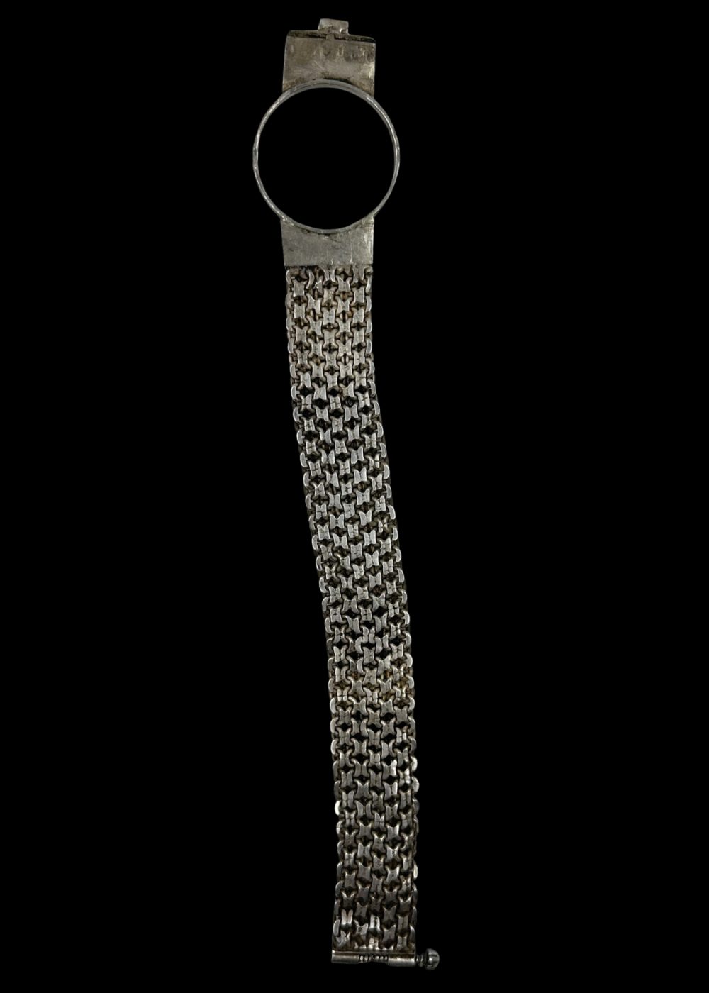This silver watch strap frame from 1970s Nathdwara, Rajasthan, exemplifies a blend of traditional craftsmanship and contemporary utility. The band is composed of meticulously linked silver chain segments, forming a dense, flexible mesh that reflects light with subtle elegance. The centerpiece—a circular bezel designed to hold a watch face—is flanked by solid silver connectors, with a small hinge mechanism suggesting ease of access and wear. The textured, almost armor-like appearance of the band evokes a sense of strength and durability, while the refined detailing reflects the artistic ethos of Nathdwara, a town revered for its devotion to Lord Shrinathji and its rich legacy in miniature painting and silverwork. This object likely belonged to a time when wristwatches were more than timekeepers—they were symbols of personal style and status. Merging functionality with ornamentation, this piece captures the essence of 1970s Nathdwara: a community where spiritual heritage and artisanal innovation coexisted gracefully in silver’s radiant glow.