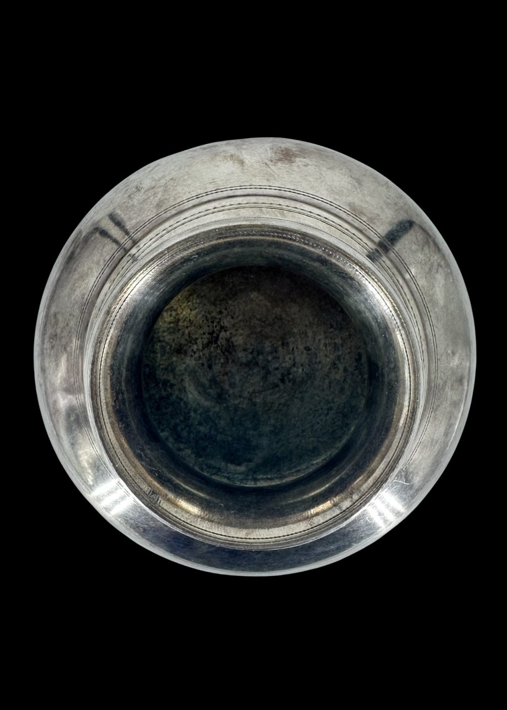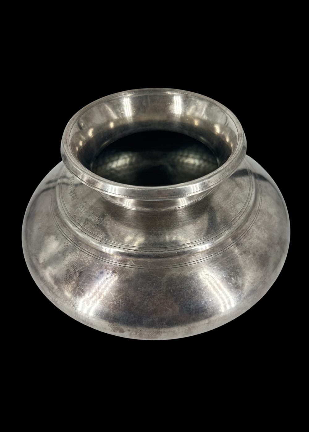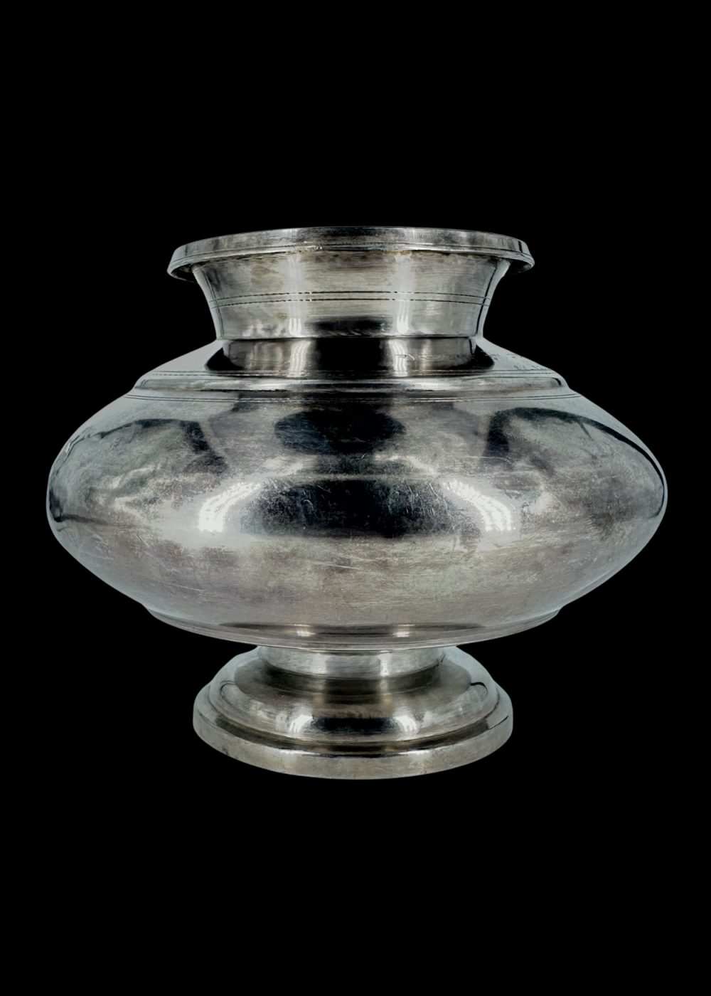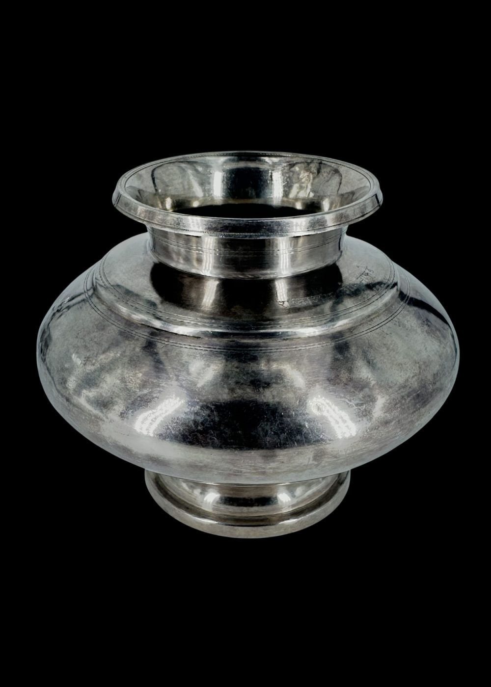 This finely crafted silver lota from mid-20th century Maharashtra exemplifies the understated elegance of domestic utility elevated to an art form. With its broad, rounded body, tapering neck, and flared rim, the pot reflects a form that is both practical and enduring in Indian household traditions. Created during the transitional period of the 1940s–50s—just before and after India’s independence—this vessel embodies the fusion of colonial influences with deeply rooted regional design sensibilities. The clean, unadorned surface speaks to a minimalist aesthetic, emphasizing form and proportion over ornate decoration, which marked a shift in the stylistic approach of the era. Used for daily rituals such as storing or offering water, this silver pot is more than a utilitarian object; it is a quiet symbol of grace, purity, and the refinement of a culture at a historical crossroads.