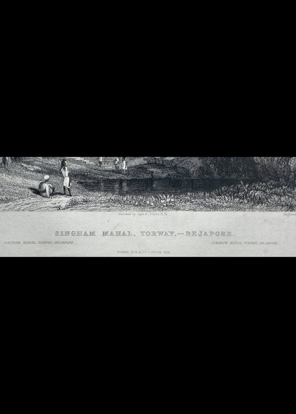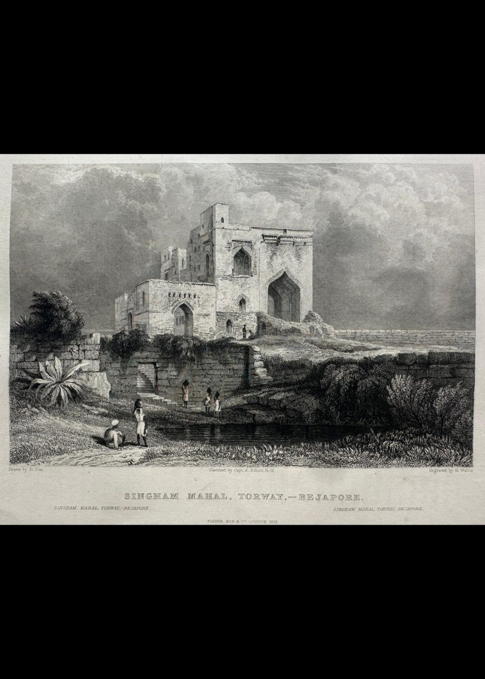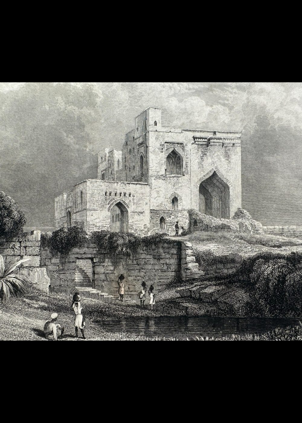 This finely detailed engraving depicts the majestic ruins of Singham Mahal at Torway, Bijapur, capturing the architectural grandeur of the Deccan Sultanate period. The composition highlights the imposing arched gateway and the fortress-like structure, surrounded by natural vegetation and figures by the water’s edge, adding a sense of scale and life to the scene. Rendered with remarkable precision, the artwork reflects the historical richness and atmospheric beauty of southern India.