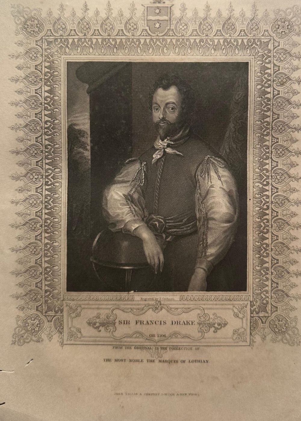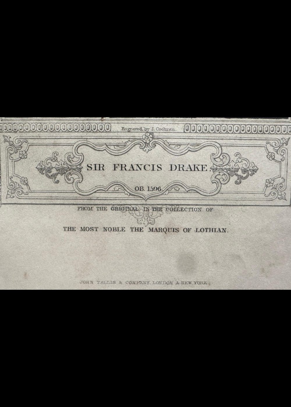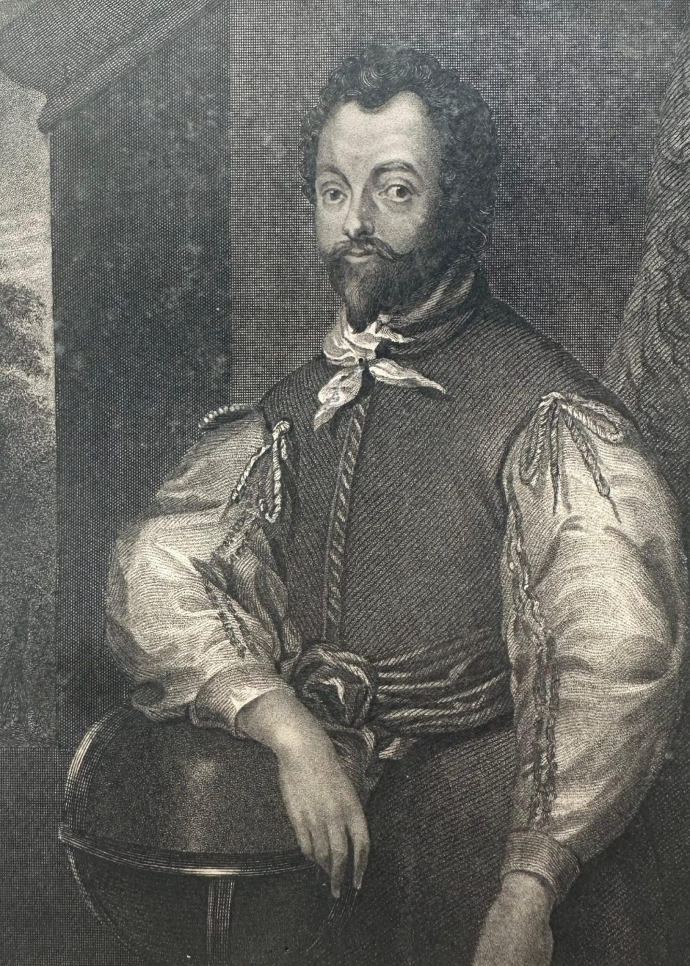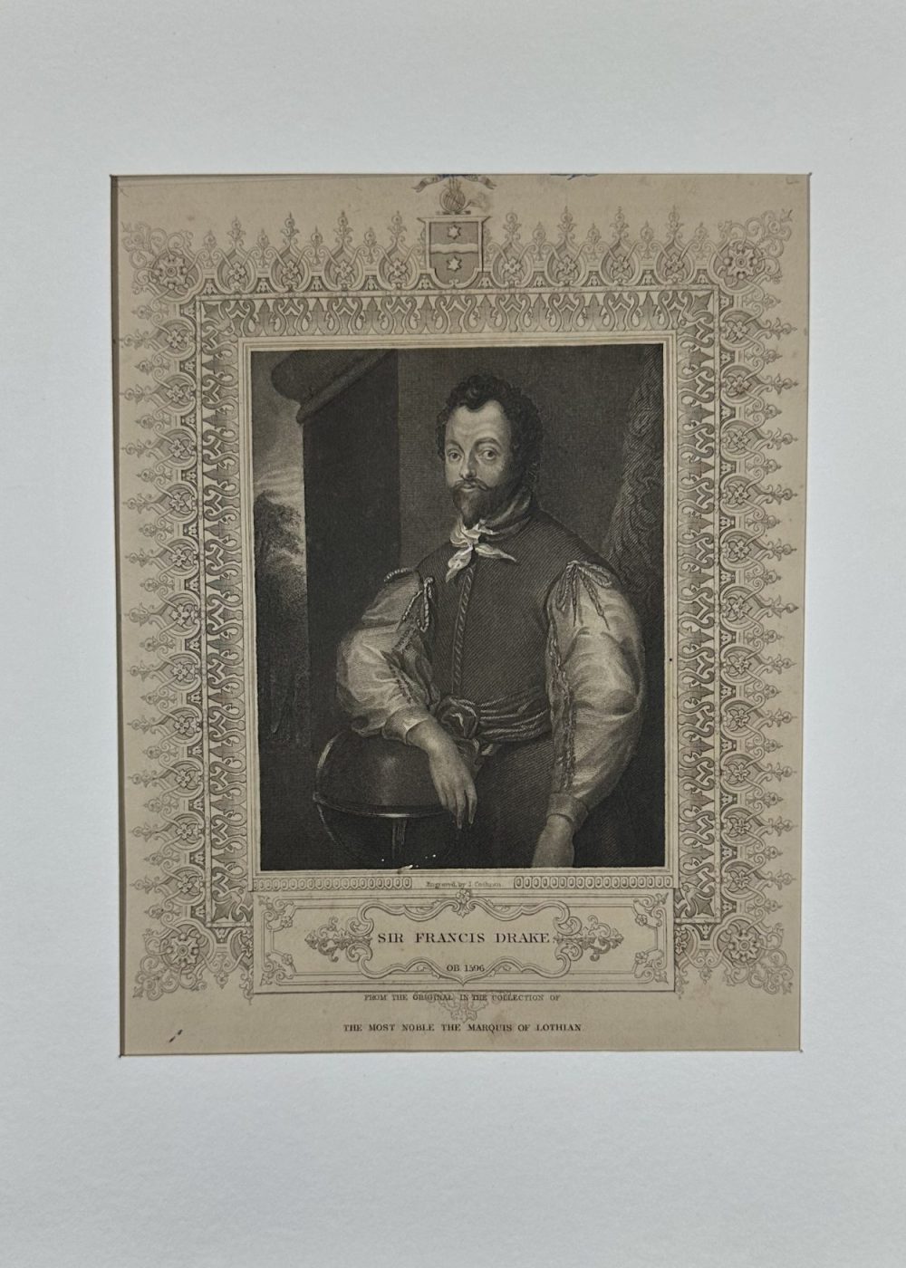 This engraving portrays Sir Francis Drake, the famed English sea captain, privateer, and explorer of the Elizabethan age. Shown in period attire, he rests his hand on a globe, symbolizing his historic circumnavigation of the world (1577–1580). The engraving, taken from the original in the collection of the Marquis of Lothian, highlights Drake’s legacy as a daring navigator and naval commander, celebrated for his role in England’s maritime expansion and his victory against the Spanish Armada in 1588.