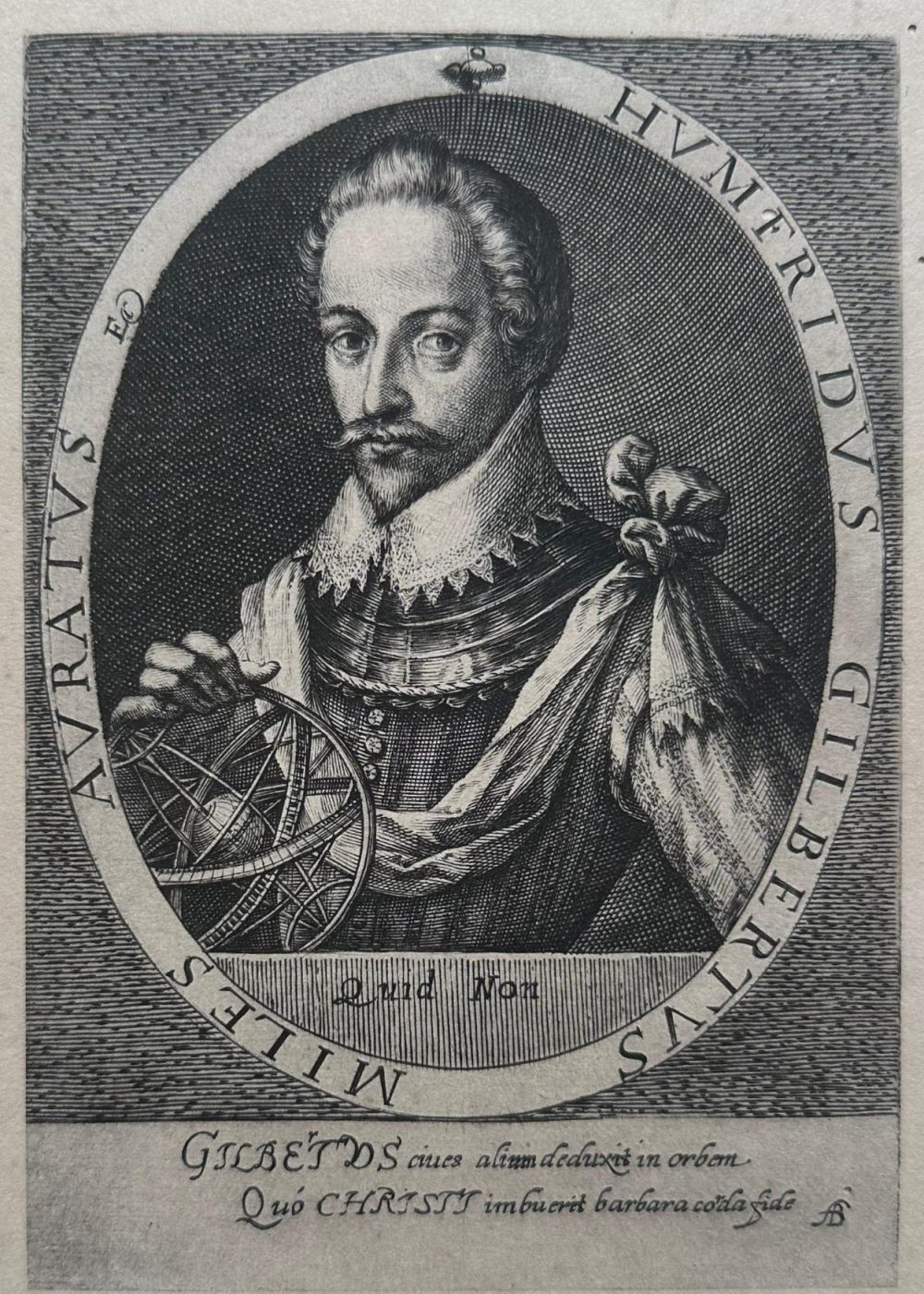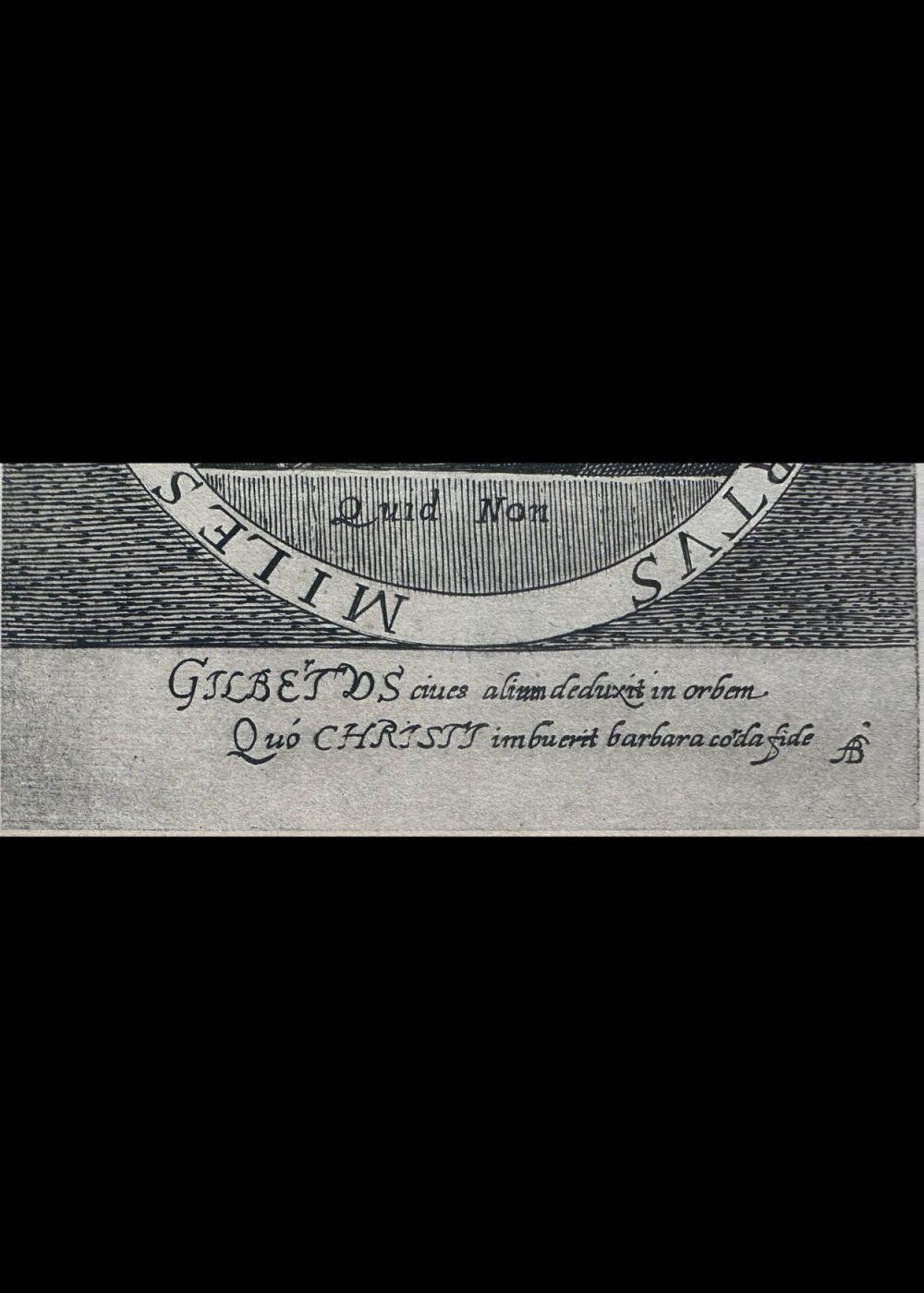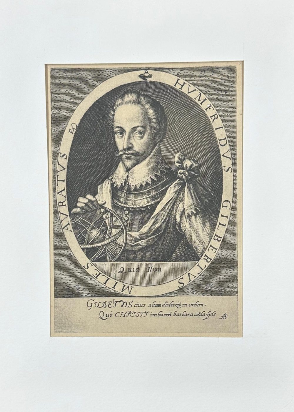 This finely engraved portrait depicts Sir Humphry Gilbert, an English adventurer, navigator, and colonialist of the Elizabethan era. Presented in elaborate attire of the late 16th century, he holds an armillary sphere, symbolizing exploration and scientific inquiry. The Latin inscription “HVMFRIDVS GILBERTVS MILES AVRATVS” translates to “Sir Humphry Gilbert, Knight.”