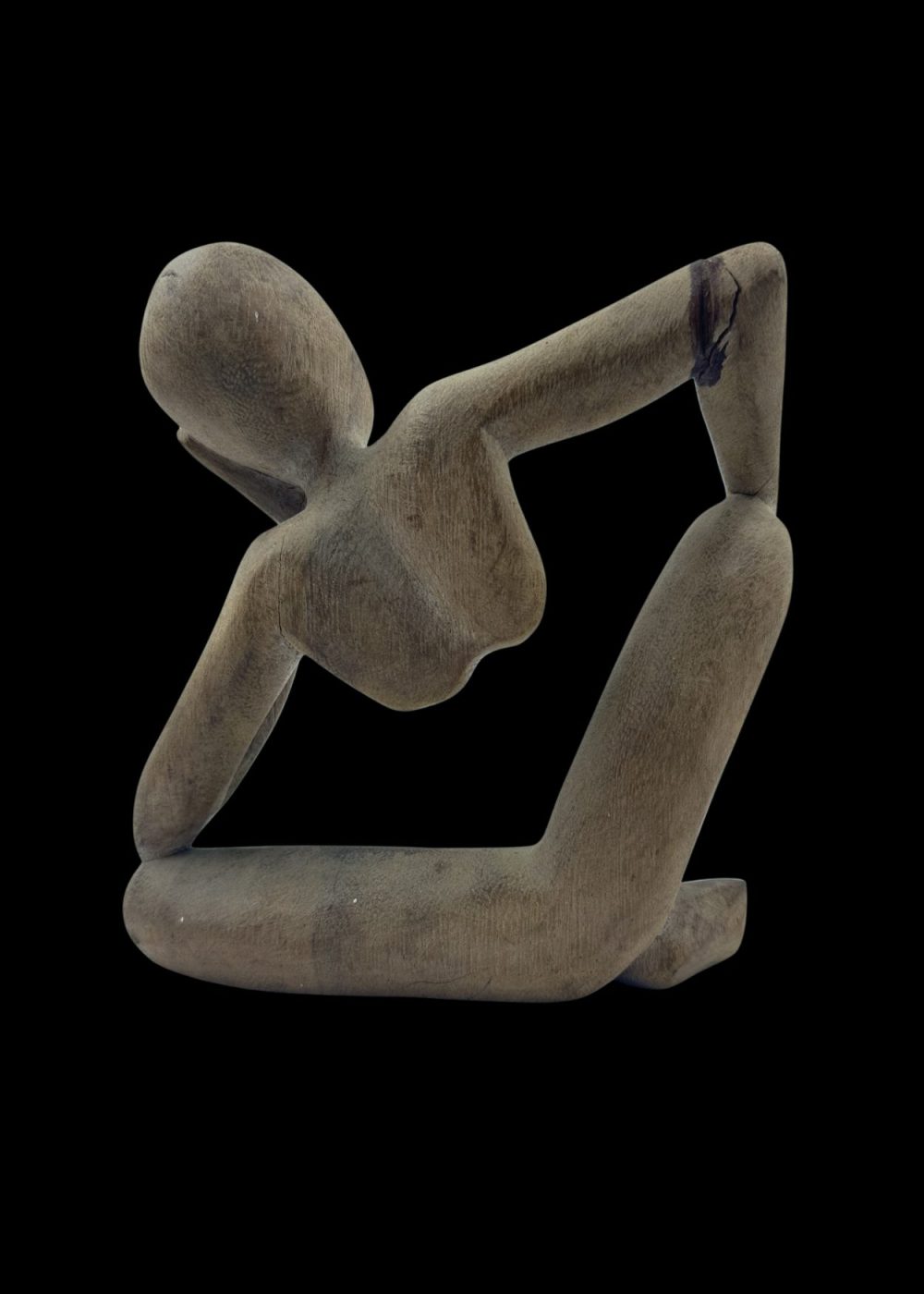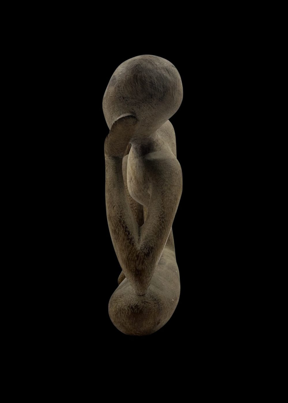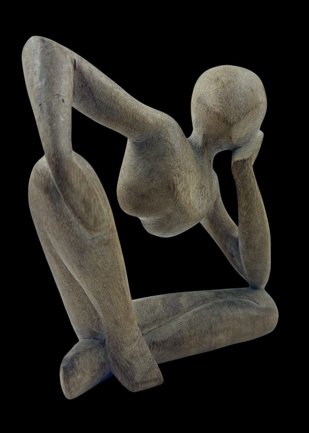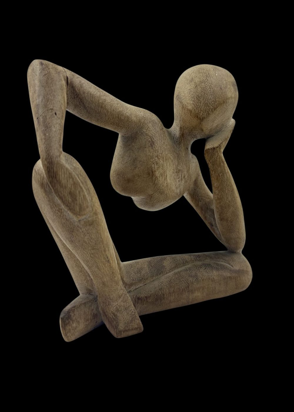 This abstract wooden sculpture captures a faceless human figure in a reflective, seated pose with one arm resting thoughtfully against the head. Smoothly carved with flowing lines and minimal detailing, the piece emphasizes form and emotion over realism. Its simplicity and balance evoke a sense of introspection and calm, making it a striking example of modern minimalist artistry.