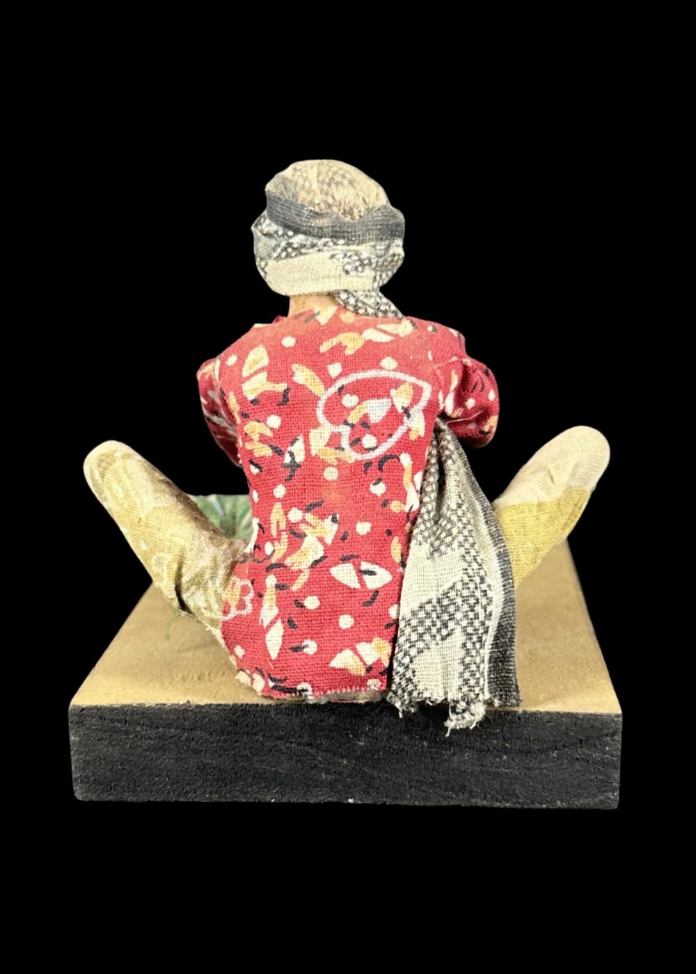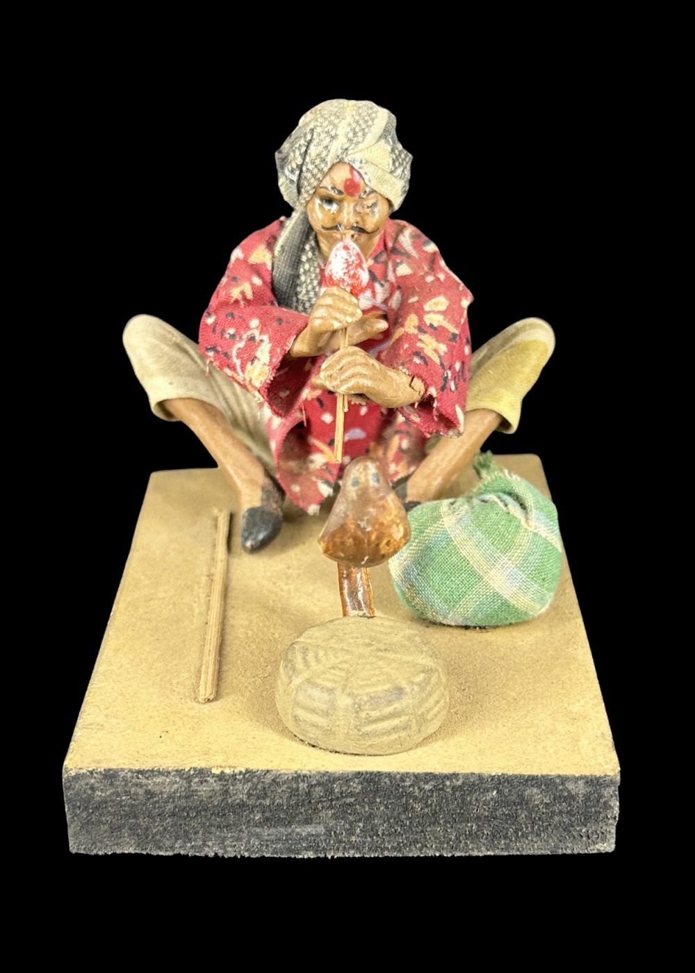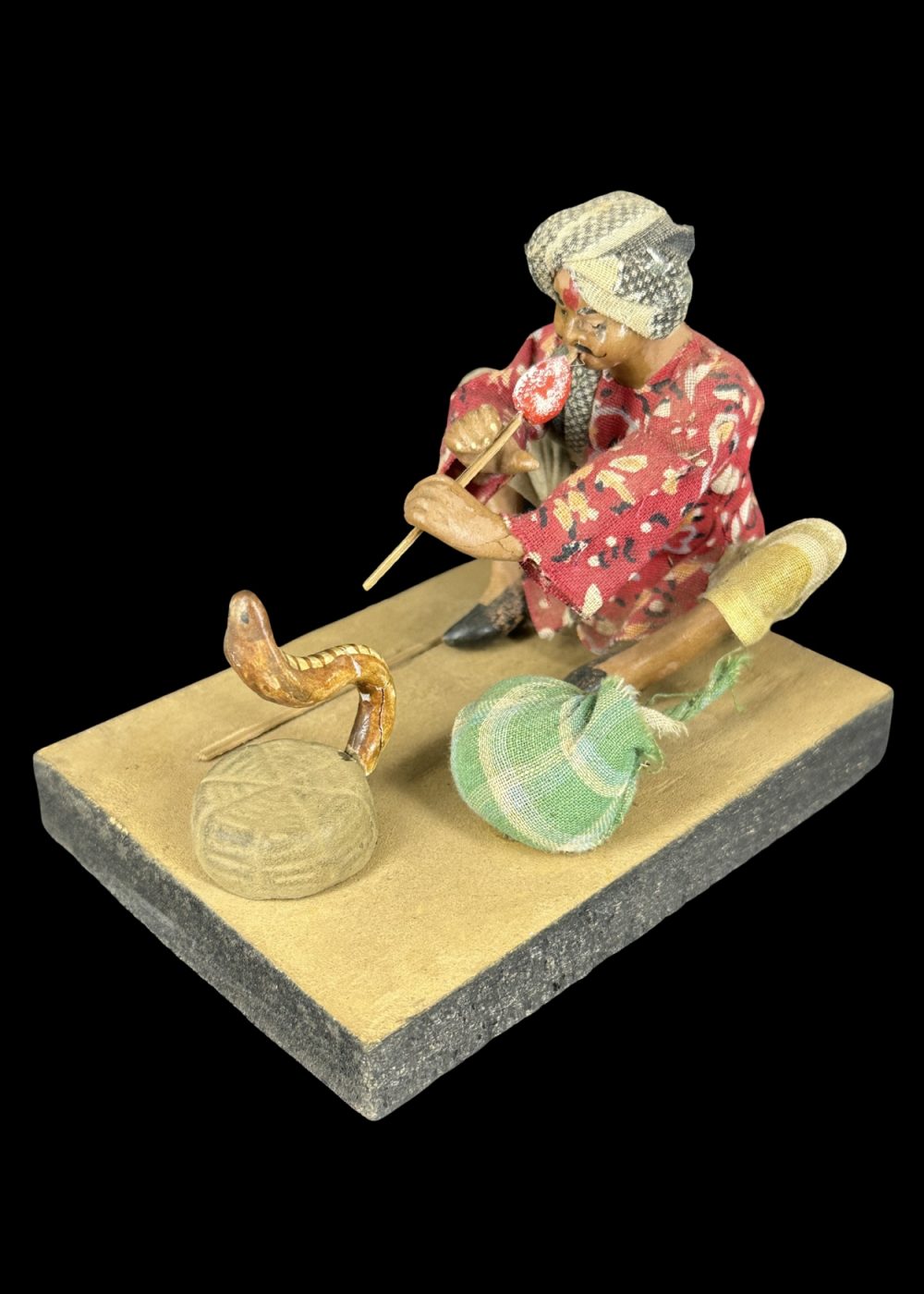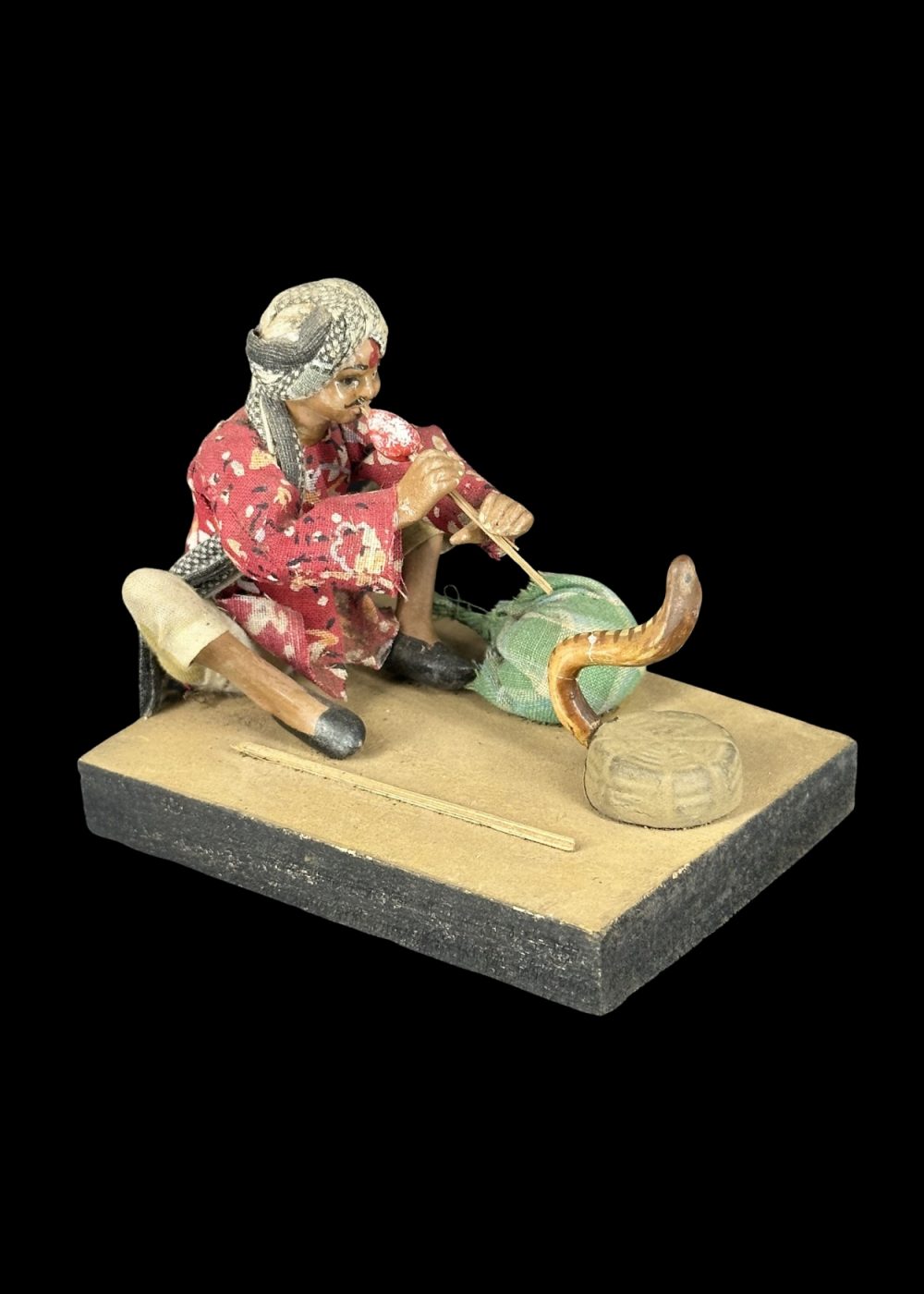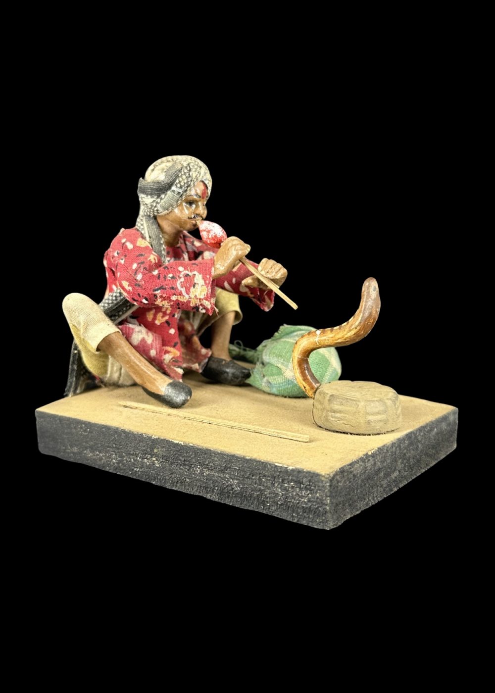Celebrate the charm of India’s traditional street performers with this exquisite handcrafted clay figurine of a snake charmer, made in the distinctive 18th–19th century style of Krishnanagar, West Bengal. Dressed in vibrant hand-stitched fabric and posed with a pungi (flute) and a coiled basket, this figure reflects the lifelike artistry for which Krishnanagar is renowned. A perfect collectible that brings a slice of Indian folk life to your home or art collection.