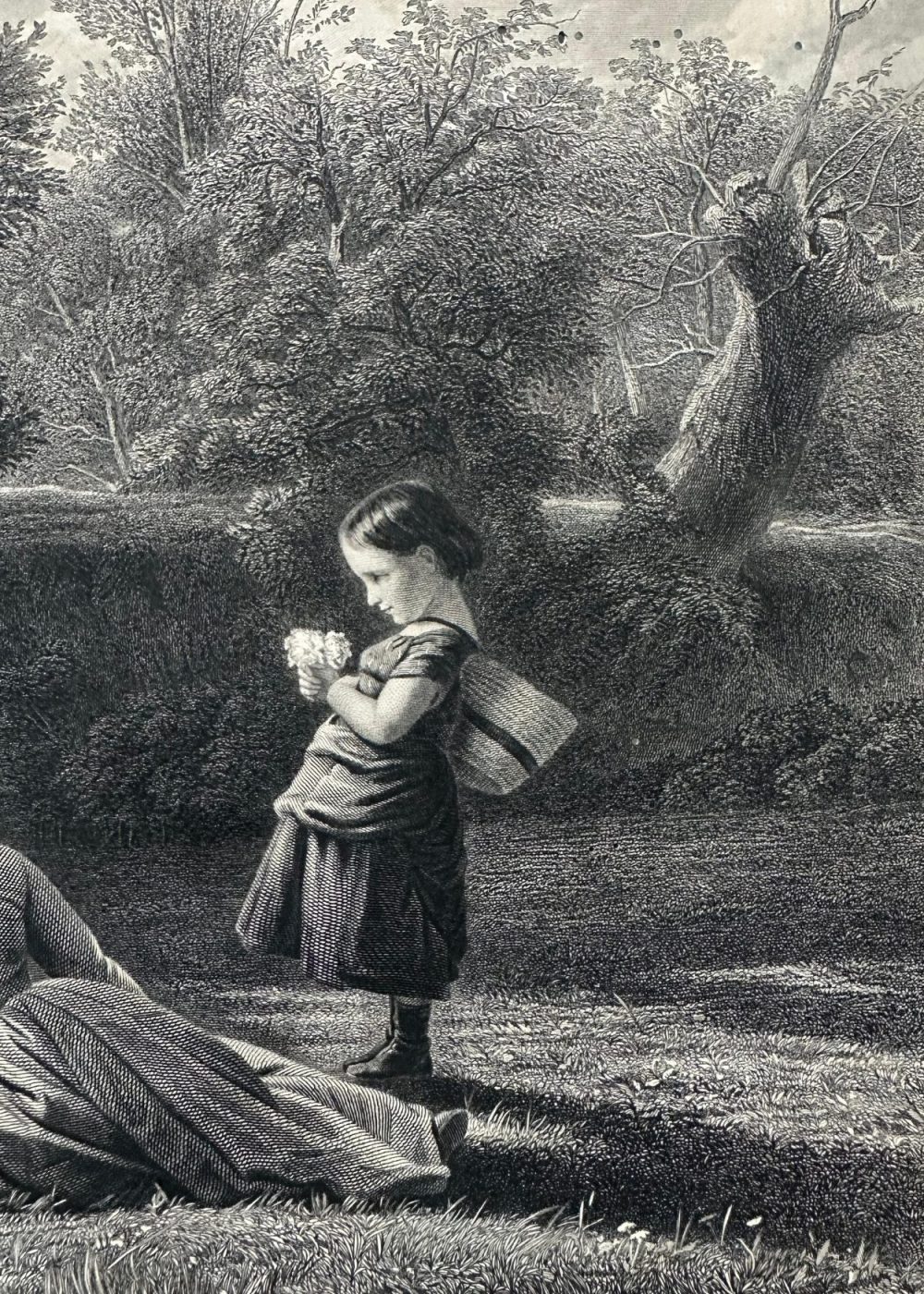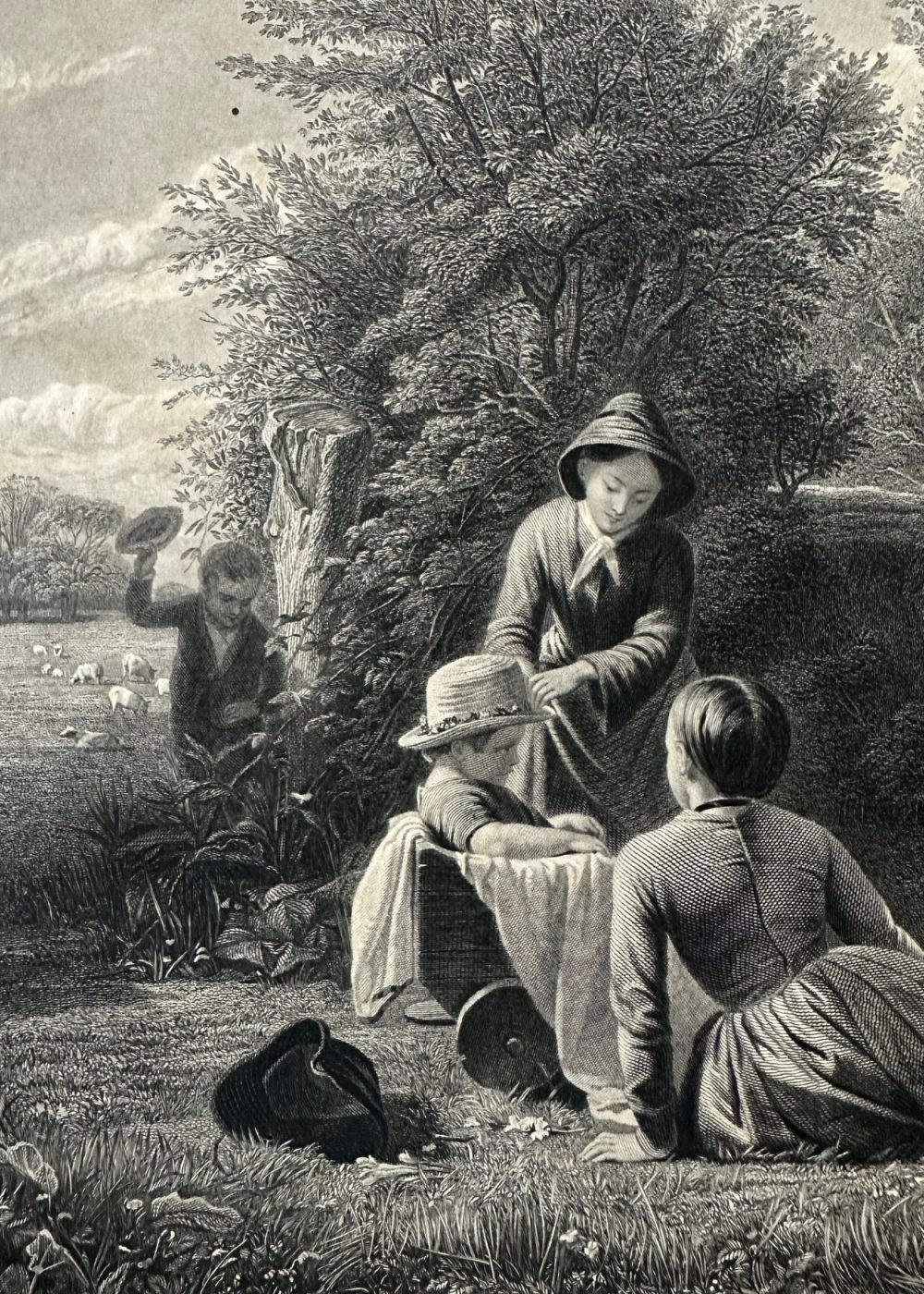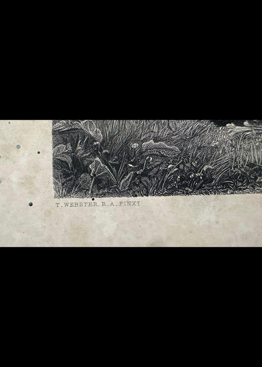 Thomas Webster’s Shelling, delicately engraved by Pierre Pelee, captures a tranquil rural moment that reflects the simplicity and harmony of pastoral life in the 19th century. Set against a peaceful wooded backdrop, the scene features a small group of women and a child engaged in the humble task of shelling peas outdoors. In the foreground, one woman reclines on the grass with her back to the viewer, forming a relaxed triangular composition with the other two women — one seated and the other standing, focused on their shared chore. A young girl, perhaps their daughter or helper, stands nearby holding a small container, watching attentively or offering assistance. Scattered tools and a hat on the ground lend realism and spontaneity to the moment. The lush countryside, with sheep grazing in the distance and a man partially visible behind a tree, enhances the pastoral serenity of the image. Light and shadow are used to soft effect, conveying warmth, community, and a rhythm of life attuned to nature’s pace. Shelling is a fine example of Webster’s ability to elevate everyday domestic scenes into art filled with grace and sentiment. It celebrates rural labor not as drudgery, but as an intimate and collaborative act, full of quiet dignity.